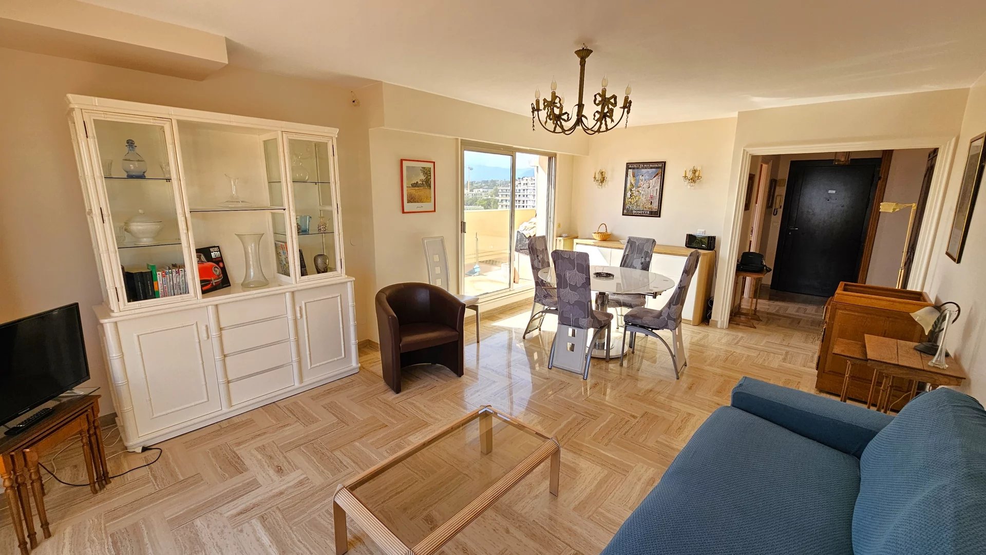Entrée donnant sur un grand séjour ensoleillé avec coin repas, ouvrant sur la terrasse avec une vue à couper le souffle