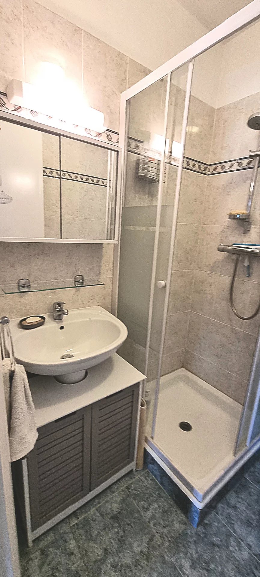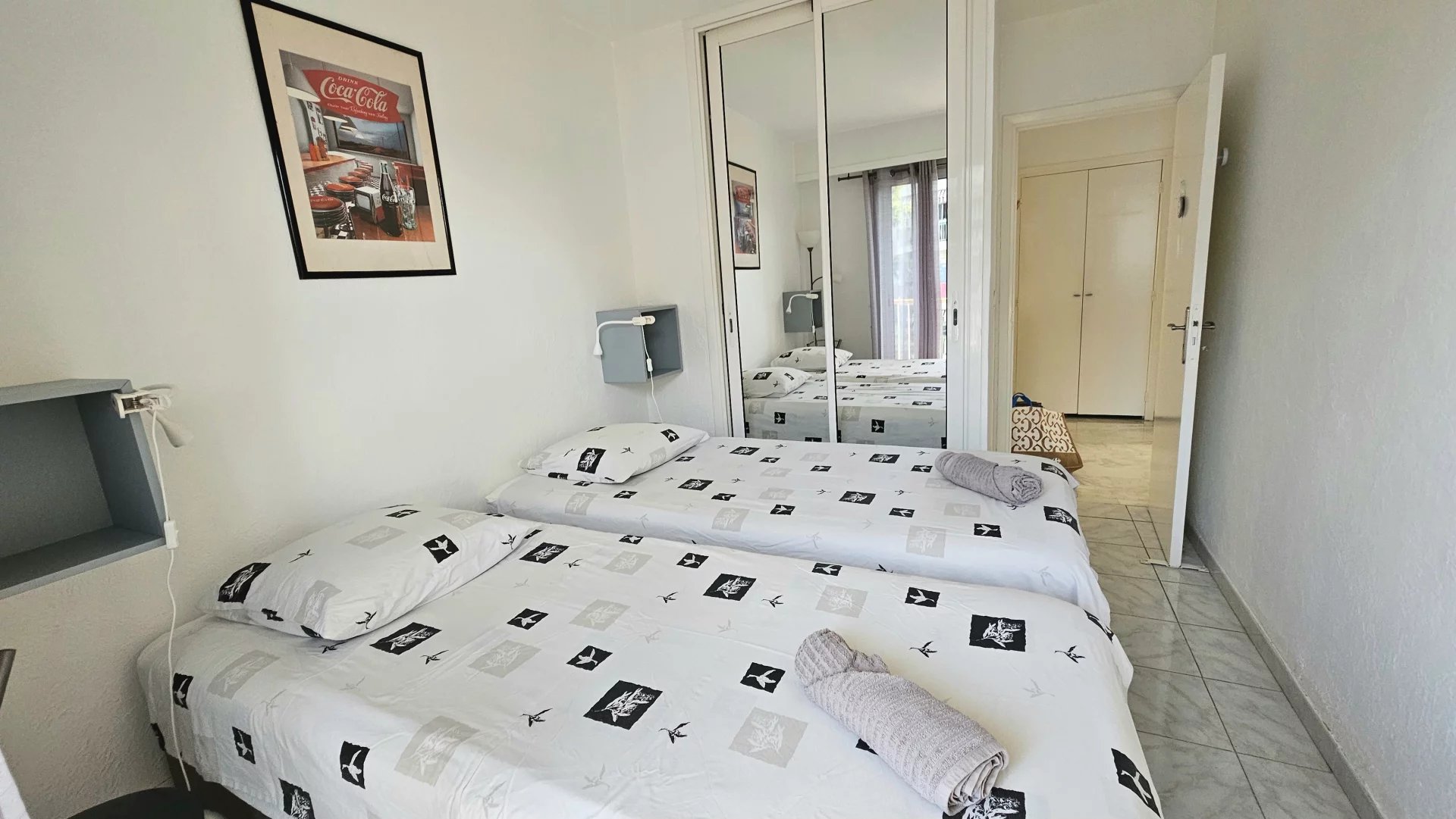Chambre 2 : Deux lits simples (90×200 cm), rangements, salle de douche attenante.