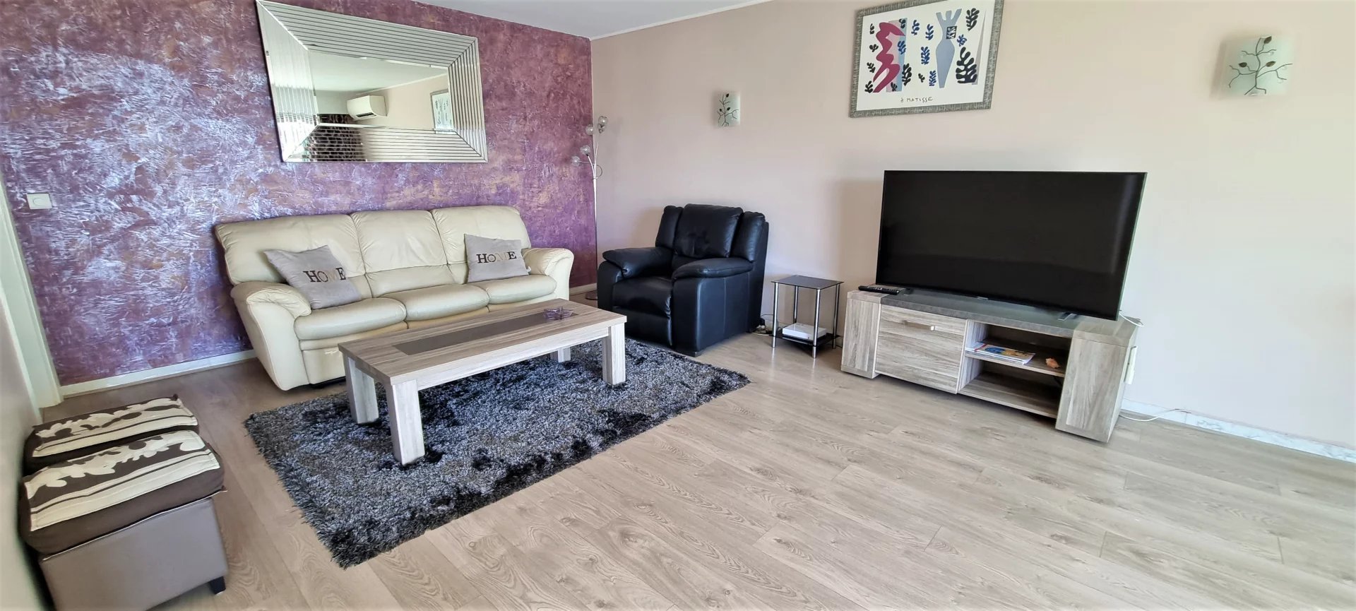 Séjour lumineux de 50 m² avec salle à manger (table pour 6 personnes), ouvrant sur une grande terrasse exposée sud avec vue dégagée sur la mer, à l’écart de la route pour plus de tranquillité.