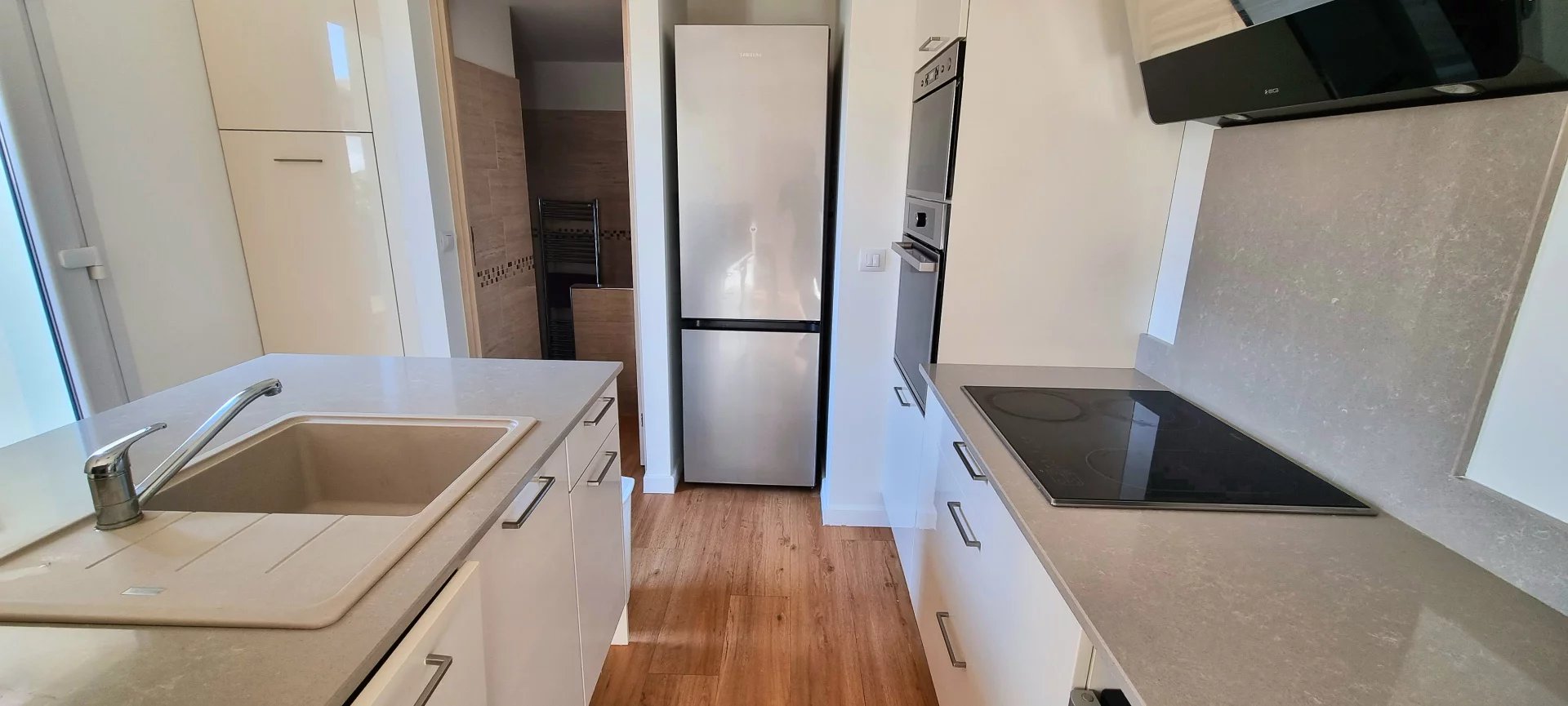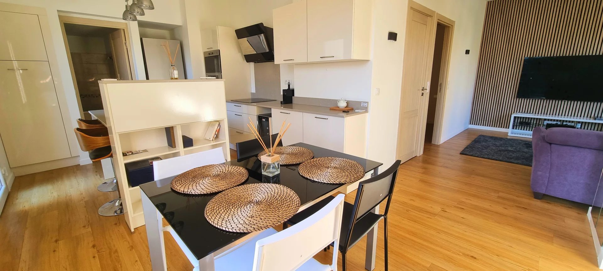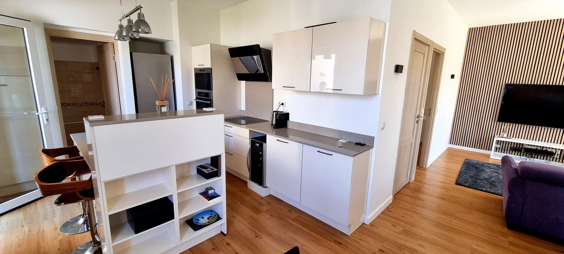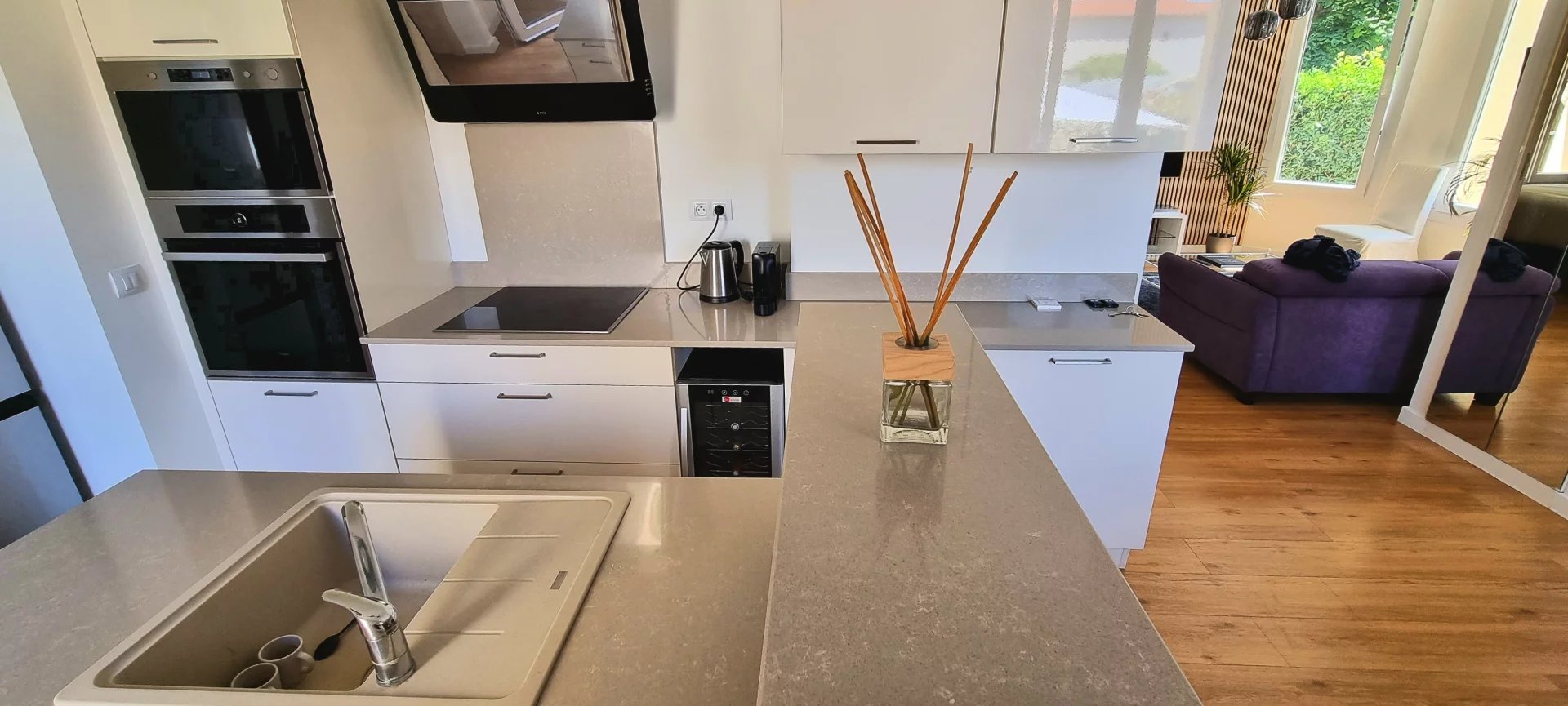 4 marches mènent à un espace de vie lumineux comprenant un salon ouvert, une salle à manger et une cuisine entièrement équipée avec îlot central