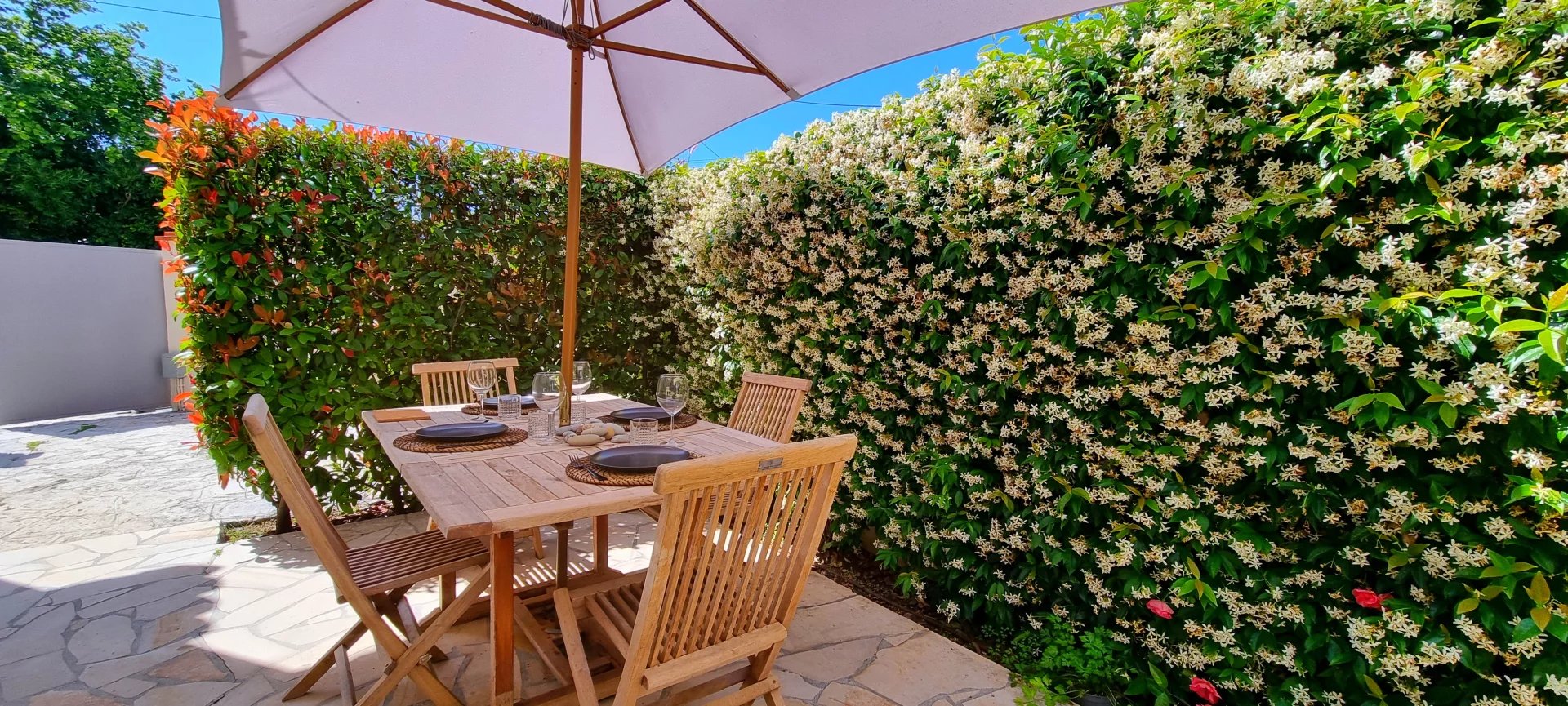 ✔ Jolie terrasse d’été avec barbecue, idéale pour des repas en famille en extérieur