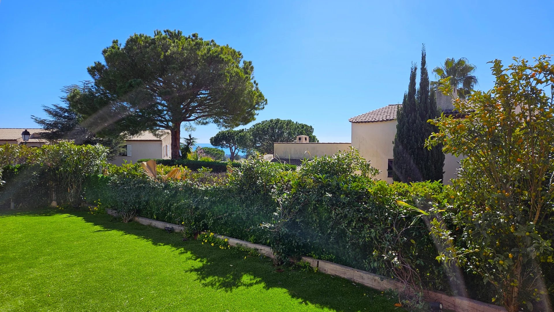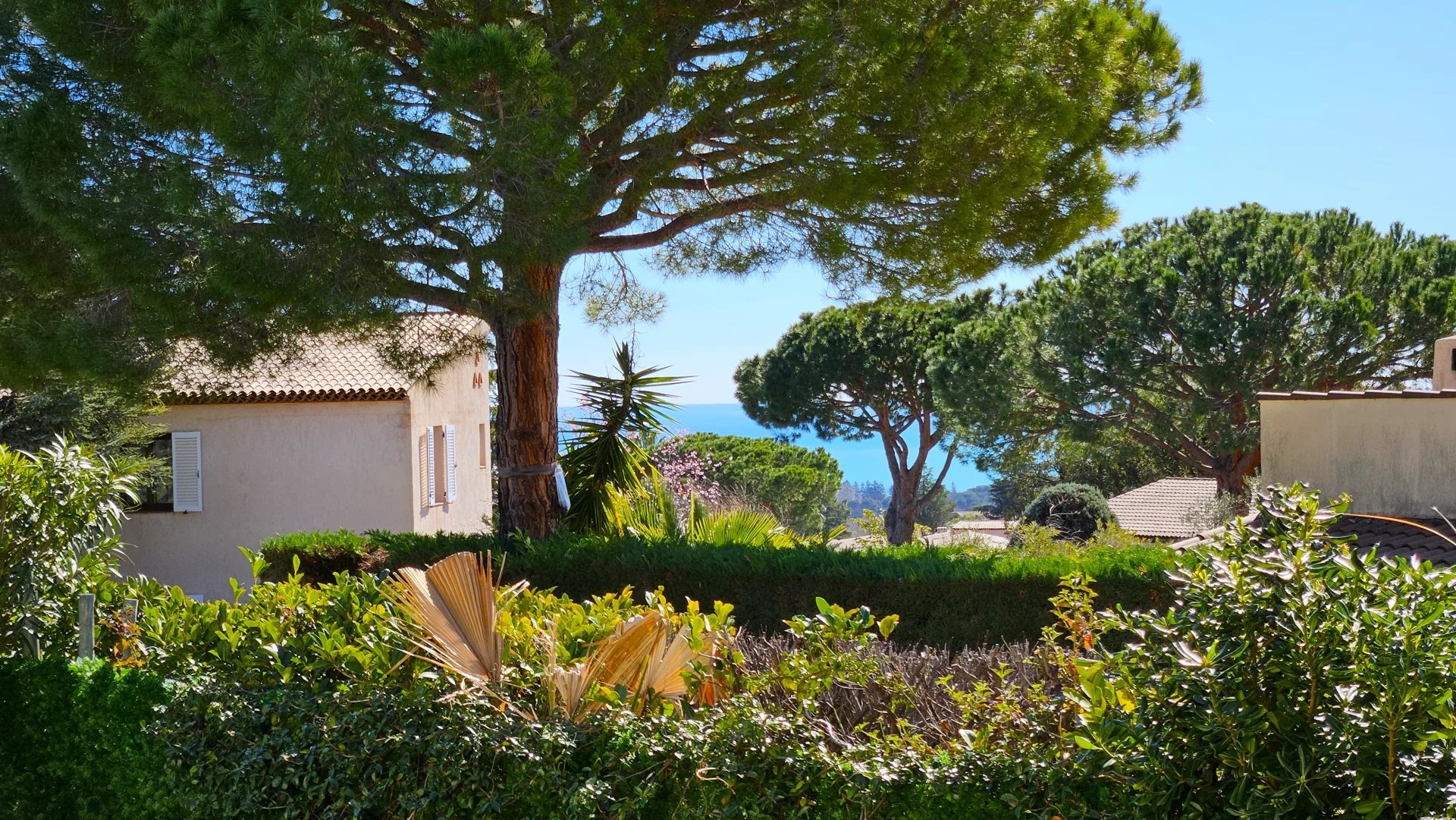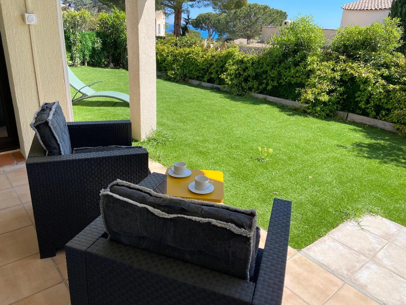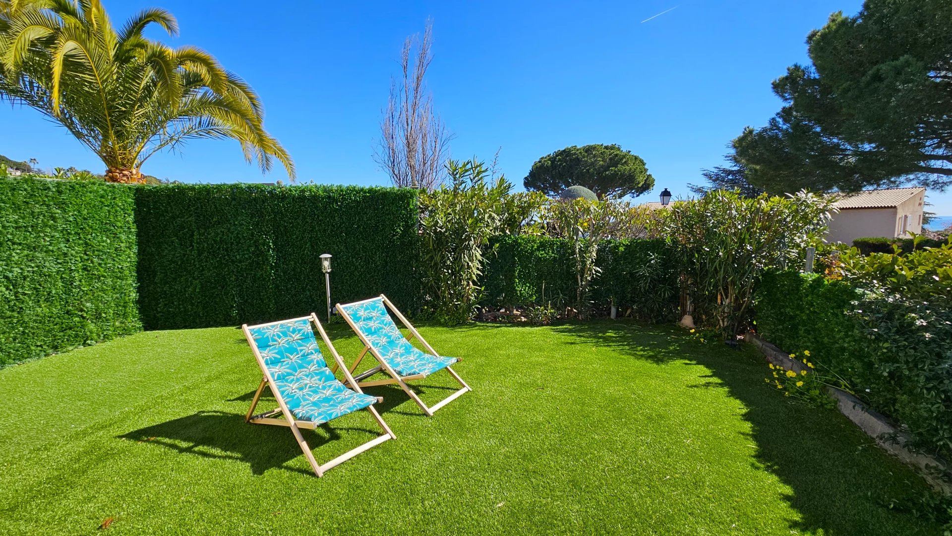 ☀️ Grande terrasse de 20 m² exposée plein sud, prolongée par un jardin privé avec vue mer partielle.