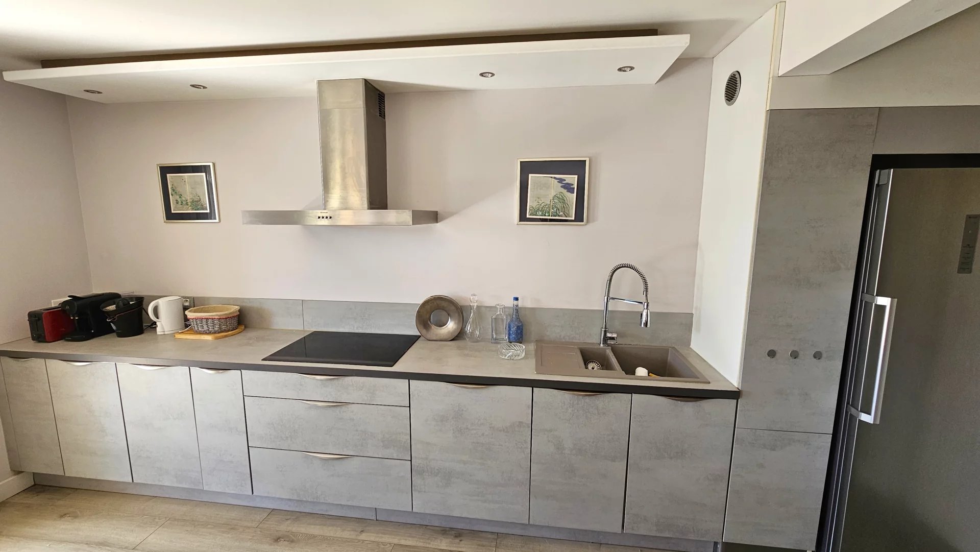 🌿 Séjour lumineux ouvert sur une cuisine entièrement équipée.