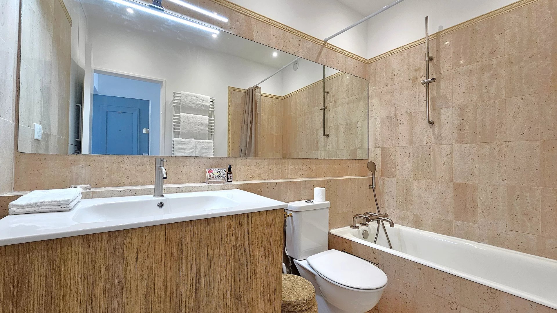Une salle de bain raffinée, moderne et fonctionnelle, avec WC, également refaite à neuf.