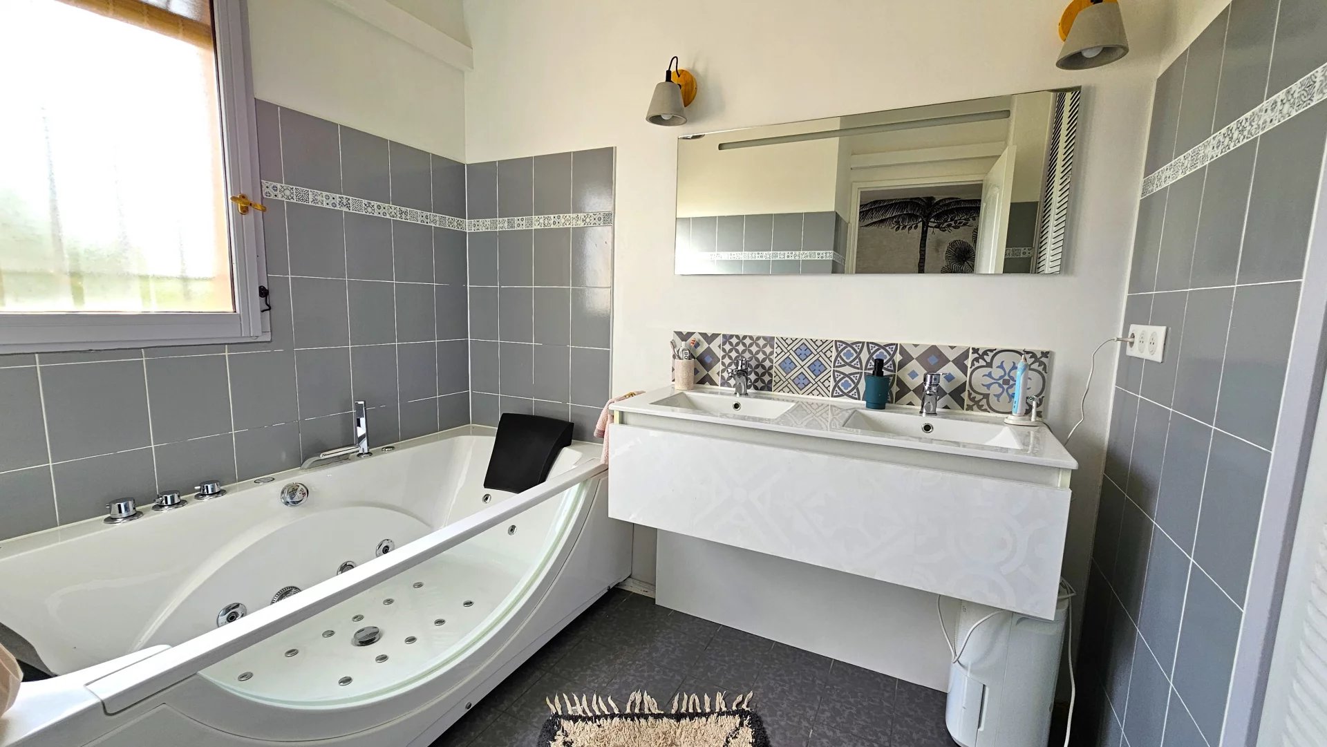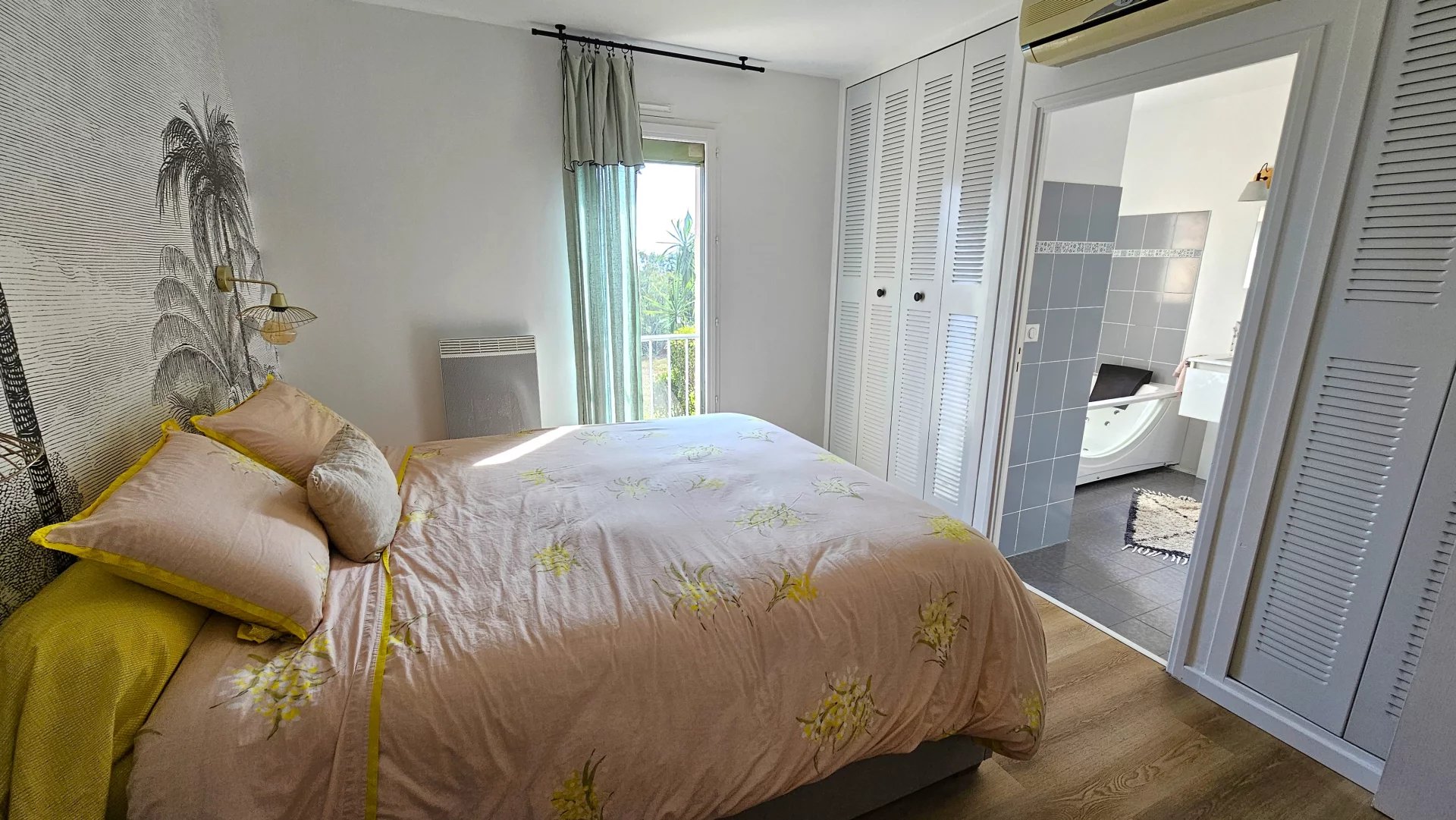 Une première chambre avec vue mer et sa salle de bain attenante avec baignoire balnéo.