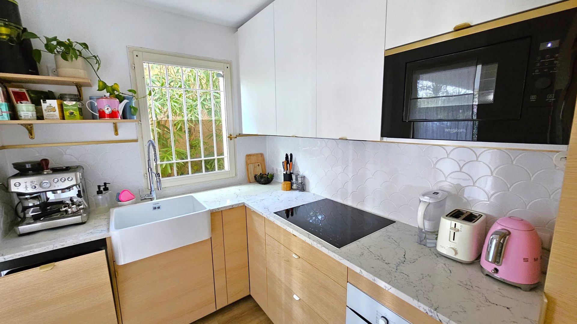 Cuisine semi-ouverte neuve (2022 Mobalpa) entièrement équipée, avec plan de travail en pierre, verrière.