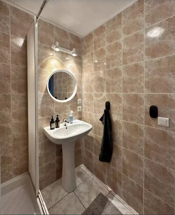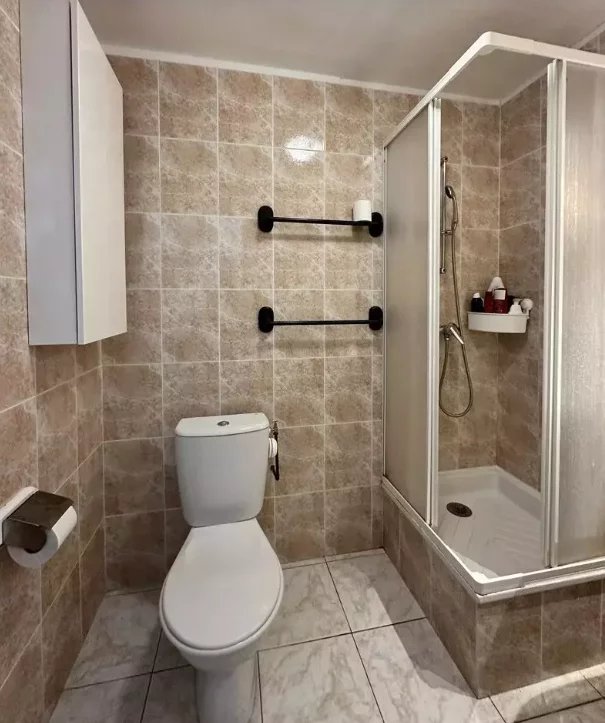 Au rez-de-chaussée, vous êtes invités à entrer dans un hall d'entrée avec un coin bureau. Il y a une salle d'eau moderne avec douche, lavabo et WC, ainsi qu'une cave de rangement très pratique.