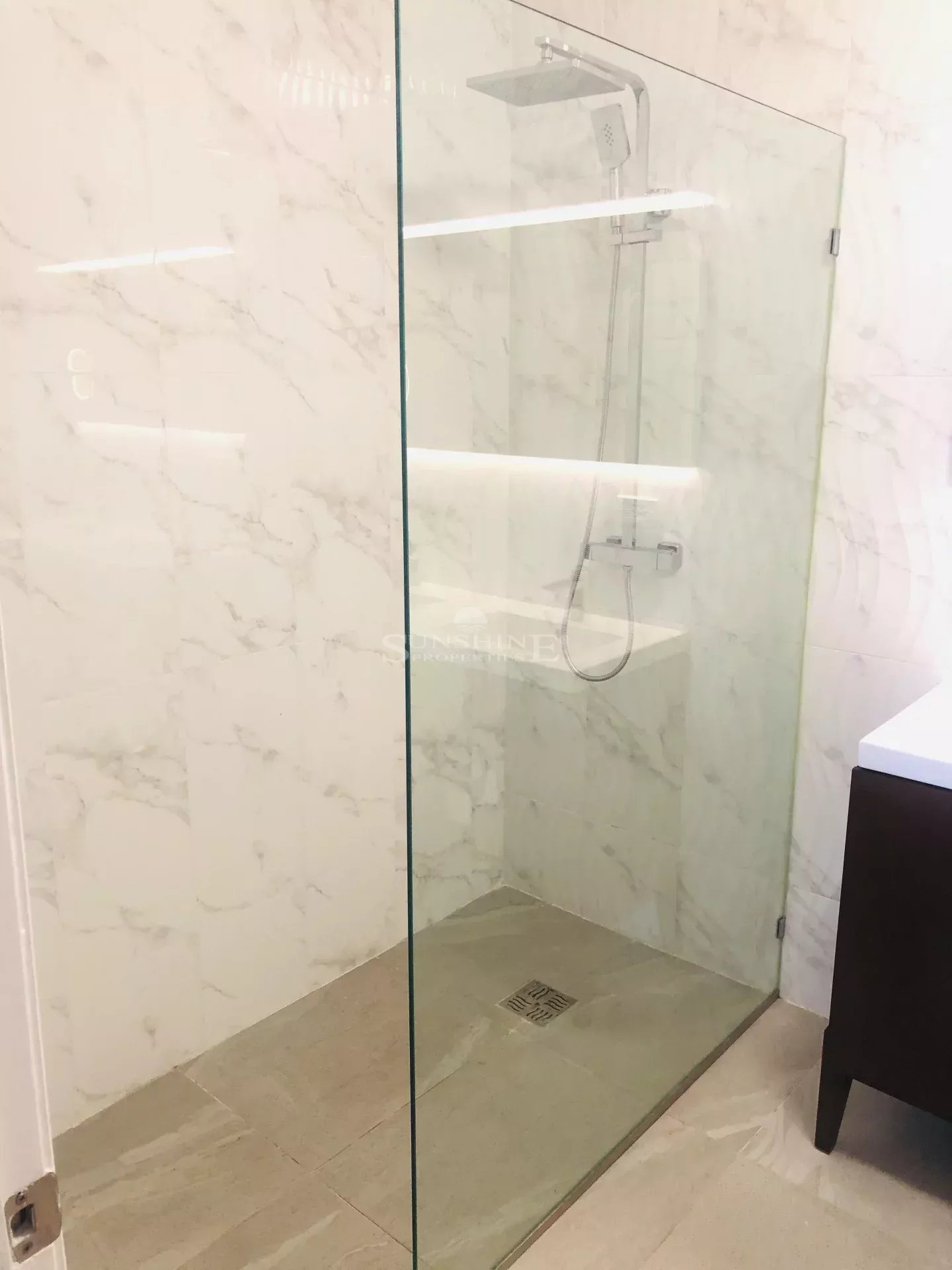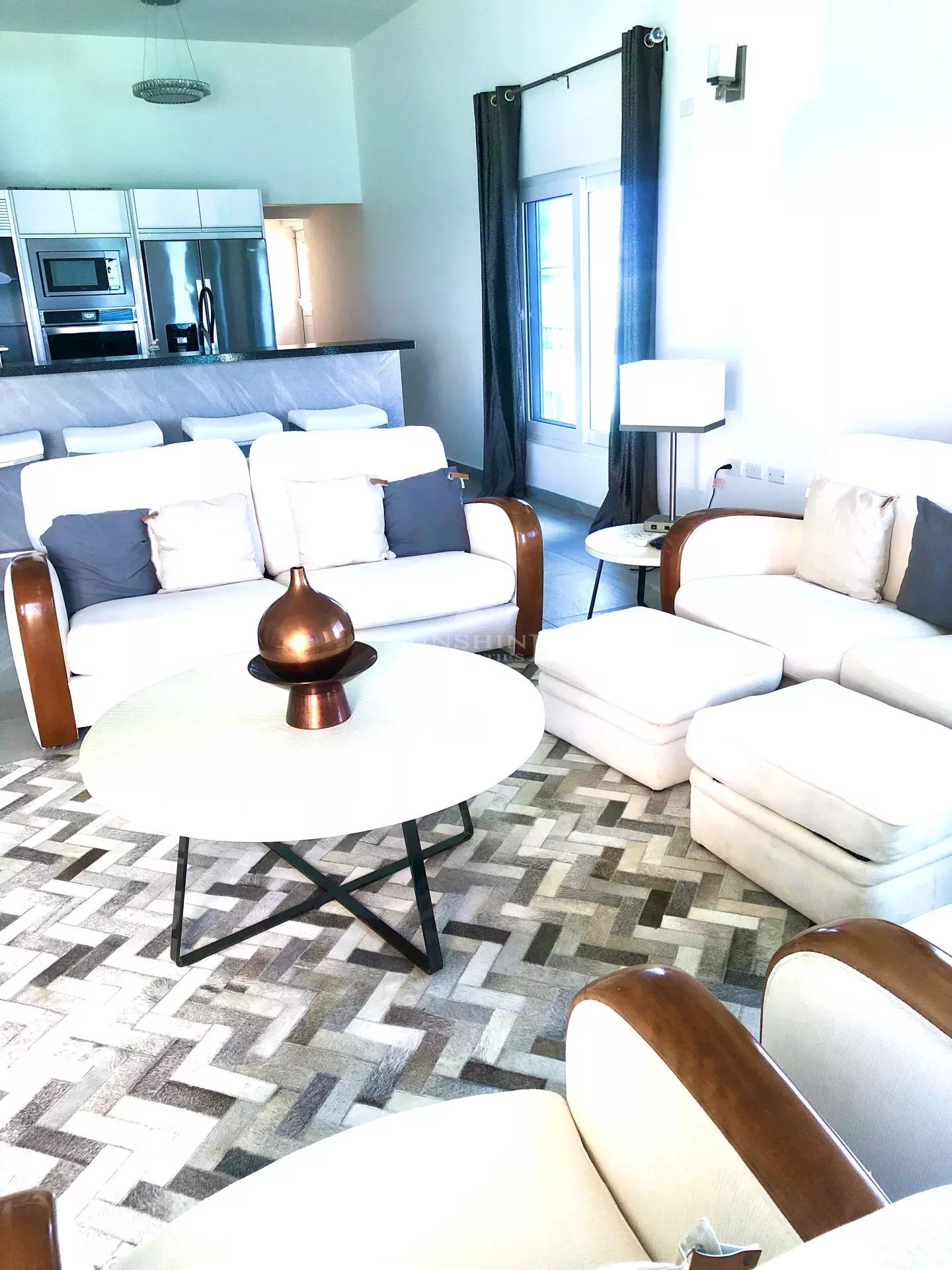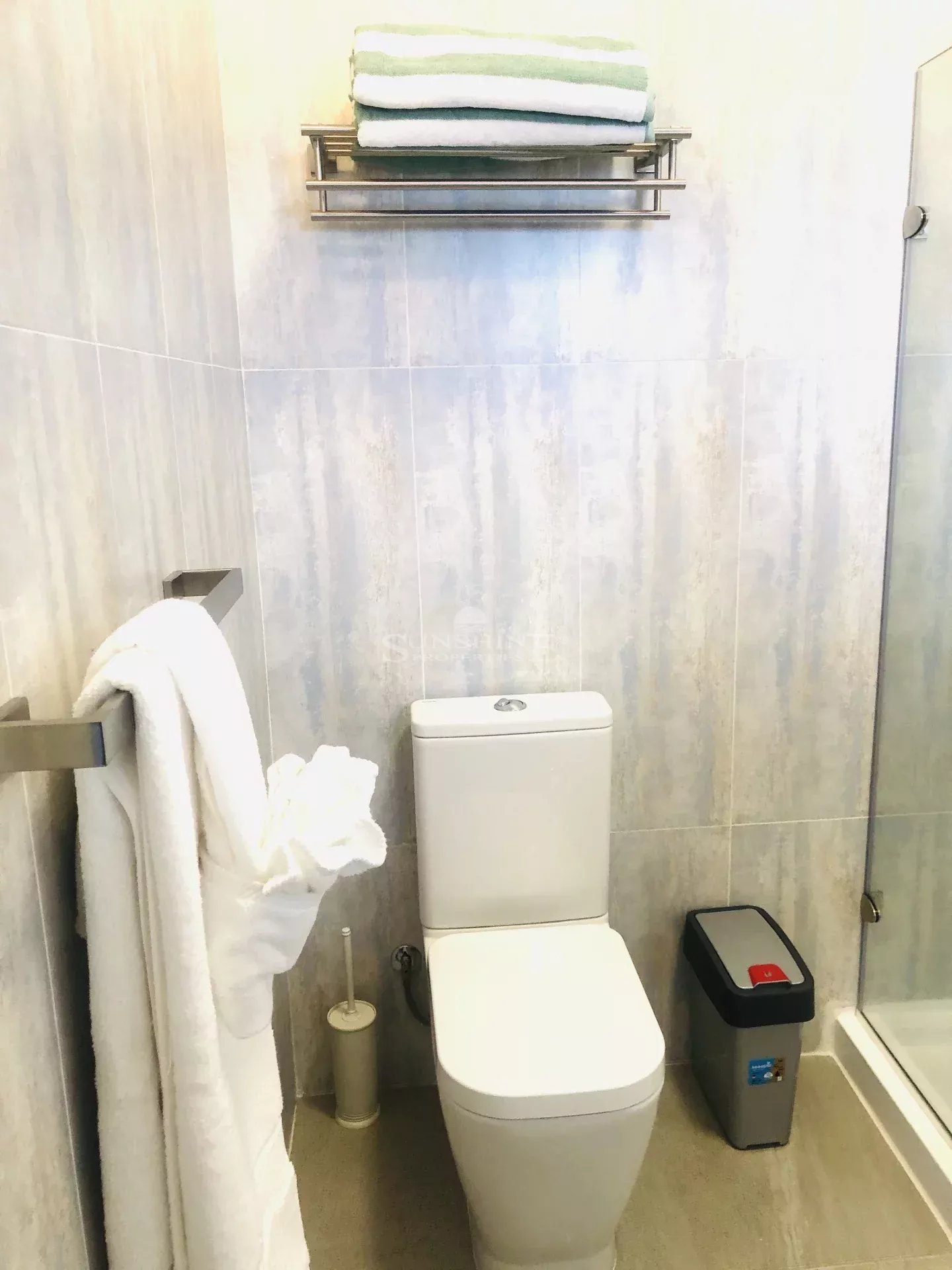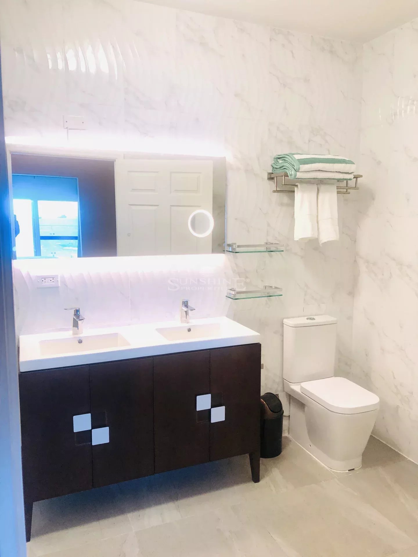 Les trois chambres de taille égale sont à l’entrée principale ; chacune avec une terrasse privée, de beaux placards intégrés, et une élégante salle de bains de style spa avec des douches à l’italienne. Le décor est chic et élégant. Le salon de séjour principal s’ouvre sur la grande terrasse remplie de sièges confortables pour regarder le coucher de soleil sur la plage. Vous regardez sur les toits et sur la mer et le ciel bleu brillant. Ce penthouse est vraiment une oasis privée. D’un côté se trouve la chambre principale, élégante et spacieuse avec une salle de bains de style spa, dans des blancs et des crèmes sereins. La terrasse privée élargit votre vue. Vous pouvez presque toucher le ciel de la terrasse super-isolée.