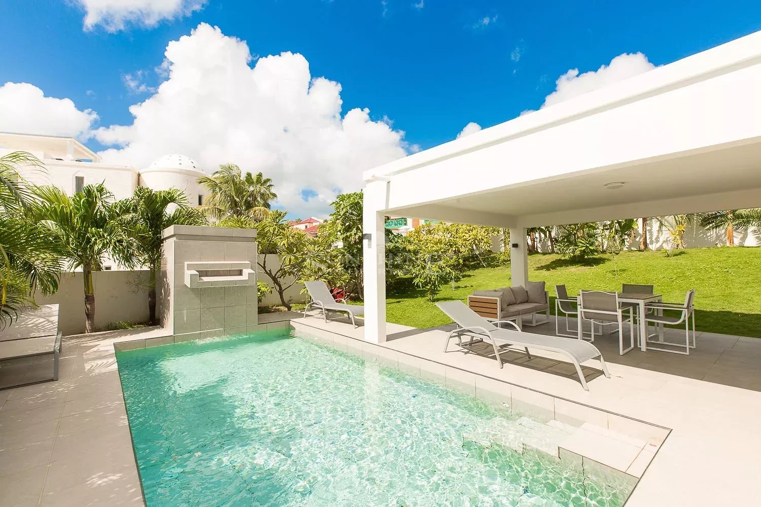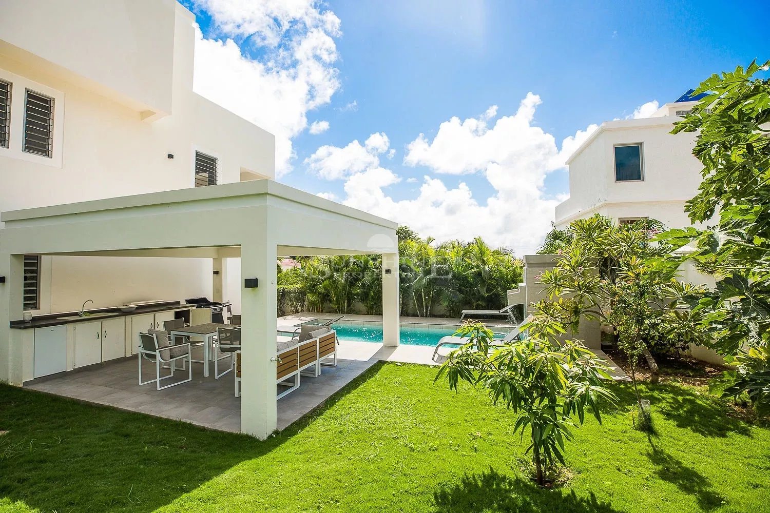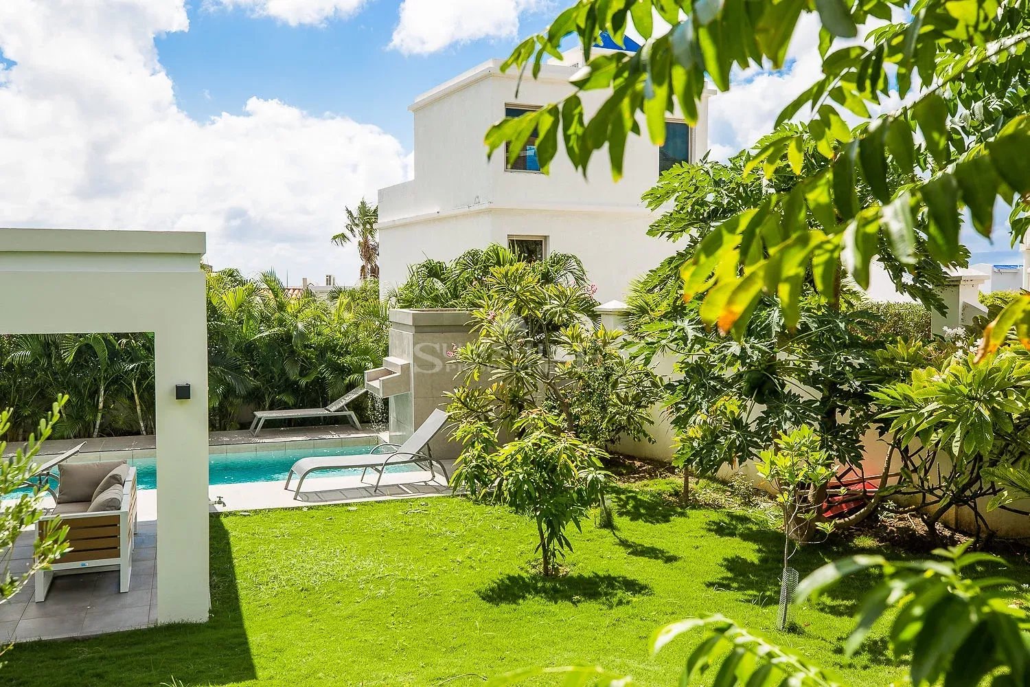 Villa Frangipani à Pelican Key est entourée d'un jardin tropical avec des fleurs et des arbres fruitiers, une grande piscine et un gazebo avec une cuisine barbecue pour les repas en plein air.