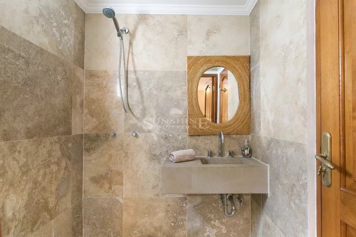 Le plafond en bois donne différentes atmosphères lumineuses. Également à ce niveau se trouve la salle à manger intérieure pouvant accueillir jusqu’à 12 personnes autour d’une belle table en bois et de la cuisine italienne entièrement équipée.