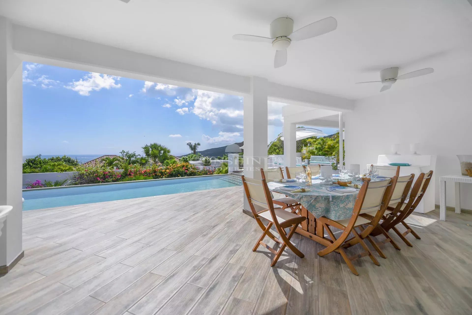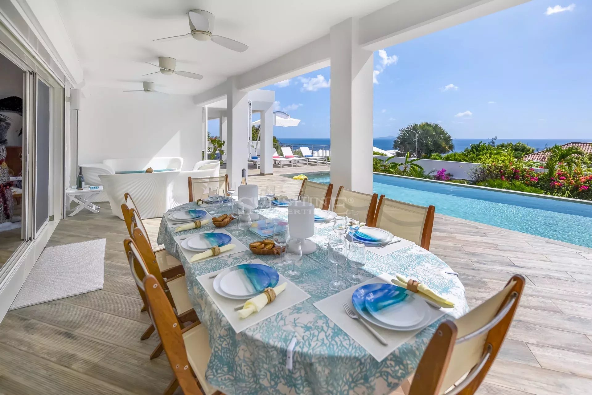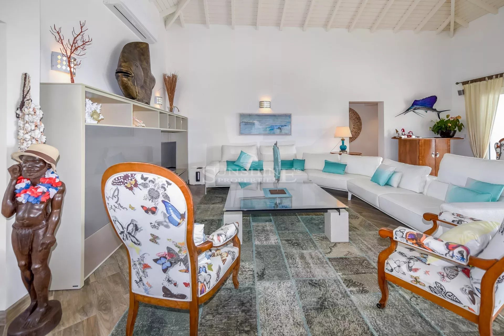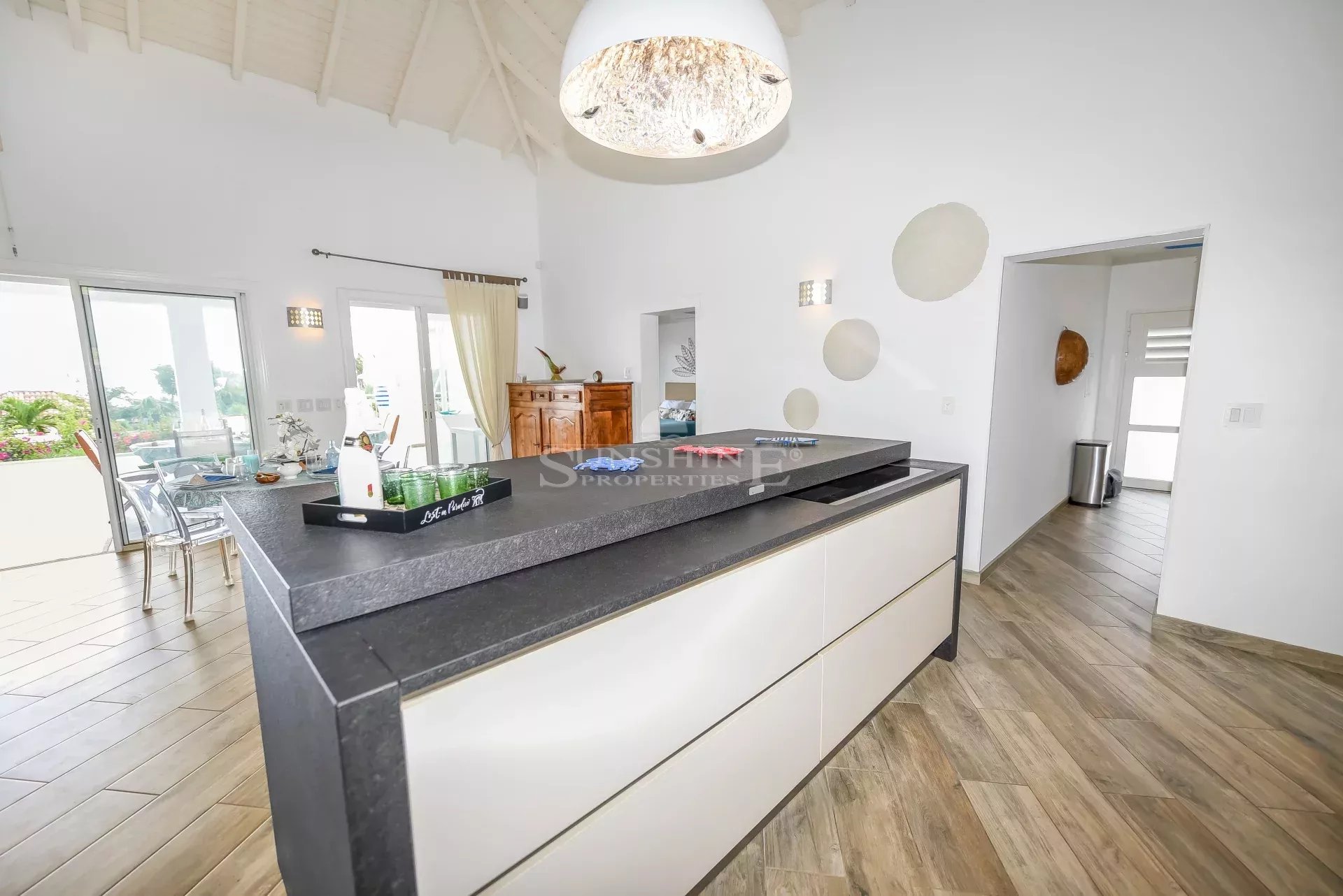 Décorée avec élégance, cette villa jouit de la sérénité et offre une vue imprenable sur l'océan. Elle dispose d'une grande terrasse et offre des vues imprenables sur l'océan jusqu'à Saint-Barthélemy.