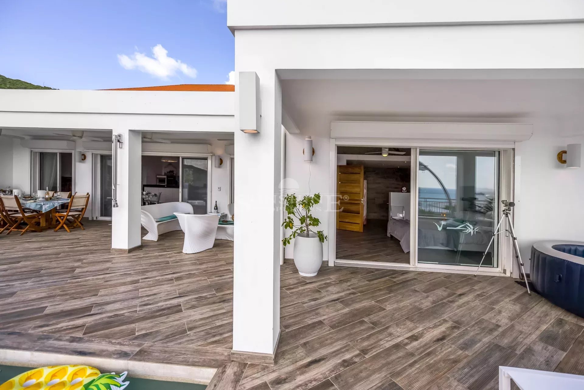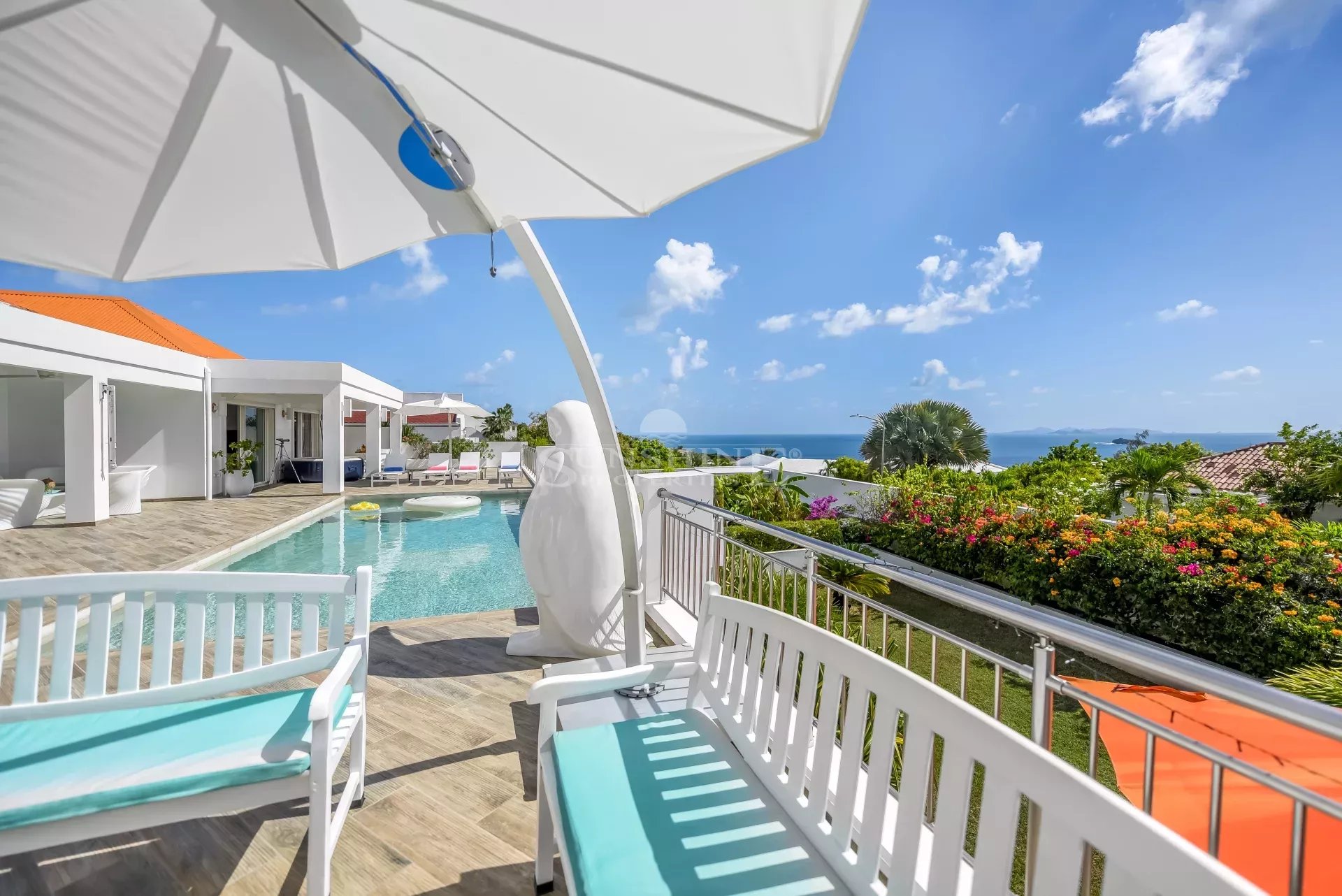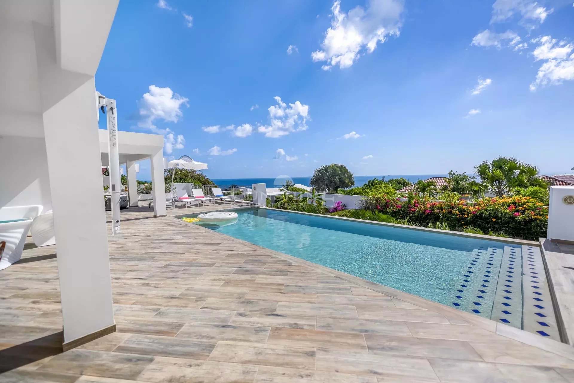 Décorée avec élégance, cette villa jouit de la sérénité et offre une vue imprenable sur l'océan. Elle dispose d'une grande terrasse et offre des vues imprenables sur l'océan jusqu'à Saint-Barthélemy.