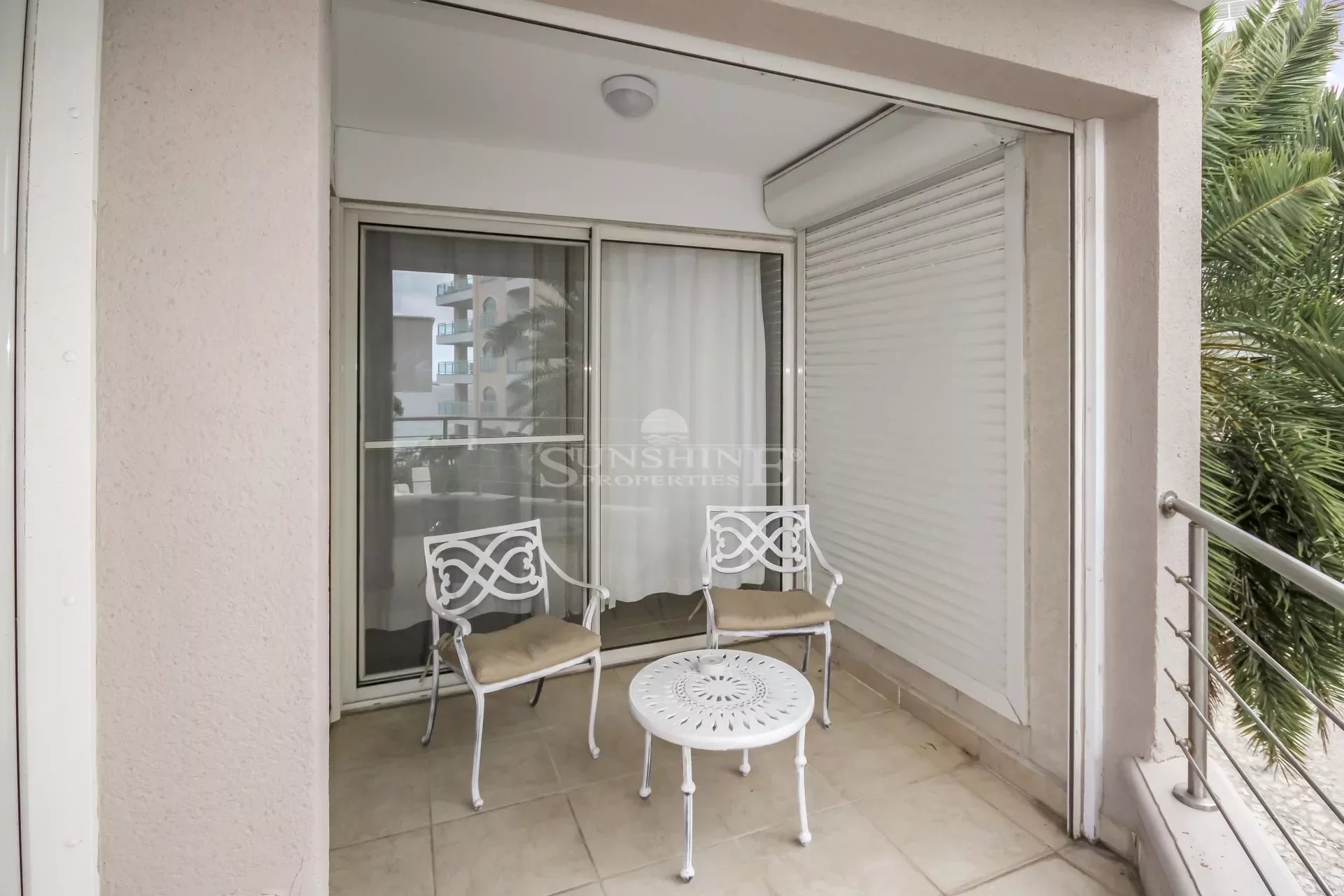 L'intérieur de cet appartement est agréablement meublé avec goût et entièrement équipé. Adjacent au salon, il dispose d'un balcon en angle avec une petite vue sur la mer "entre les bâtiments opposés".
