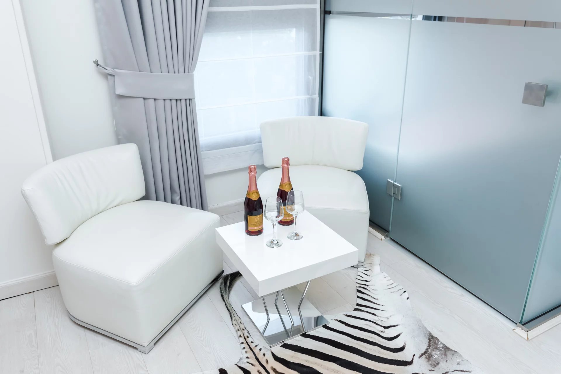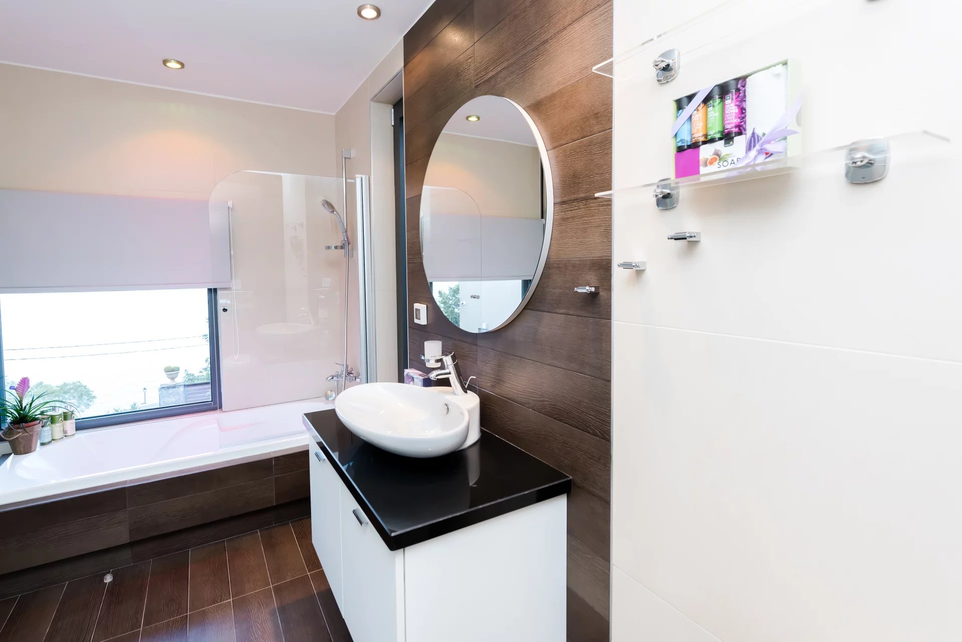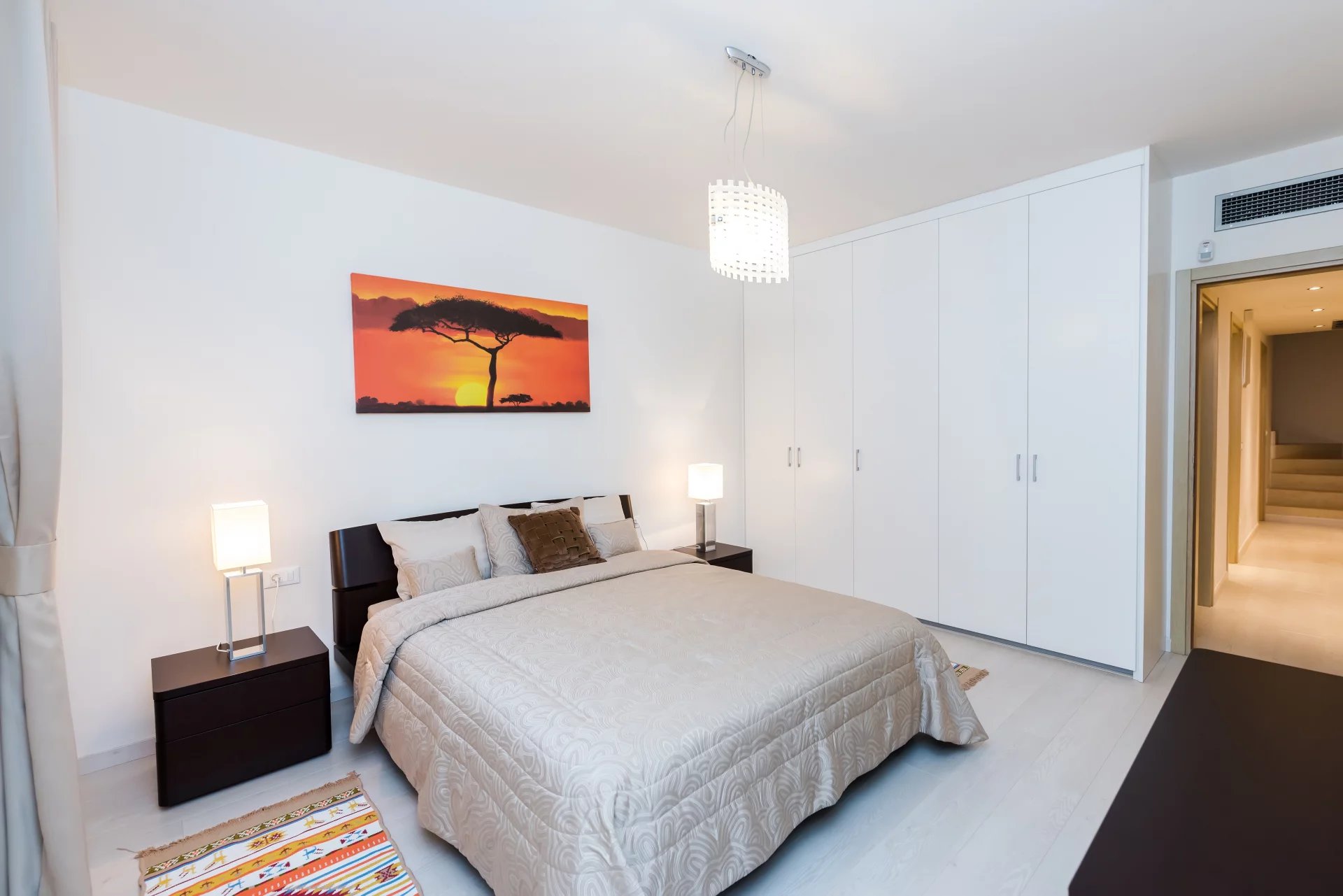 A pied de la plage d'Elunda et du centre ville, villa contemporaine de 174 m² avec un salon équipé d'une cheminée, coin salle à manger, cuisine ouverte équipée, 5 chambres, 3 salle de bains dont une suite avec vue mer, sa salle de bain