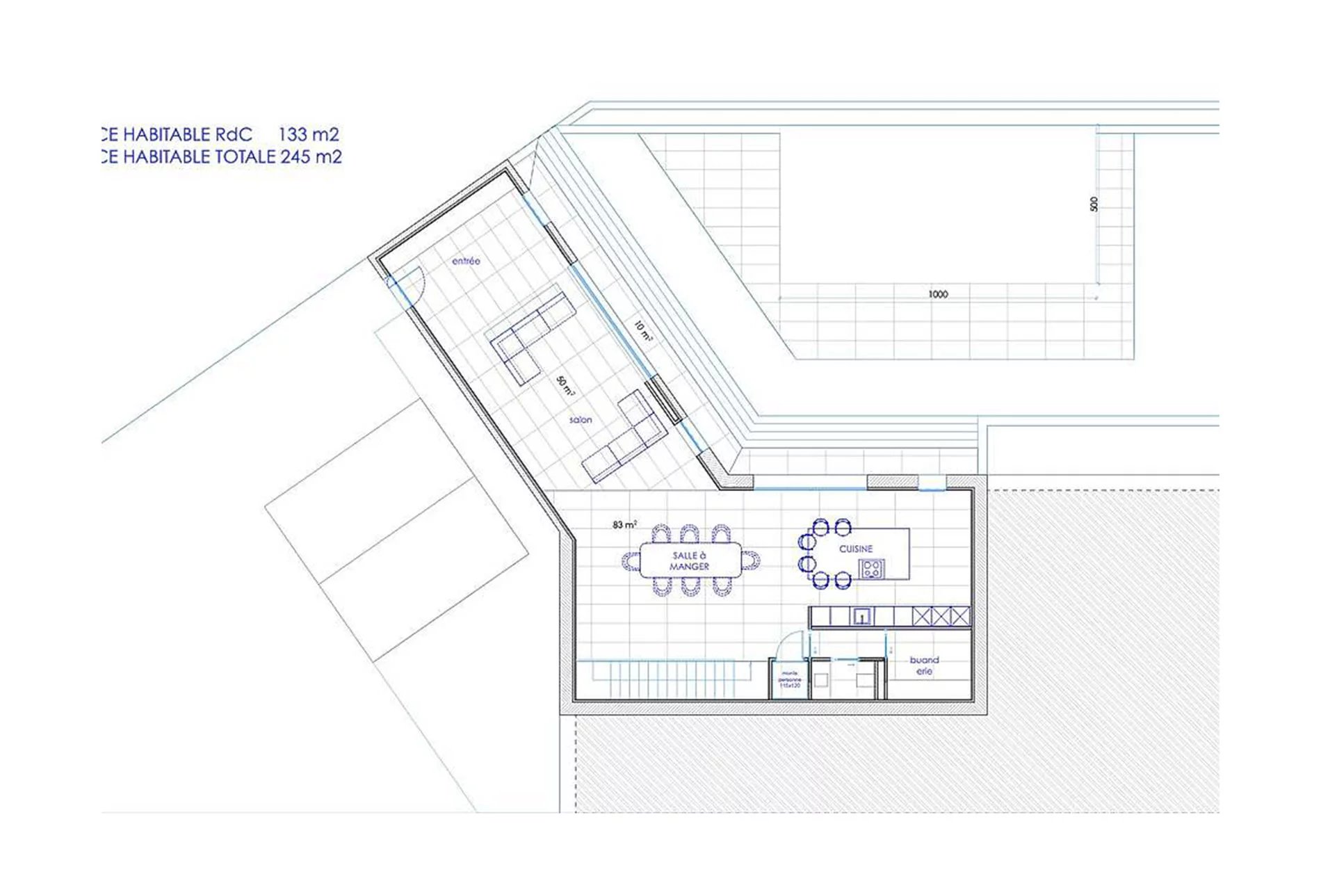 Projet d’une villa sur un terrain de 3601m2 Comporte une villa existante de type Californien d’une quarantaine d’années pour laquelle un permis de construire ou de rénover avec une piscine a été obtenu Les plans du projet villa prévoient un salon tres spacieux, un tres grand coin repas et cuisine ouverte séparée, 4 chambres a l’étage avec leurs salles de bain et dressing