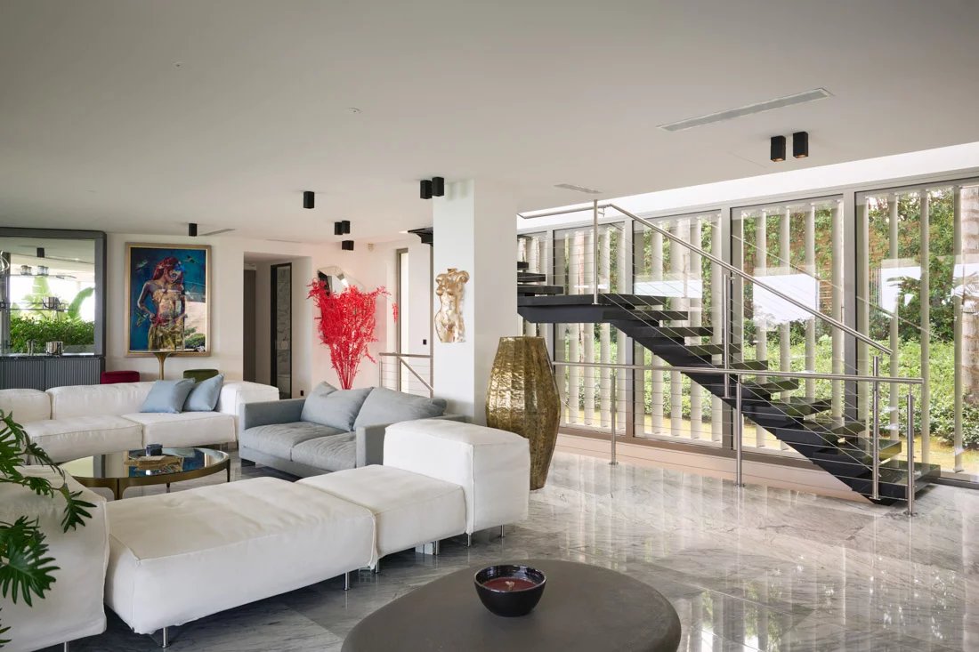 La propriété est répartie sur trois niveaux et comprend un salon spacieux et lumineux, une salle de réception supplémentaire avec un bar qui s'ouvre sur le jardin, 6 chambres, dont une suite parentale, chacune avec son propre dressing, 4 salles d'eau, 2 salles de bains, une buanderie et un local technique.