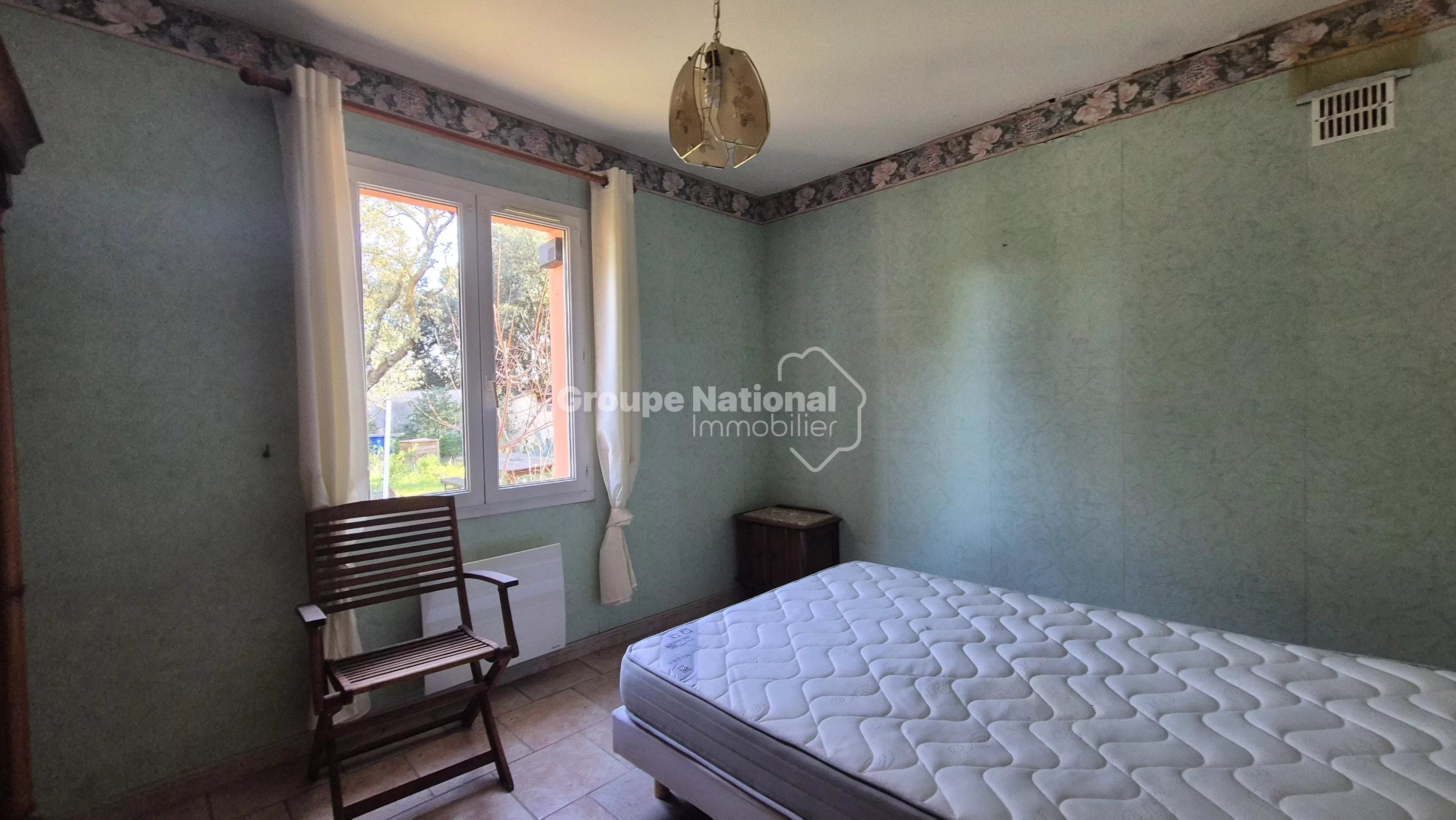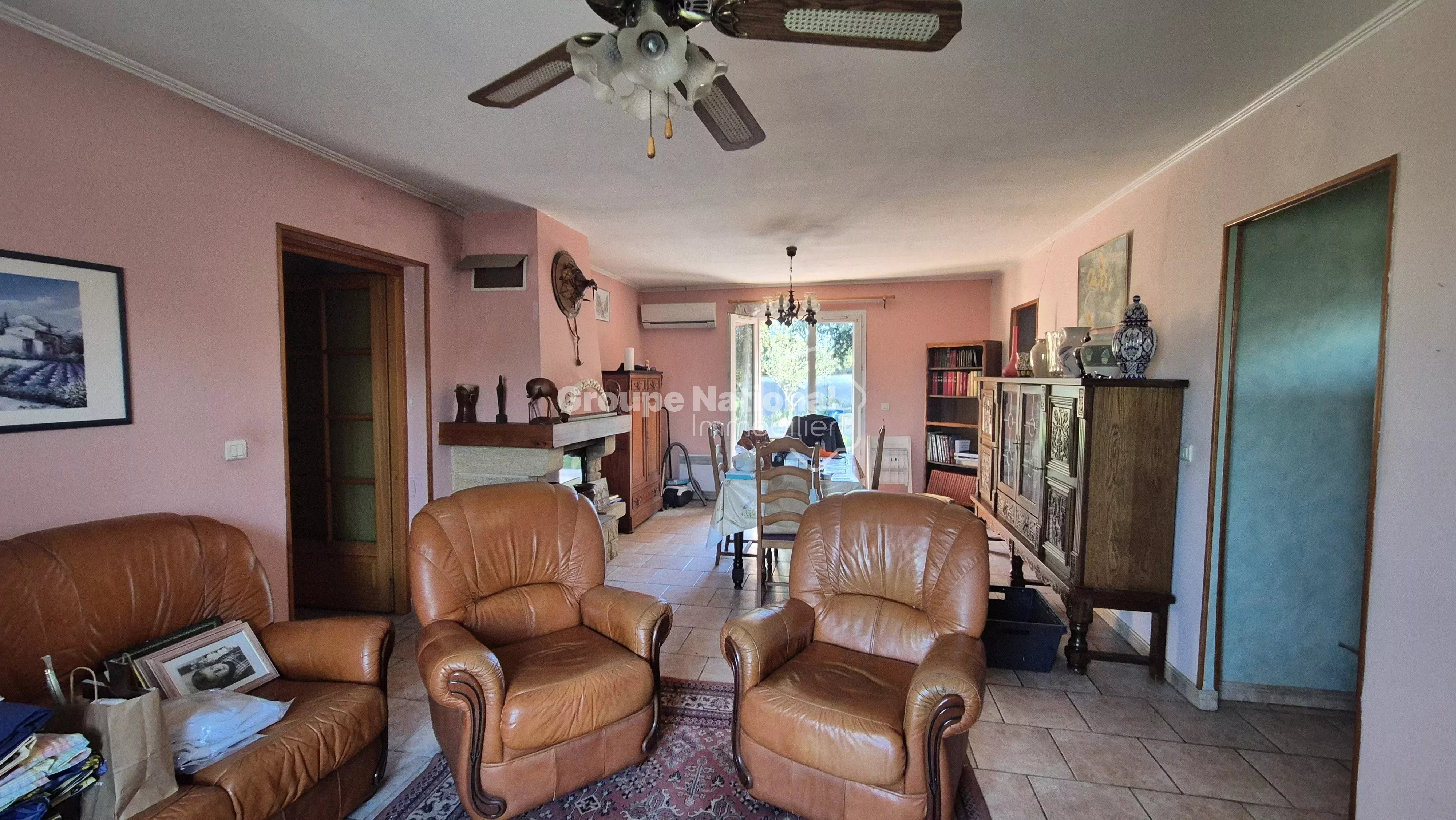 En fond d'impasse villa de plain pied de 90 m² sur 600 m² de terrain clos et arboré. Comprenant : séjour, Cuisine, 3 chambres, salle d'eau, WC. Garage. Jardin clos et arboré, en fond d'impasse. Route de Châteauneuf-du-Pape.