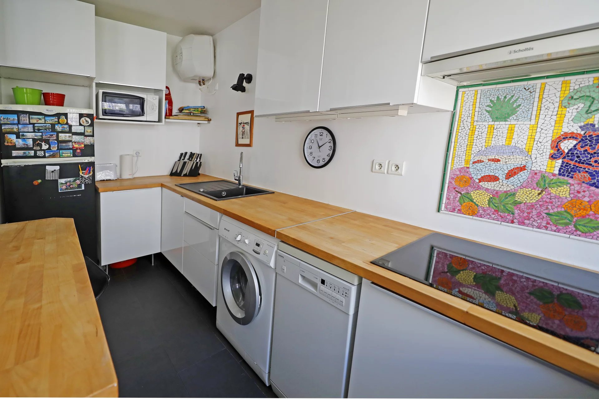 La visite révèle un appartement lumineux, composé d'un séjour de 32m², d'une cuisine séparée par une verrière, d'une chambre, d'une salle de bain et de WC séparés. L'appartement présente de beaux atouts : parquet massif, double vitrage, verrière authentique, volumes distinctifs.