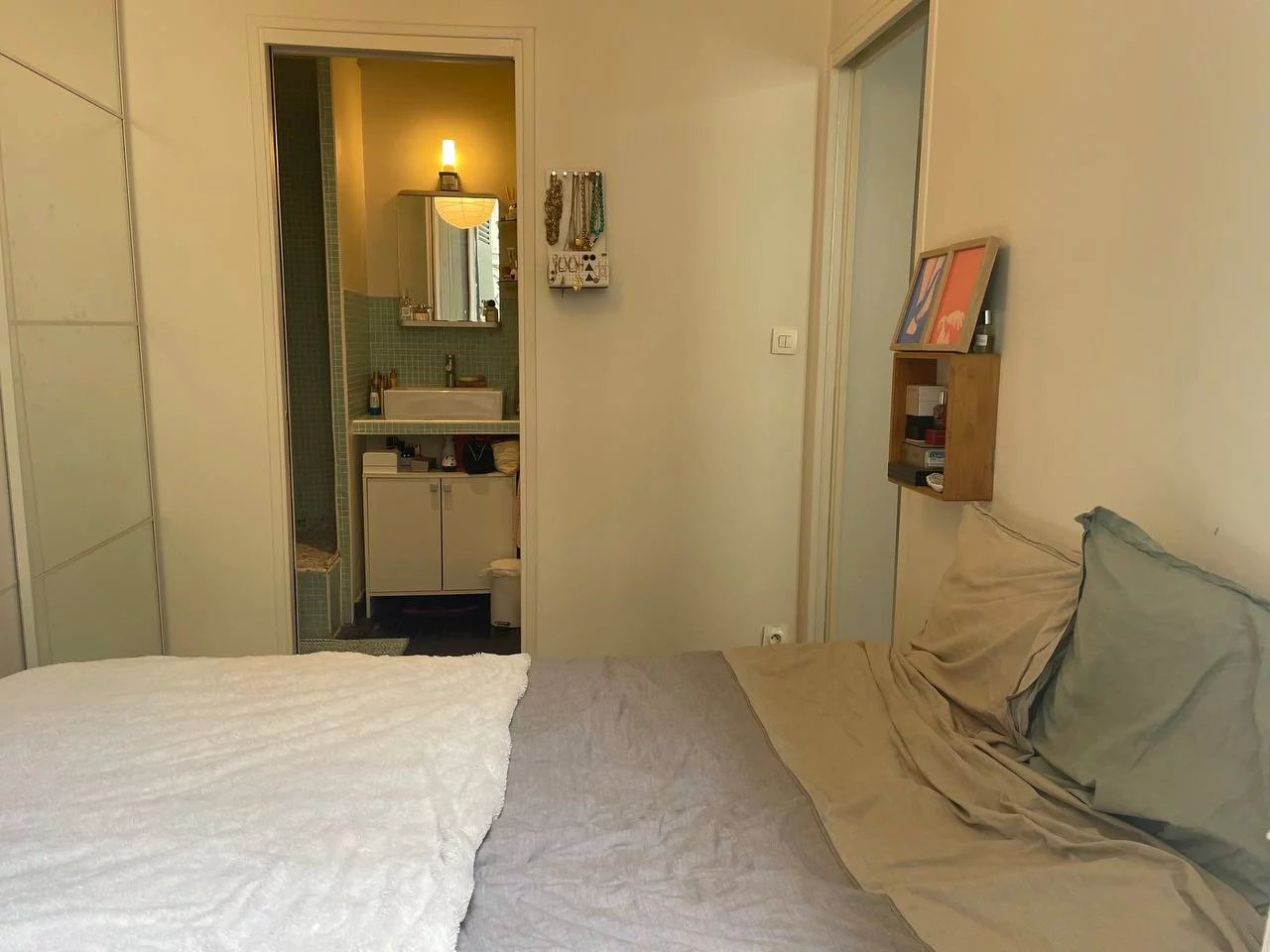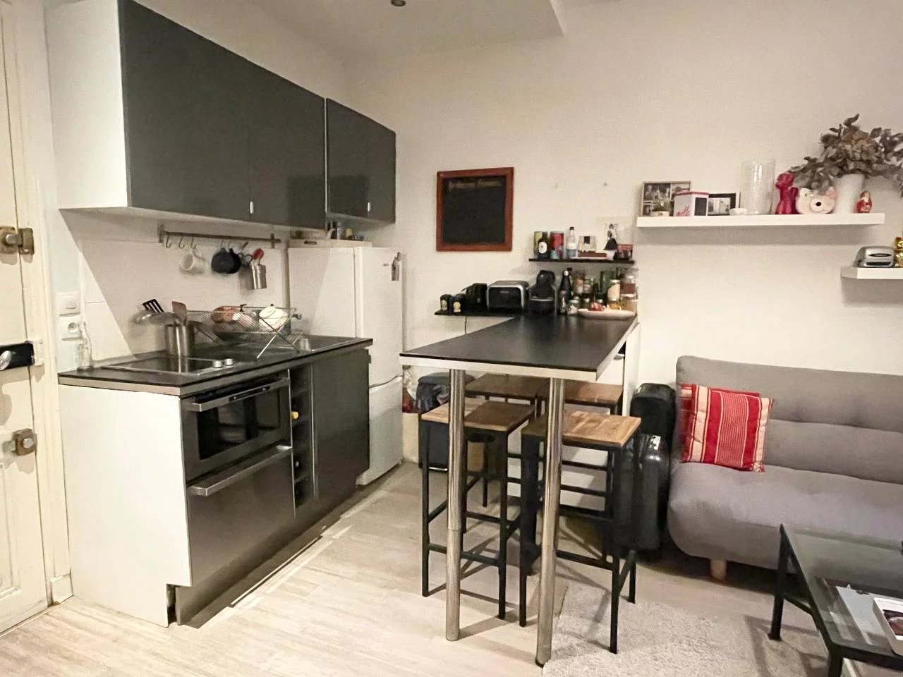 La visite révèle un séjour avec cuisine ouverte et accès direct sur la terrasse, une chambre compacte et une salle d'eau attenante. Nombreux rangements.