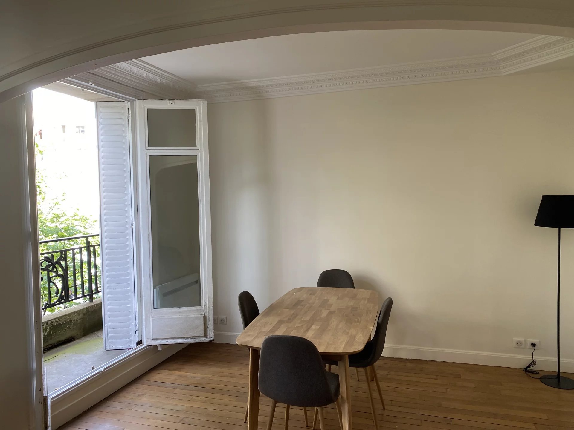La visite révèle un double séjour avec parquet massif et moulures au plafond, exposé Sud-Est donnant sur un balcon, une cuisine séparée et équipée, une chambre au calme sur cour, ainsi qu'une salle d'eau en bon état.