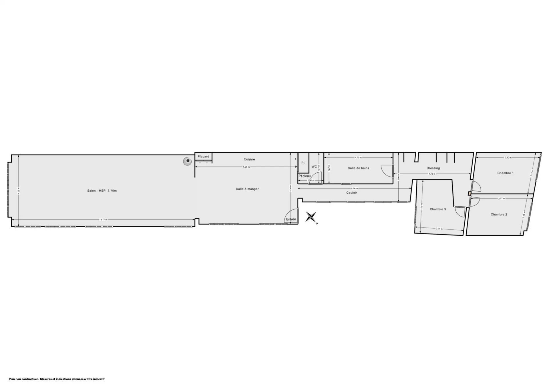La visite révèle d'abord une pièce de vie de près de 75m². Une cuisine / salle à manger, un coin cheminée et un grand salon se succèdent dans un ensemble ouvert et harmonieux. Un couloir dessert ensuite trois chambres et une salle de bain.