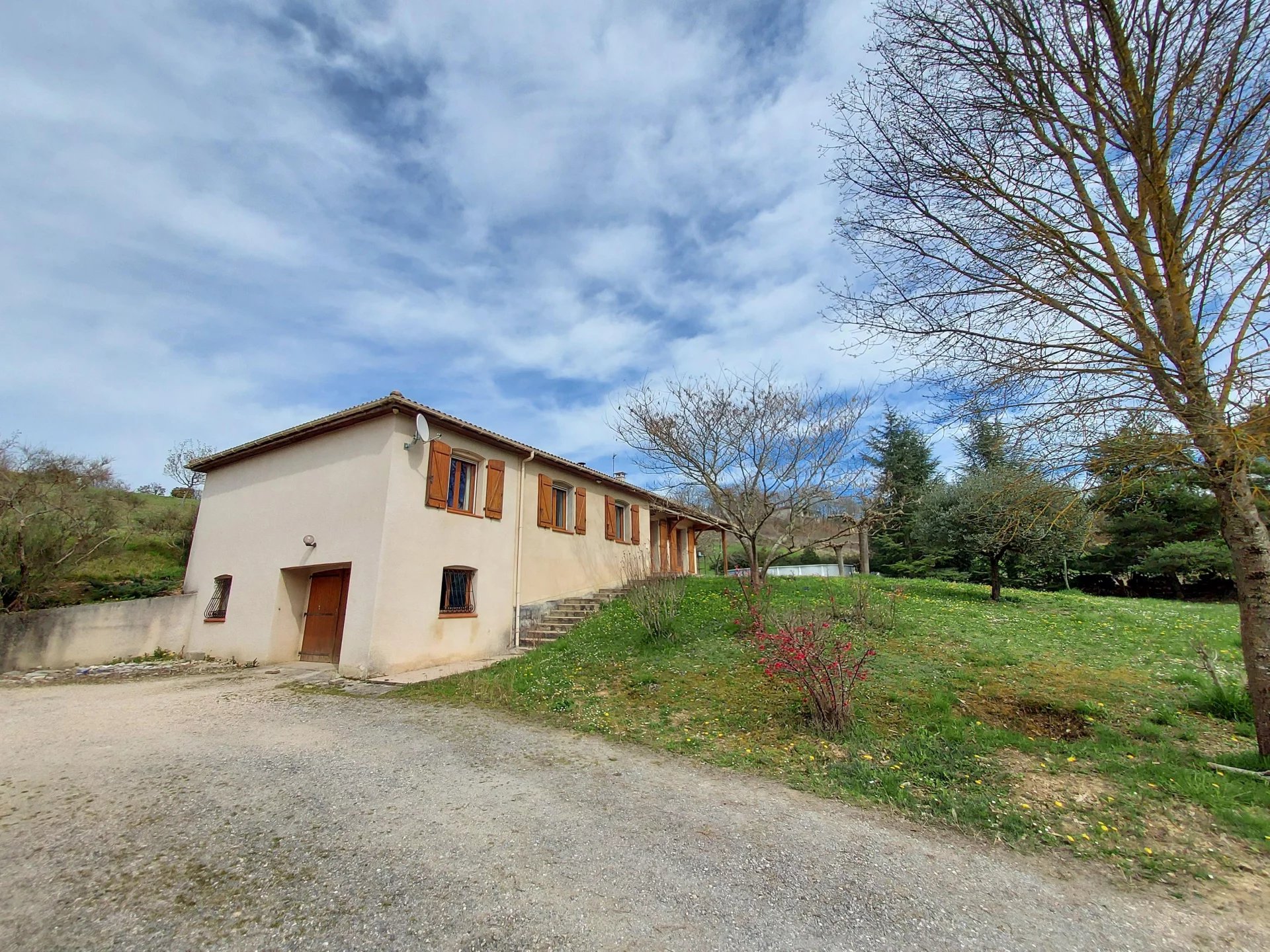 A 10 min d'Auch Maison de plain-pied d'environ 110m² comprenant une pièce à vivre avec poêle à bois, une cuisine indépendante semi-équipée ouvrant sur une grande terrasse couverte, un couloir desservant 5 chambres, une salle de bains avec baignoire et douche, un wc indépendant, un cellier. Un grand sous-sol avec garage et buanderie Agréable terrain arboré d'environ 6200m²