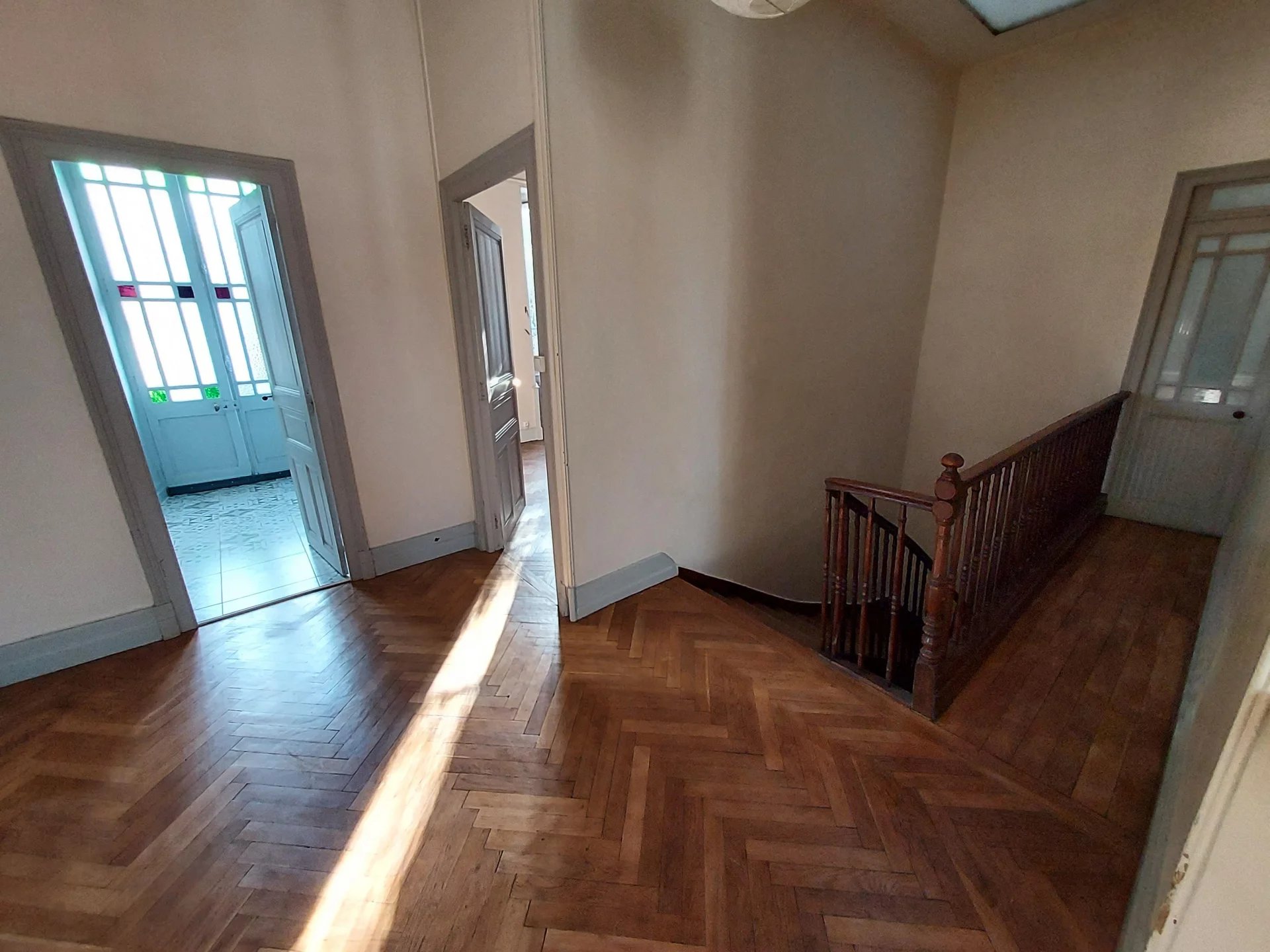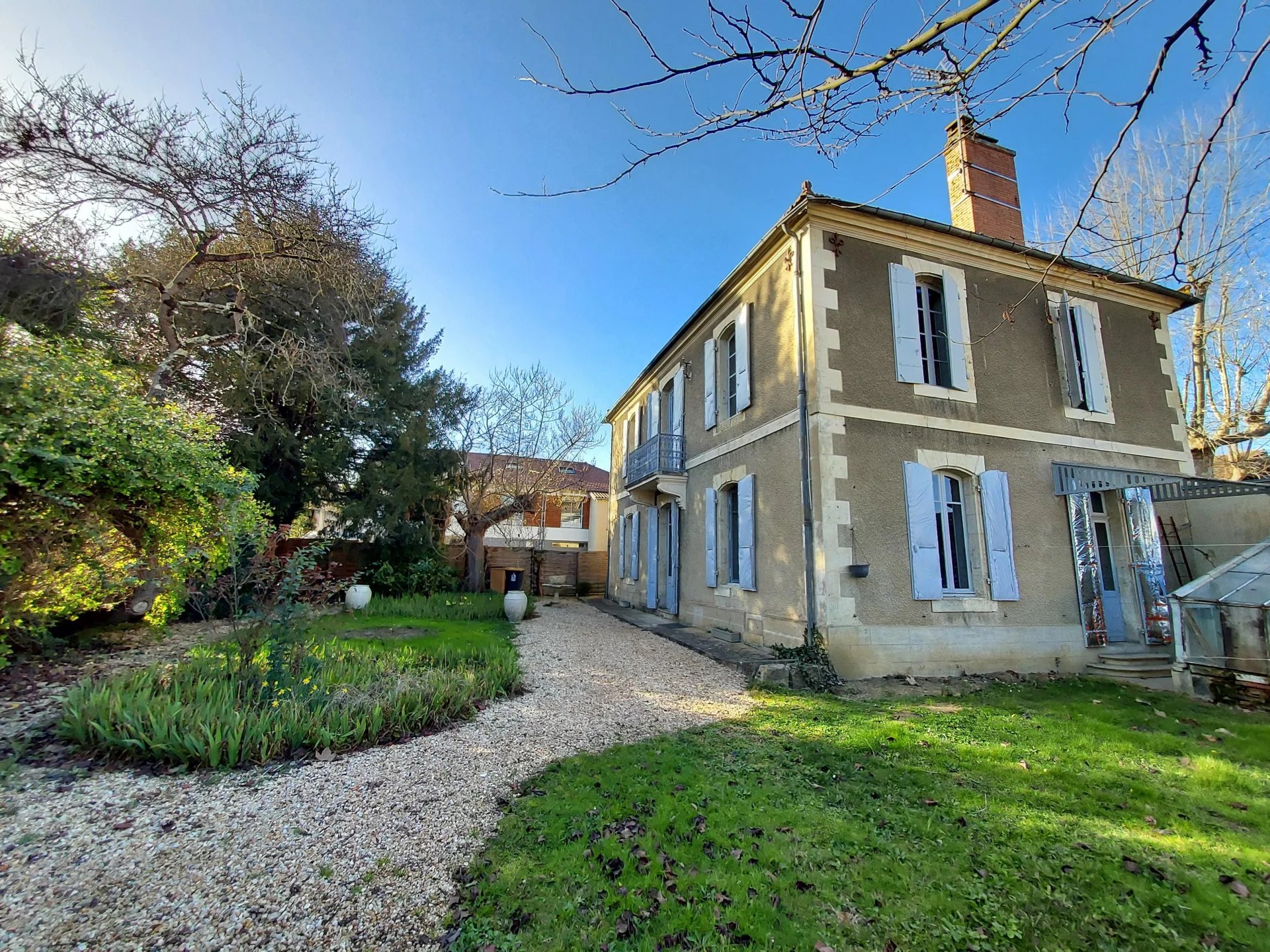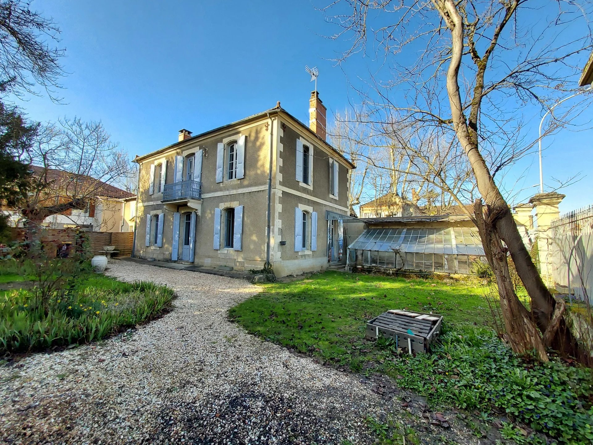 AUCH - Centre Basse Ville Maison de caractère en pierre de Type 6 Belle entrée, salon-séjour, cuisine-coin repas, salle d'eau, wc; A l'étage : un palier desservant 3 chambres, un bureau, une salle de bains. Jardin avec charmante serre Cave Chauffage central au gaz Beaux éléments anciens ( planchers anciens, cheminées...)