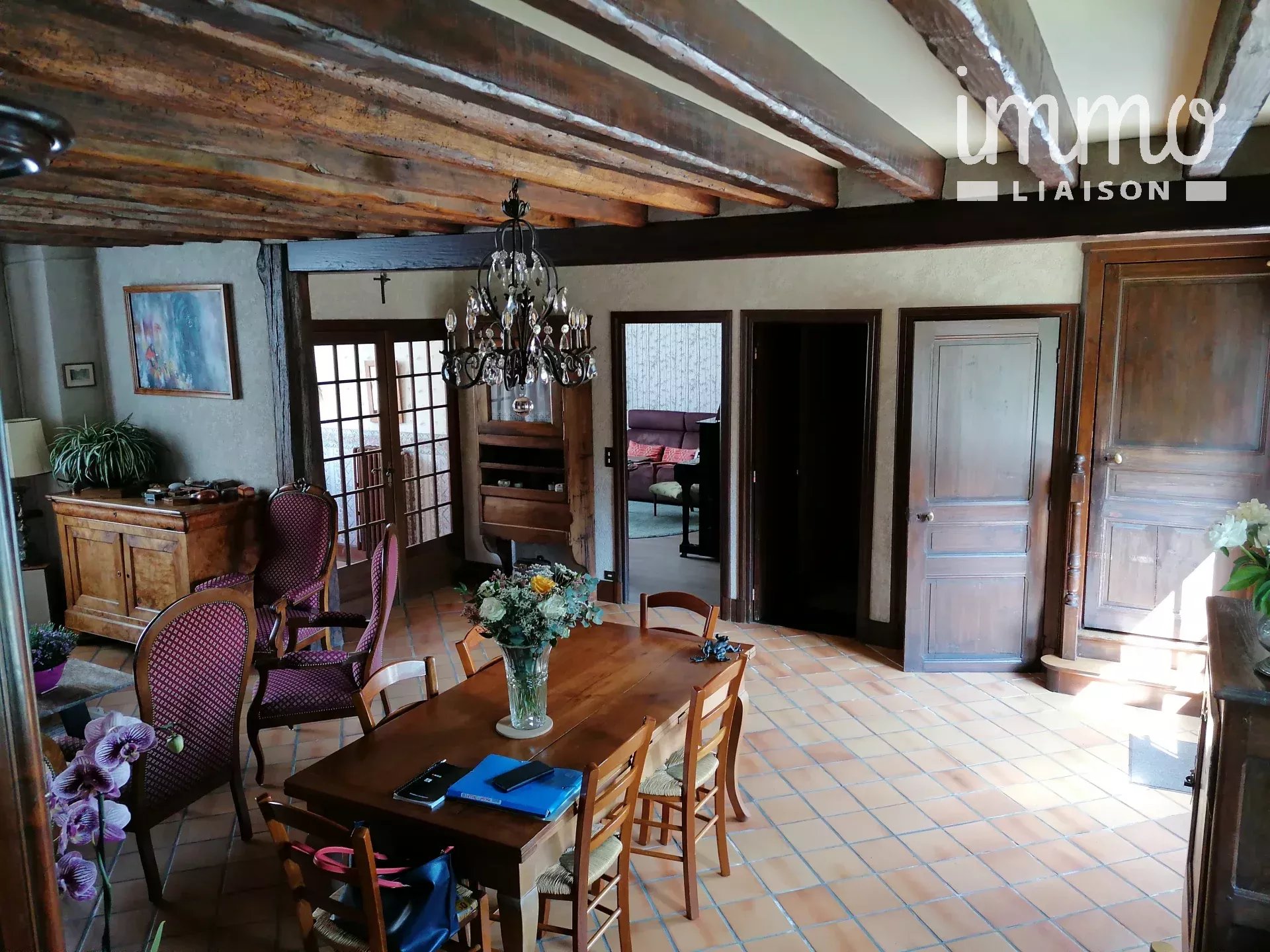 Sas d'entrée, puis un salon-séjour de 44 m² avec poutres apparentes, une pièce tv, une cuisine composée en deux parties avec possibilité de supprimer la cloison.