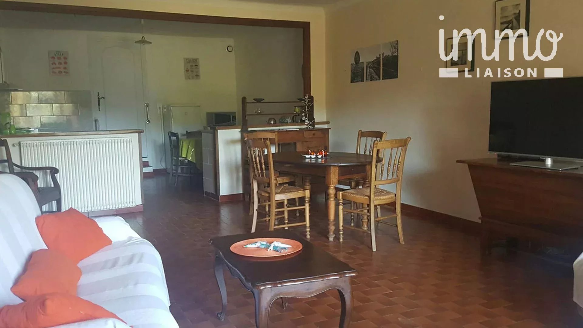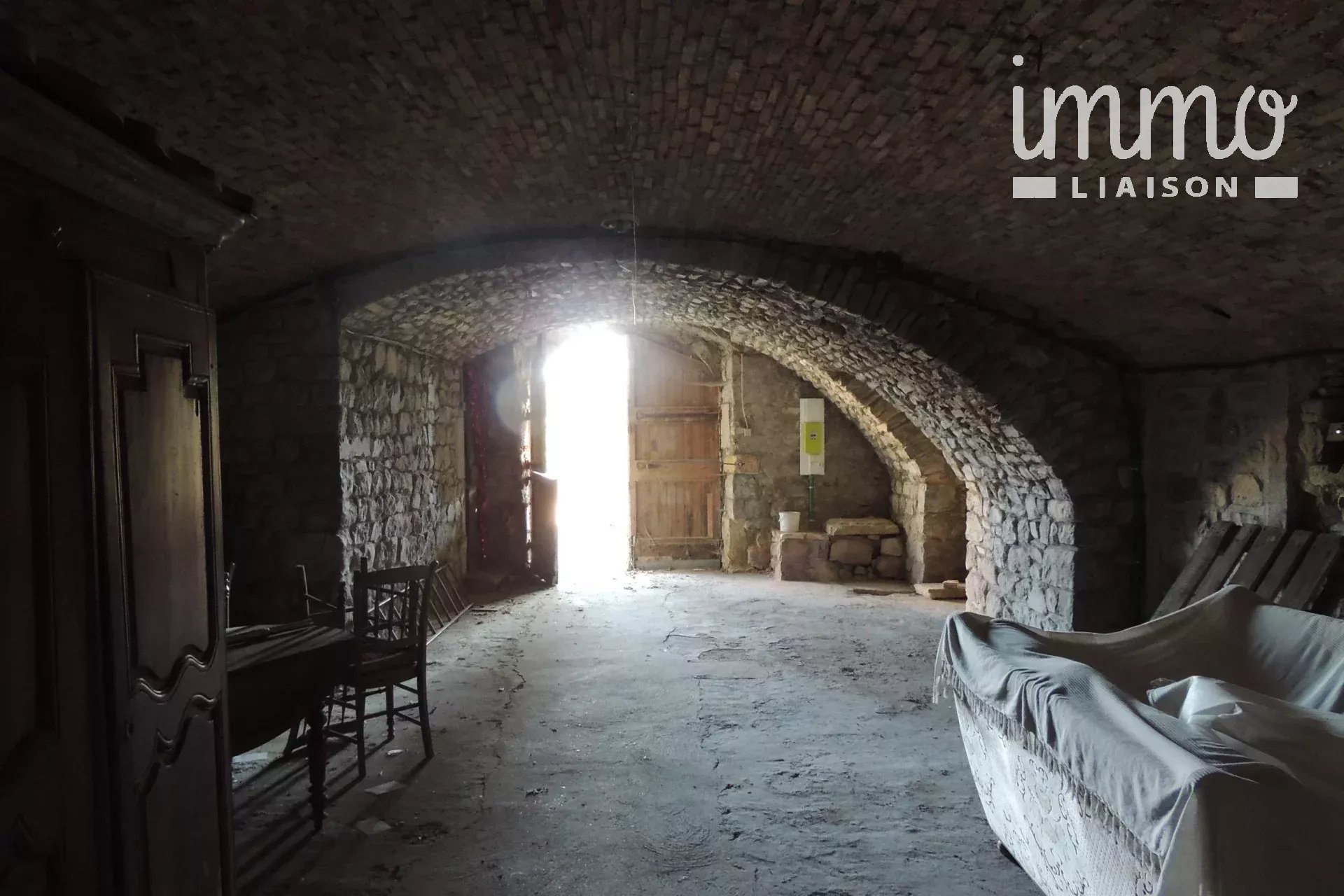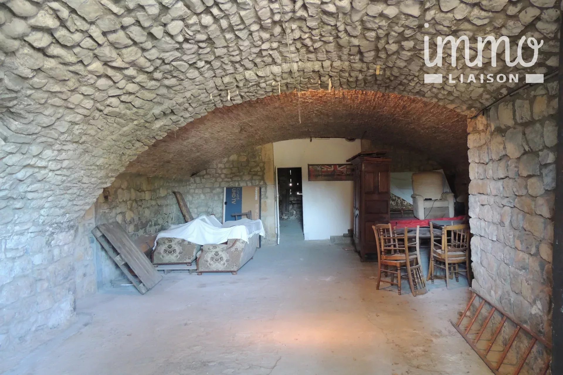 Appartement au rez-de-chaussée dans une maison de caractère en pierre comprenant une pièce à vivre avec cheminée, une cuisine aménagée, un couloir desservant deux chambres, une salle d'eau, un toilette séparé. Un grand garage en pierre voûtée, une remise, une chaufferie, Au 1er étage, une terrasse couverte (prévoir ouverture avec escalier pour l'accès) , un local technique.