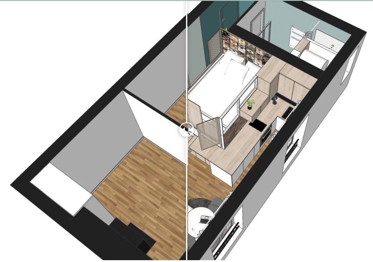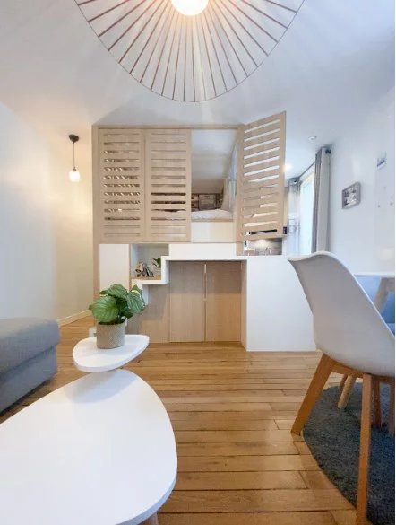 Cet espace cosy et fonctionnel vous séduira. L'espace nuit occupe une place centrale grâce au lit en hauteur . le cube crée est fonctionnel il accueille le coin couchage ainsi que de nombreux rangements . La pièce de vie est complétée par une cuisine ouverte tout équipée.