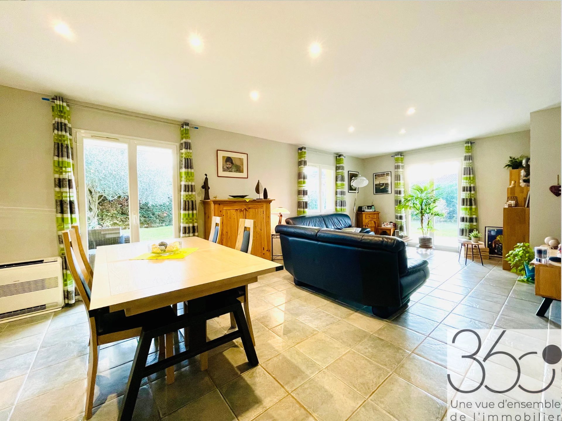 Côté jour, un salon/salle à manger bénéficiant d’une double exposition sud et ouest de plus de 30m2 donnant directement accès à une grande terrasse couverte d’environ 37m2. La cuisine est équipée et ouverte sur ce bel espace de vie.Dans sa continuité une pièce de plus de 20m2 avec baie vitrée en remplacement du garage isolé qui peut éventuellement être remis en sa fonction première.