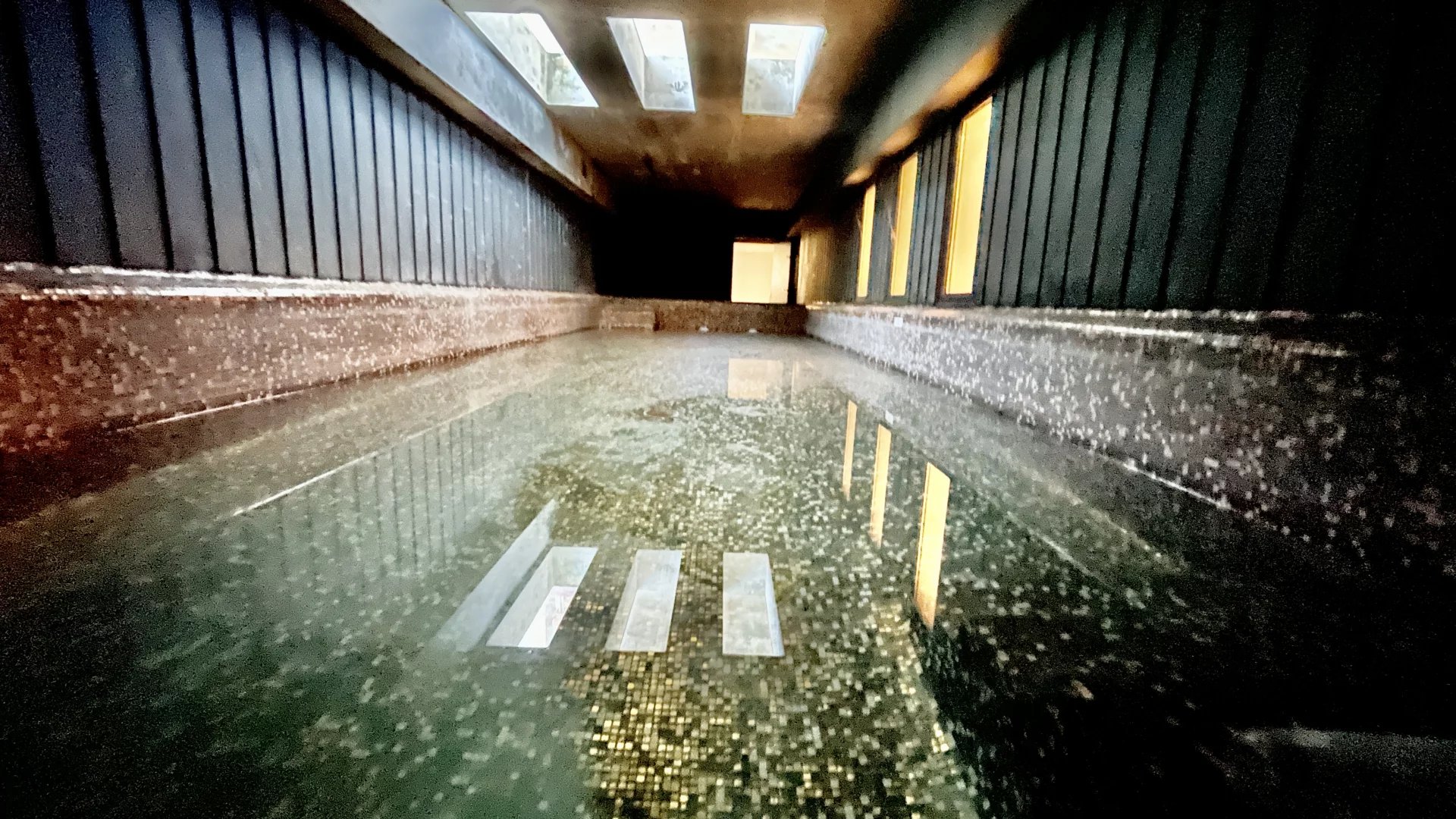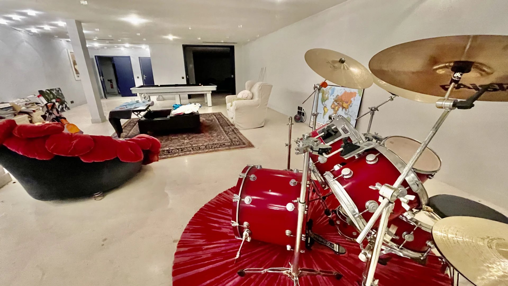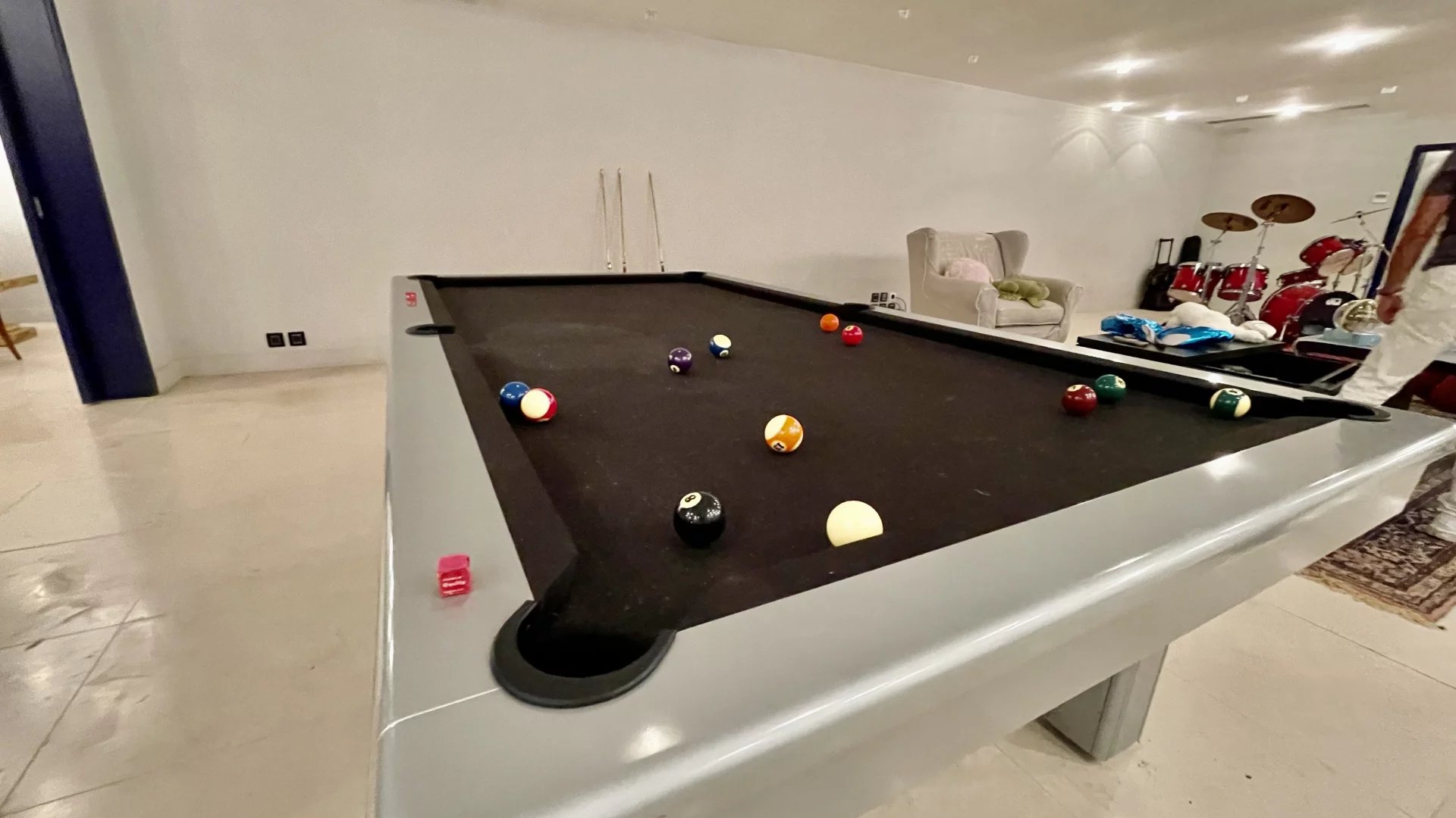 Une salle de cinéma avec insert de cheminée une salle de jeu, une salle de sport avec douche, une buanderie avec placards et rangements ainsi qu’une grande piscine intérieure chauffée,