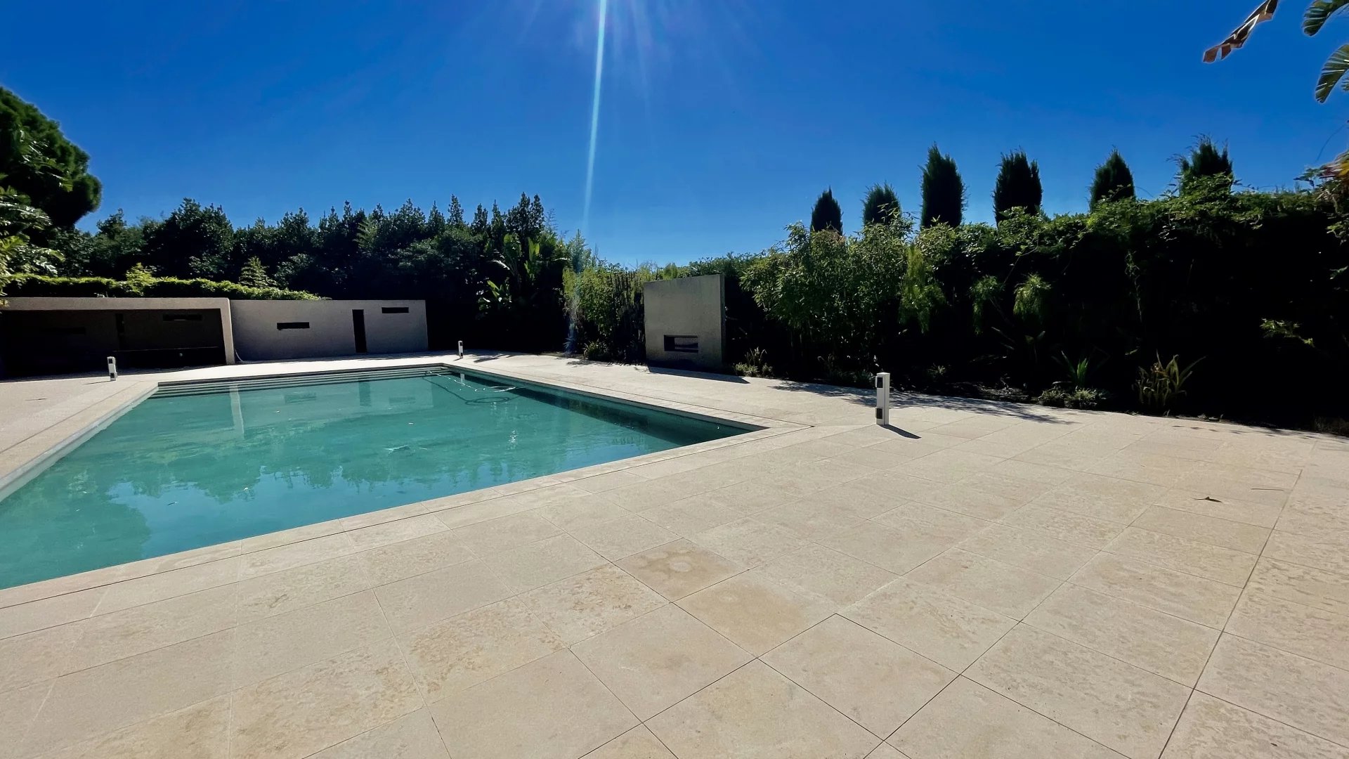Une superbe piscine à débordement, en pierre, de 15m x 6m avec cuisine d’été cheminée à gaz, local technique et pièces de rangements.