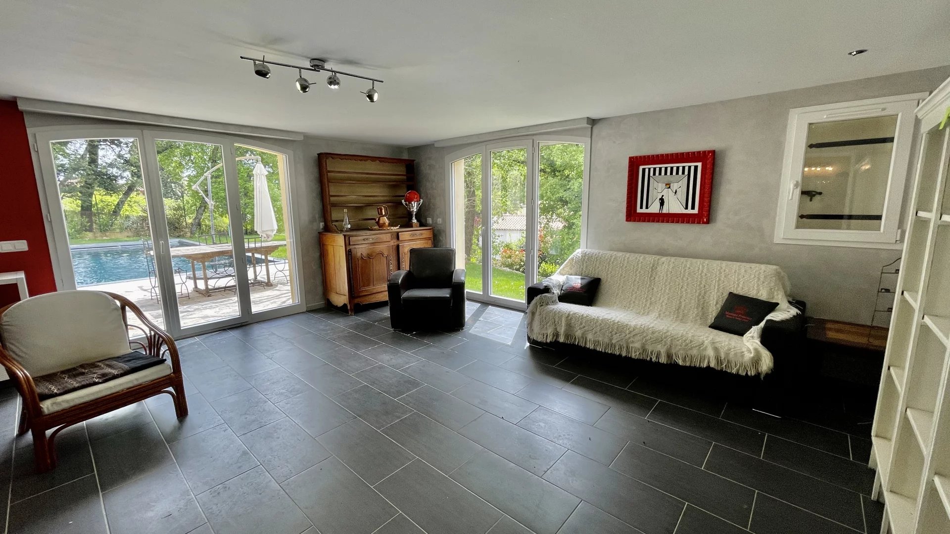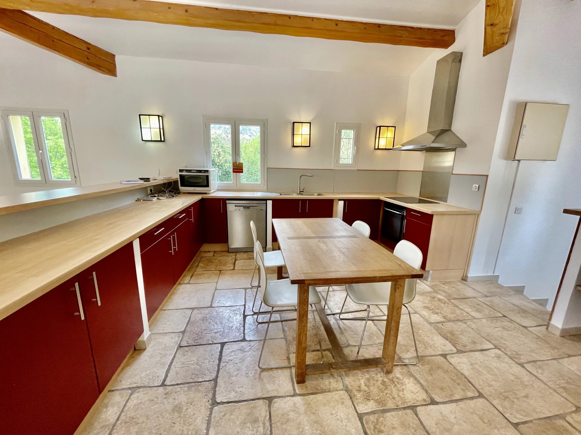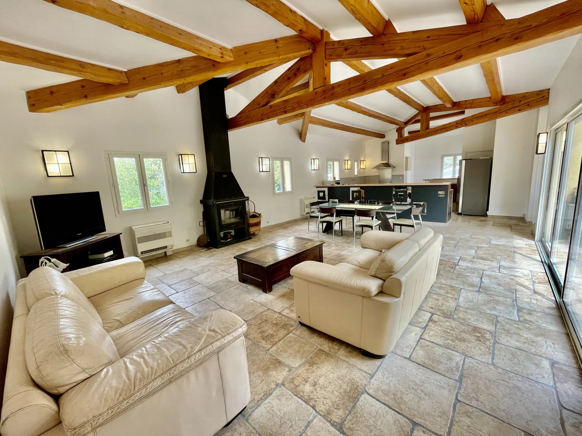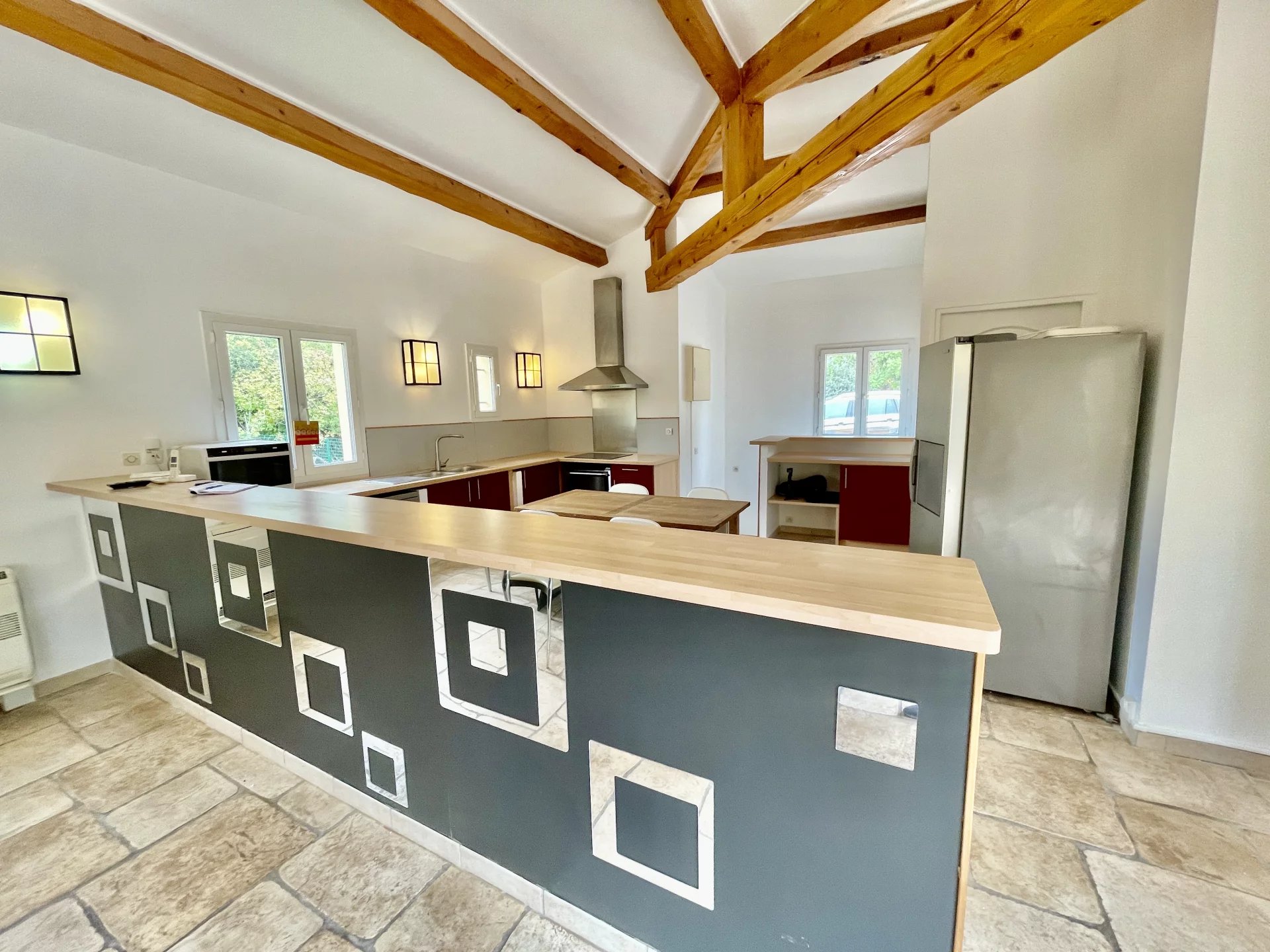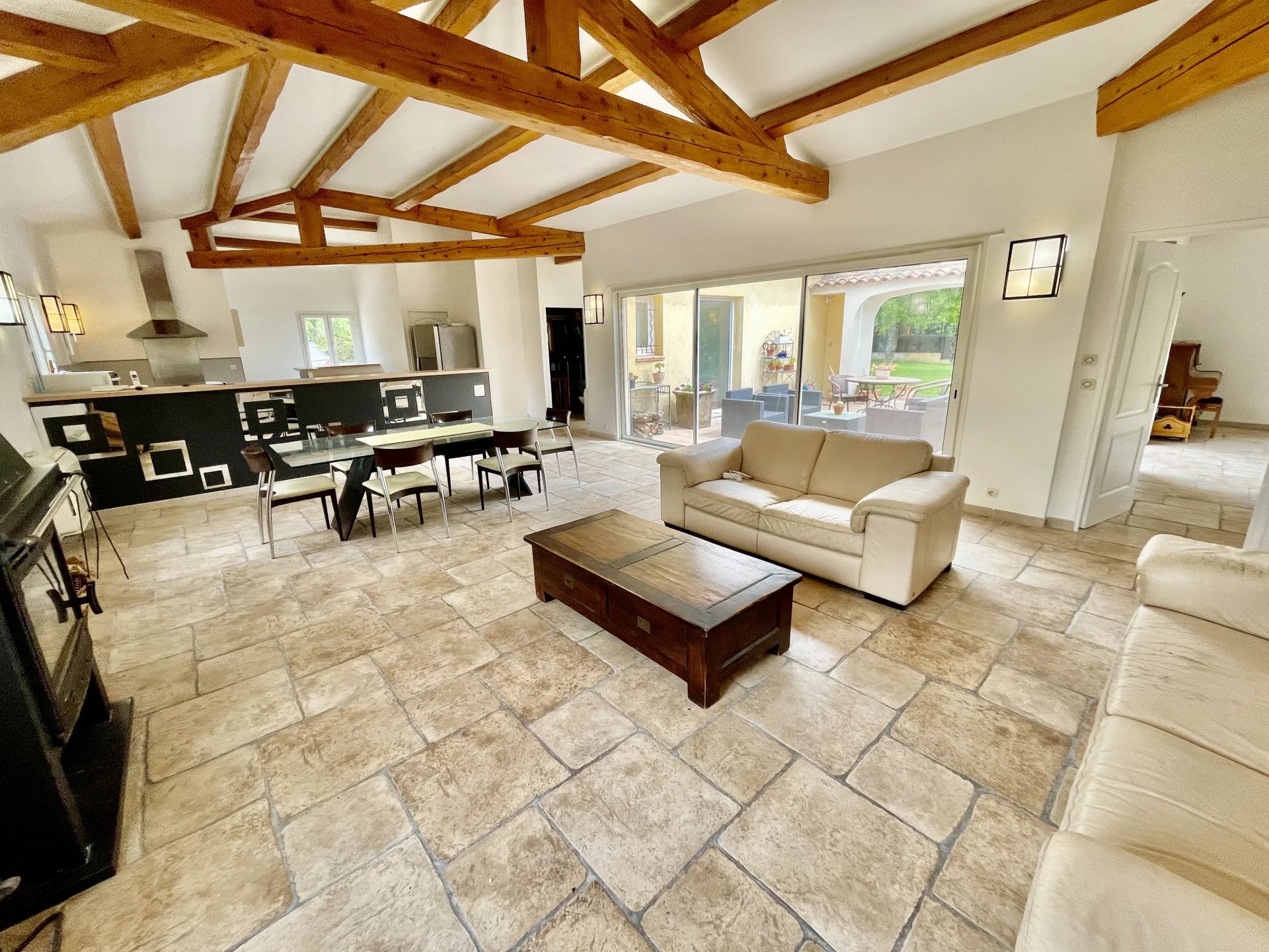 d’une entrée, d’un séjour salon lumineux de 40M2 avec insert de cheminée donnant sur une grande terrasse en patio, d’une cuisine ouverte équipée de 20M2.