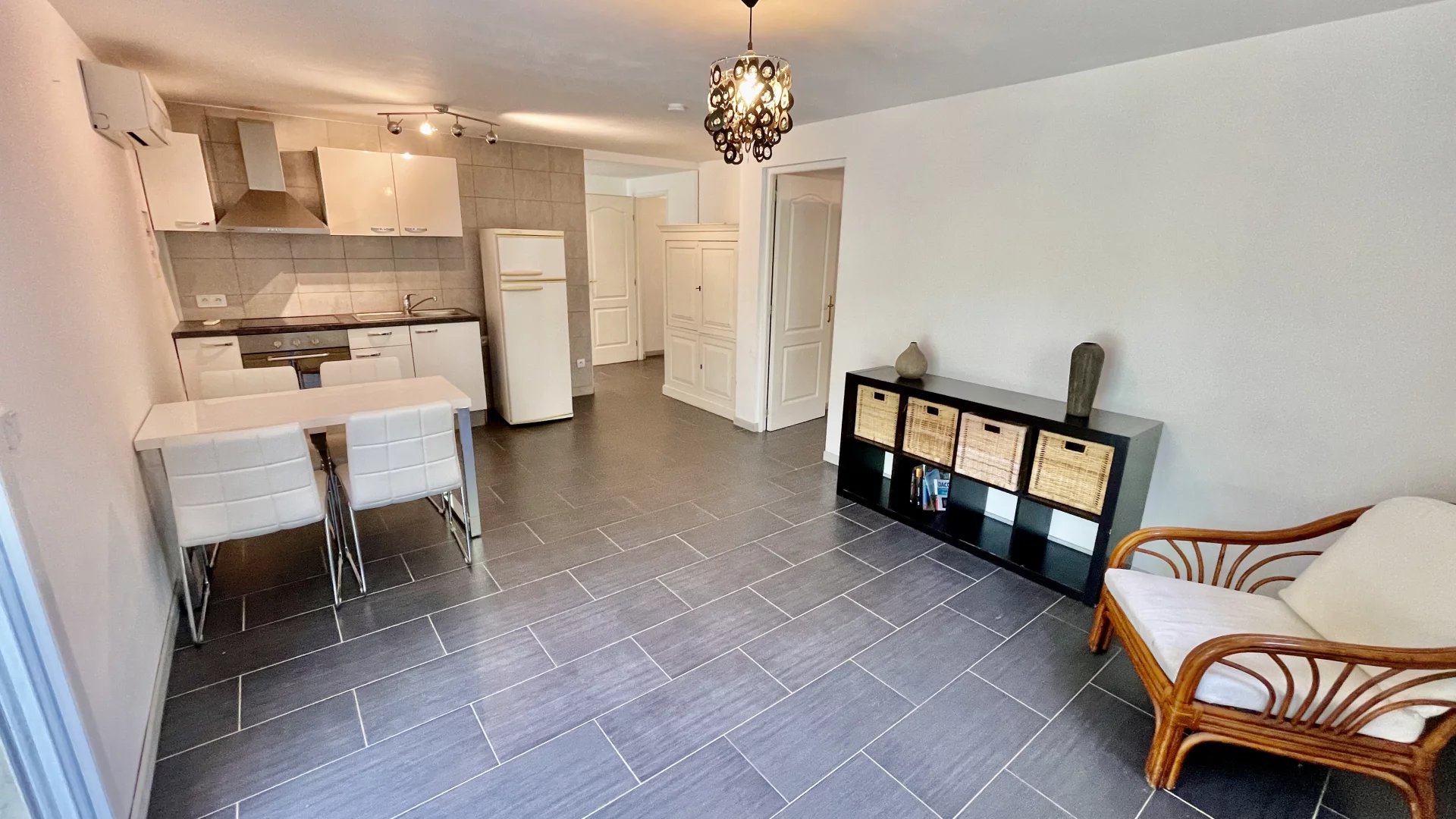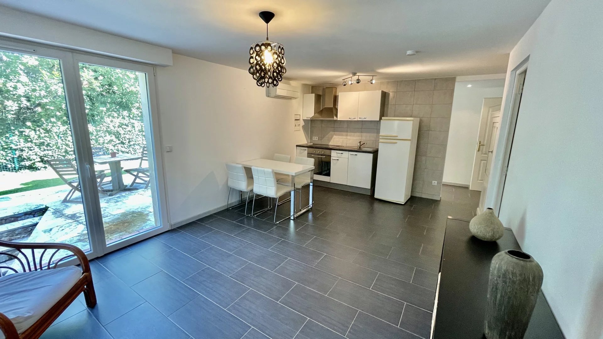 1 deux pièces avec chambre, cuisine équipée salle de douche, toilettes, terrasse et entrée indépendante.