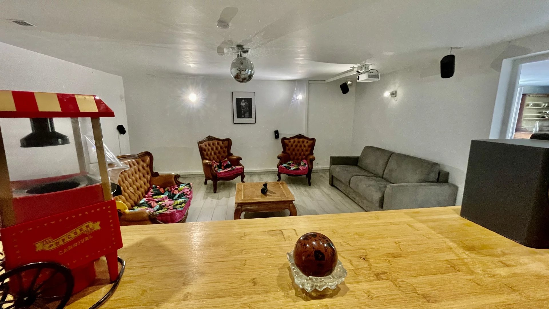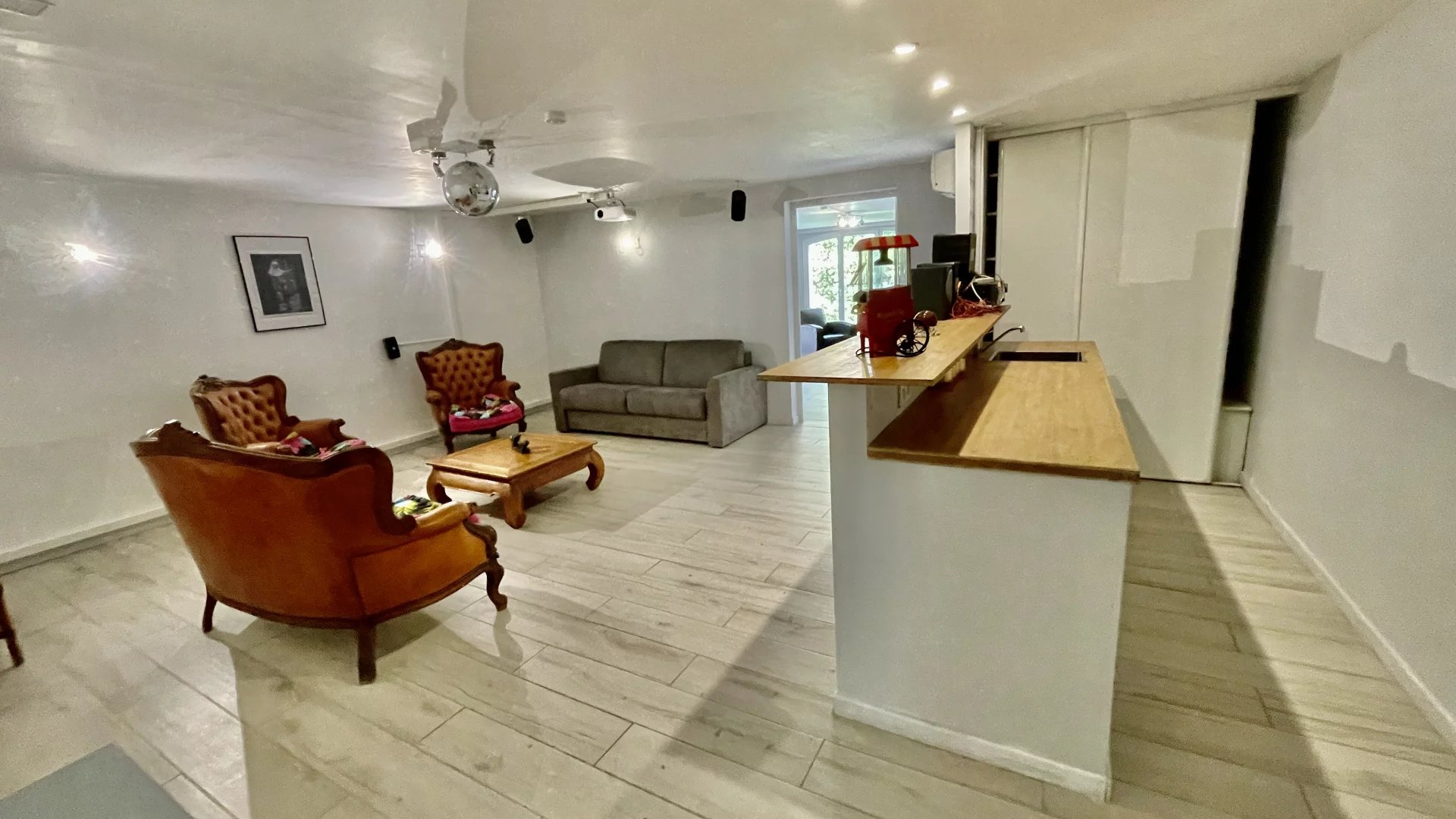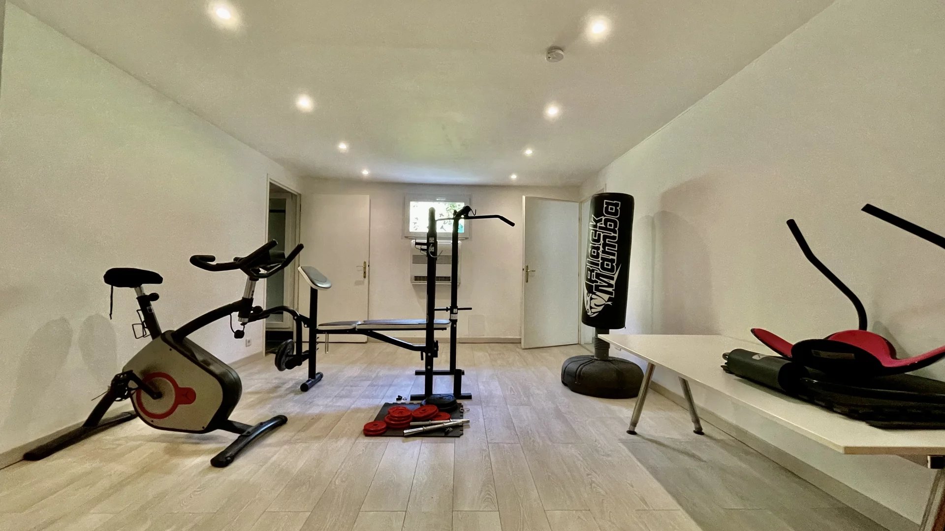 Une salle de cinéma avec cuisine et bar, une grande buanderie avec placards et rangements, une salle de sport avec douche, une grande cave à vin, ainsi qu’une grande cave de rangement.