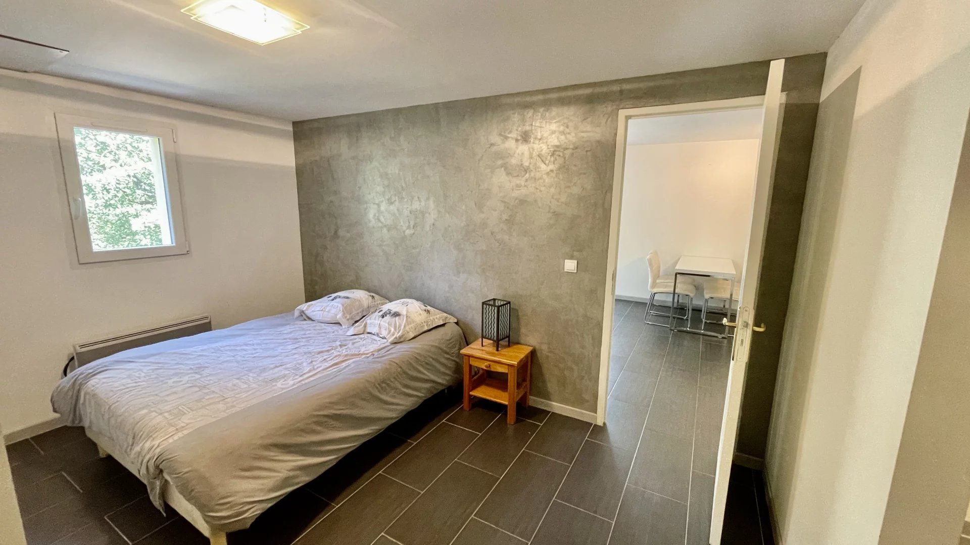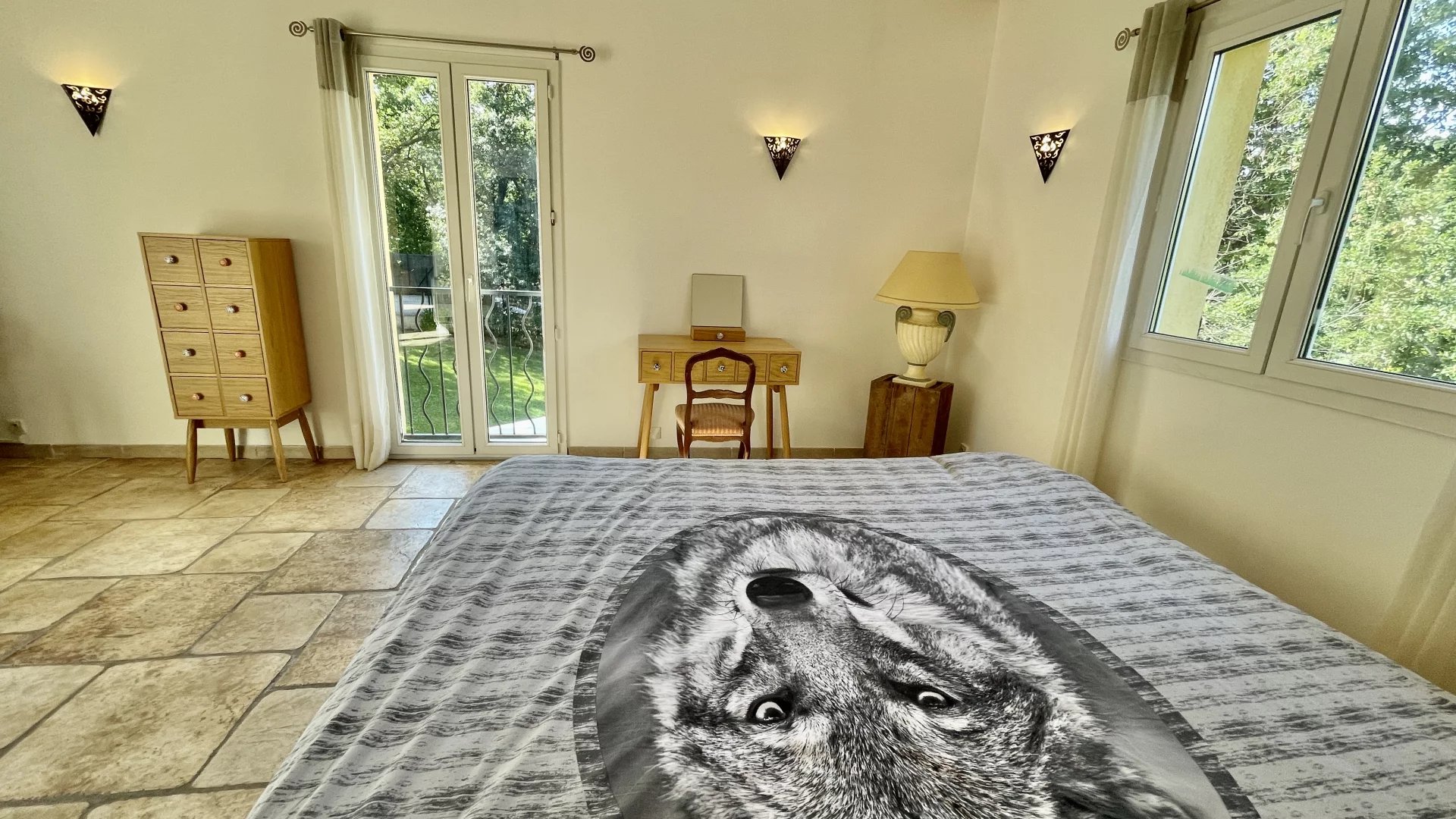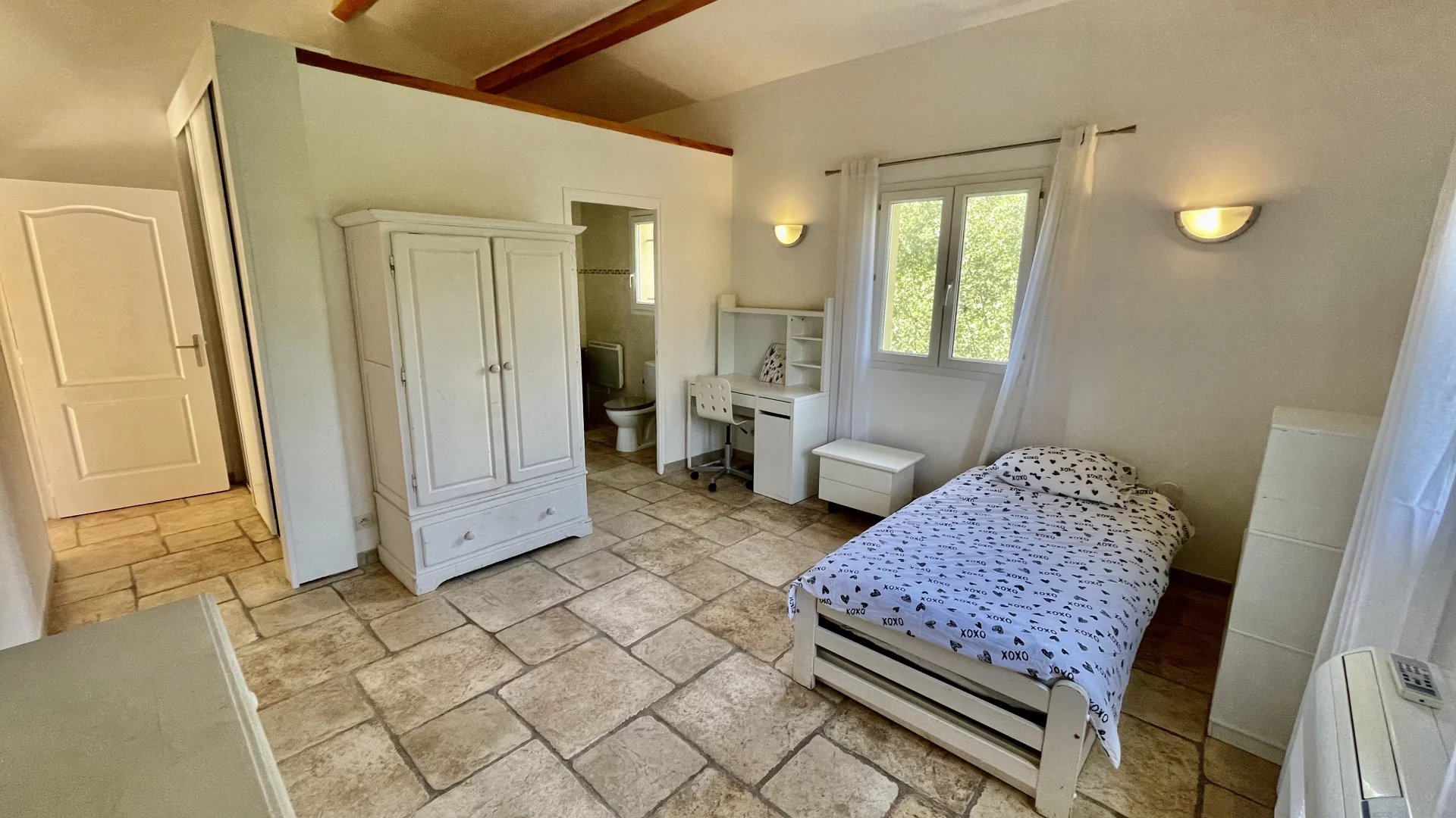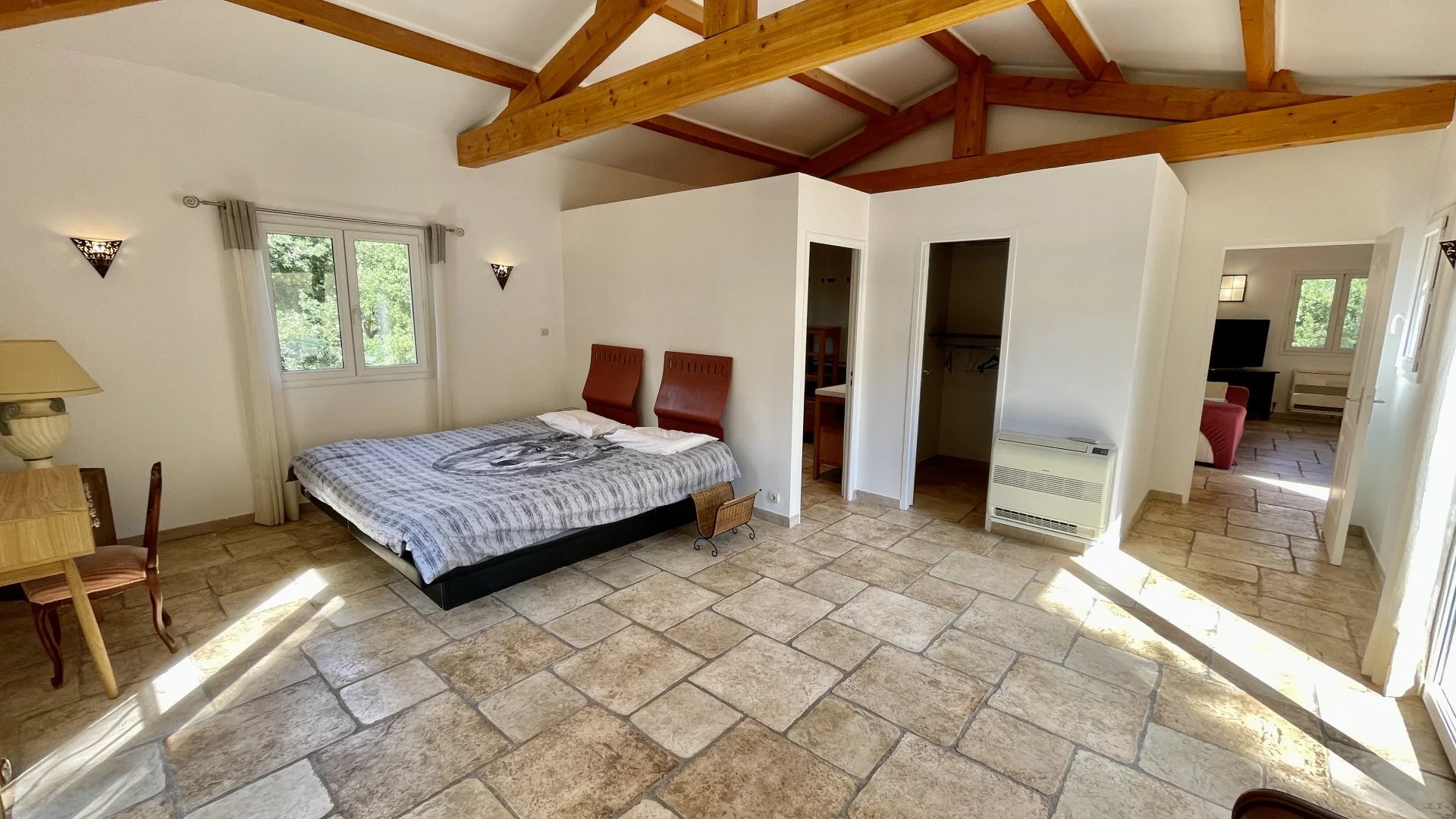 La chambre parentale possède un accès direct à une grande terrasse en patio.