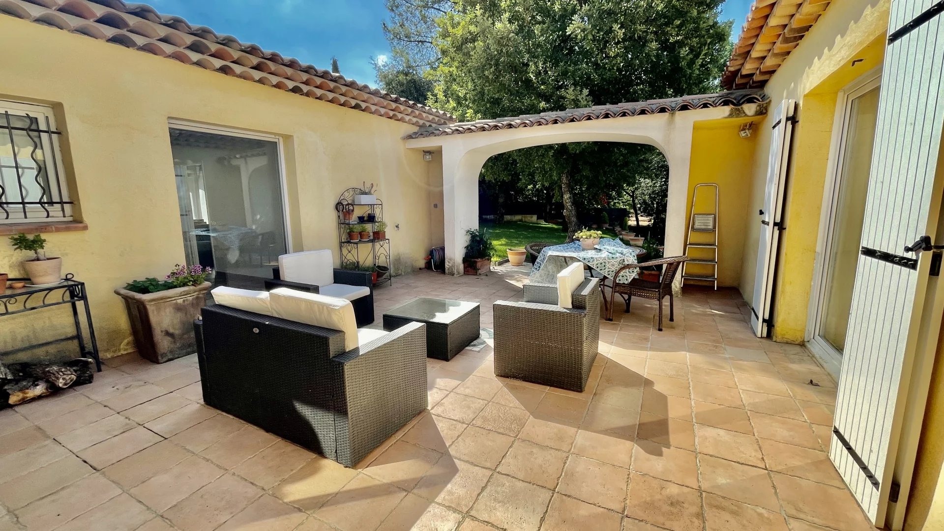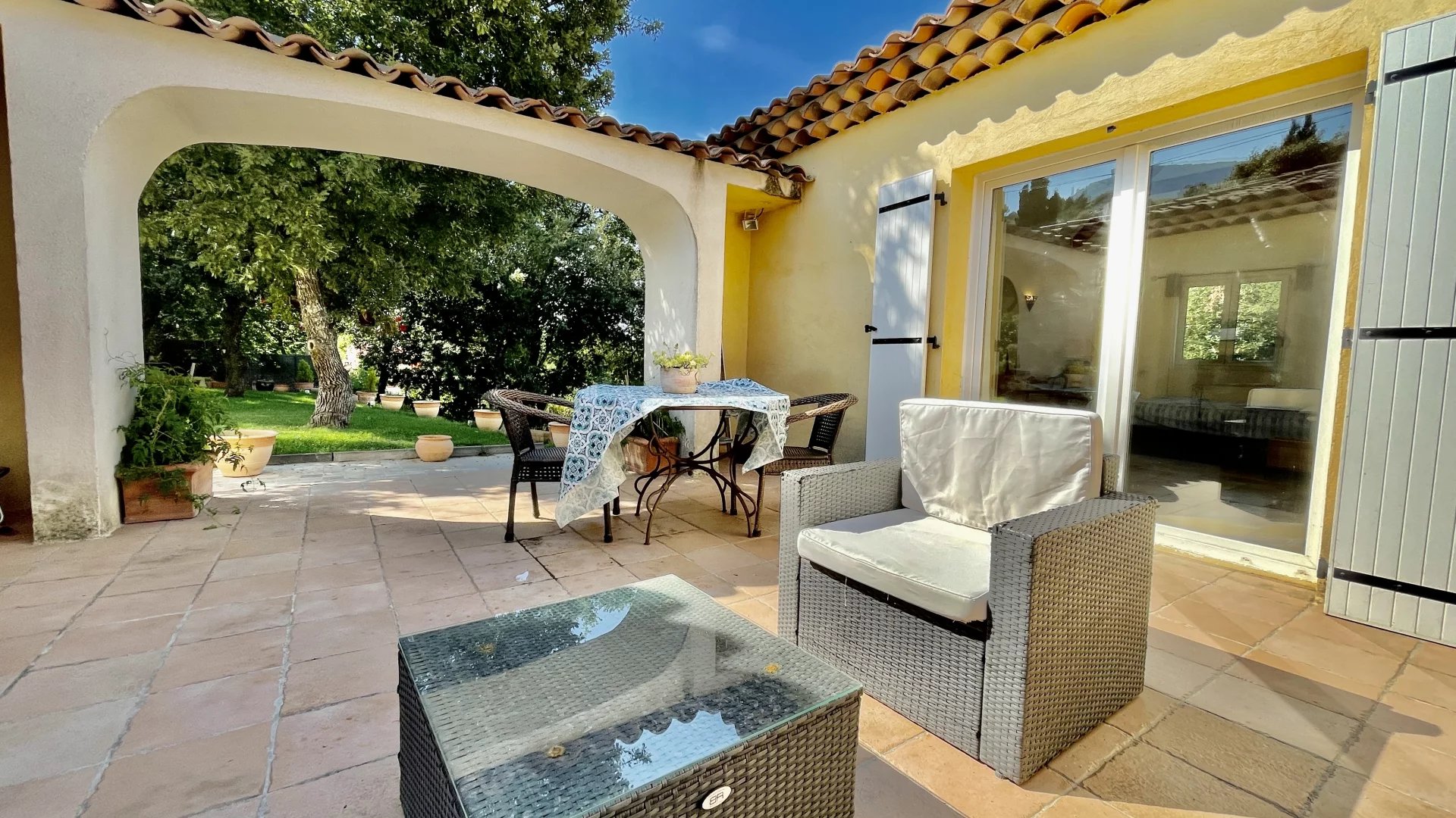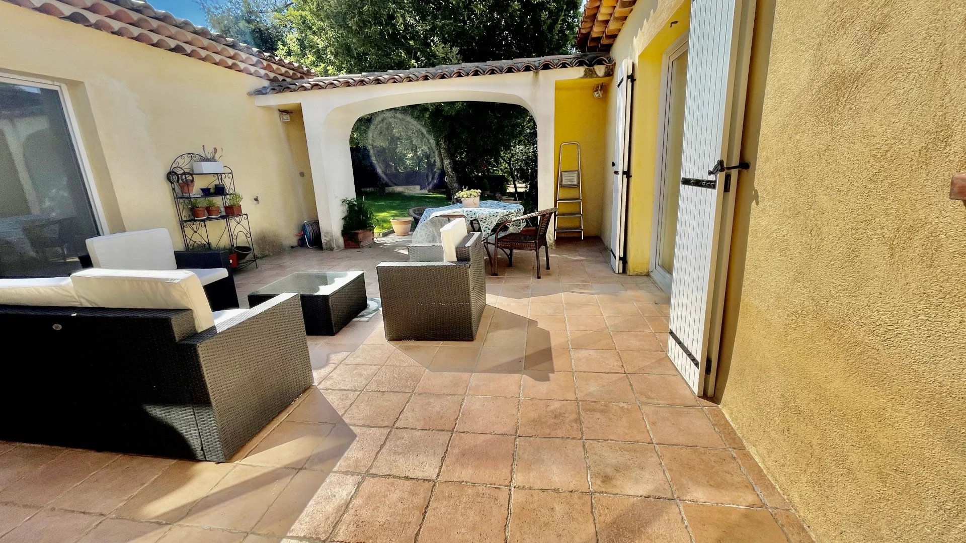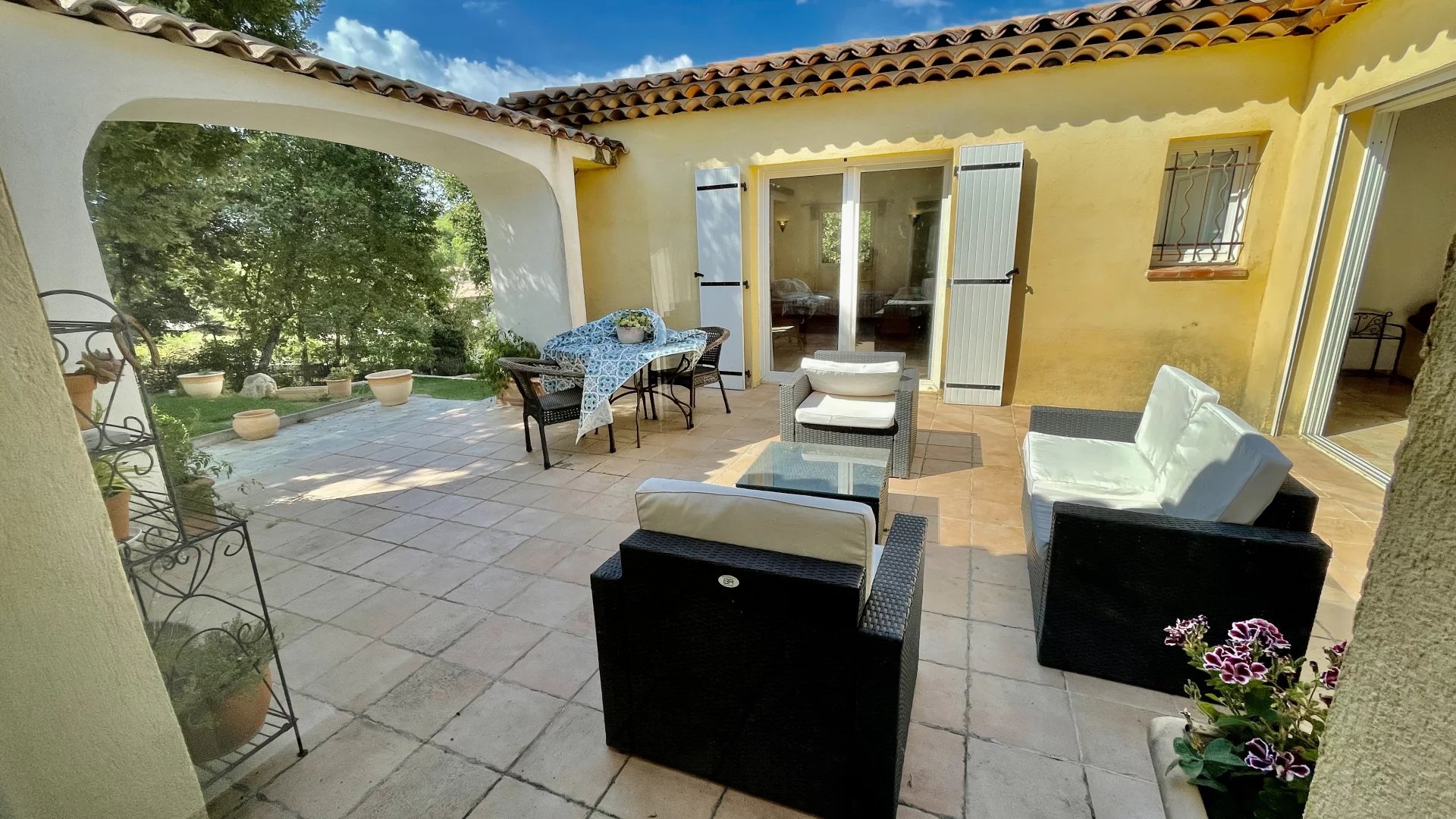 La chambre parentale possède un accès direct à une grande terrasse en patio.