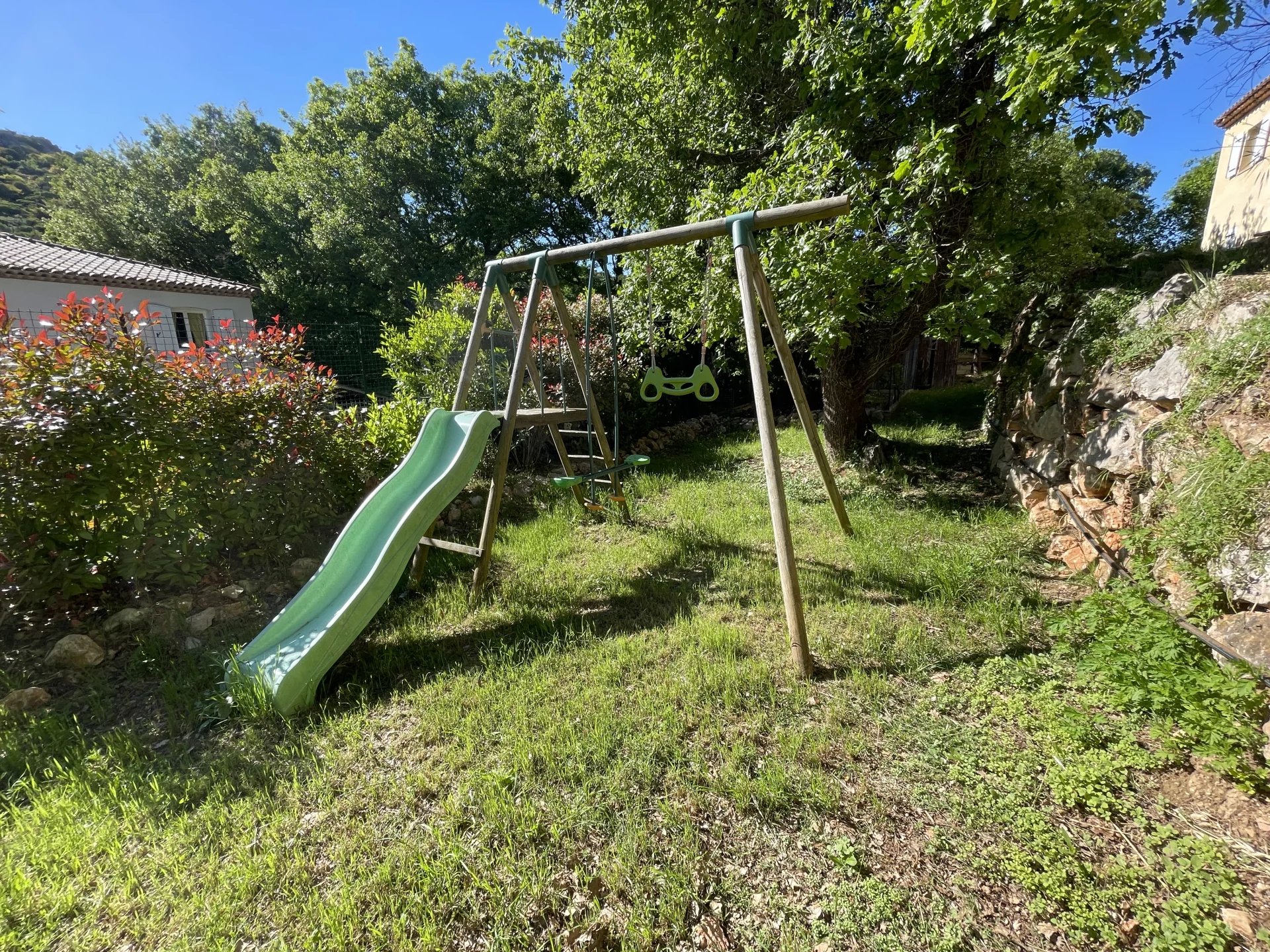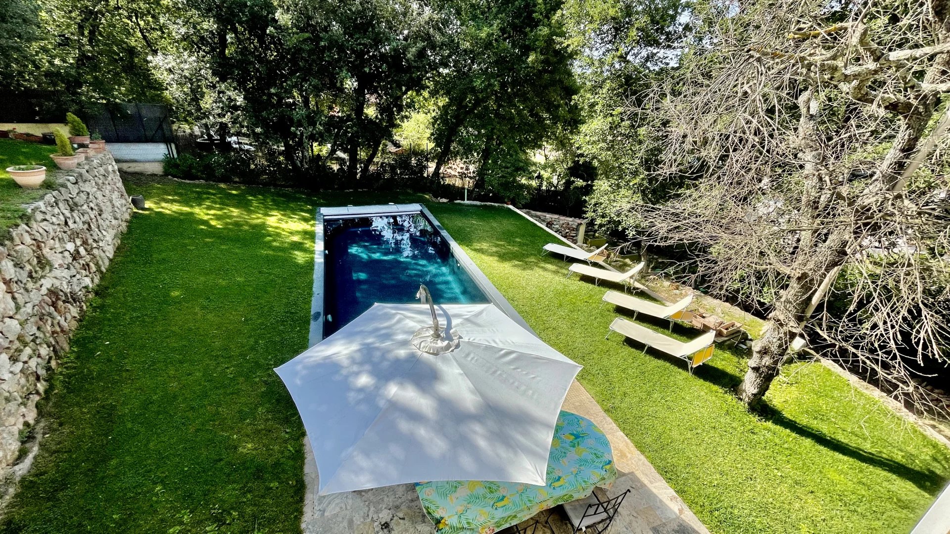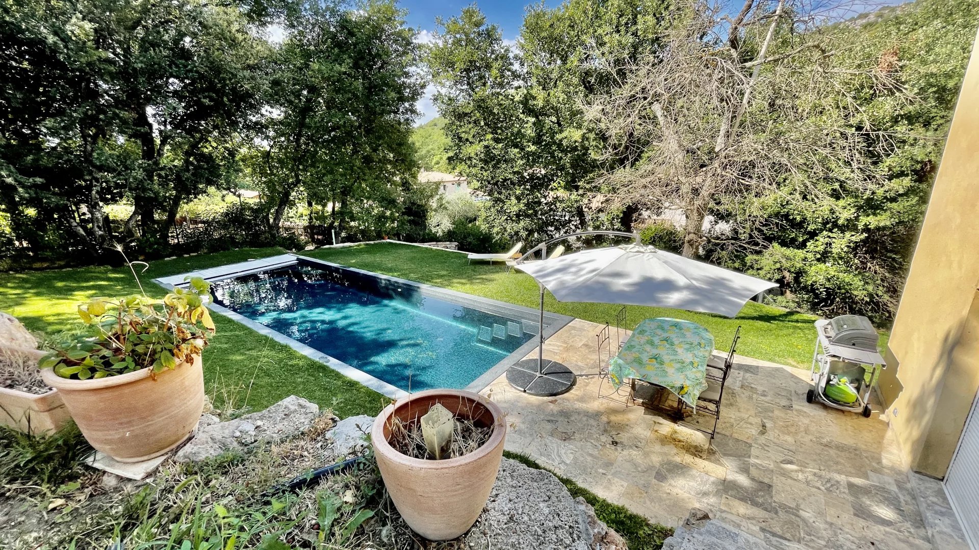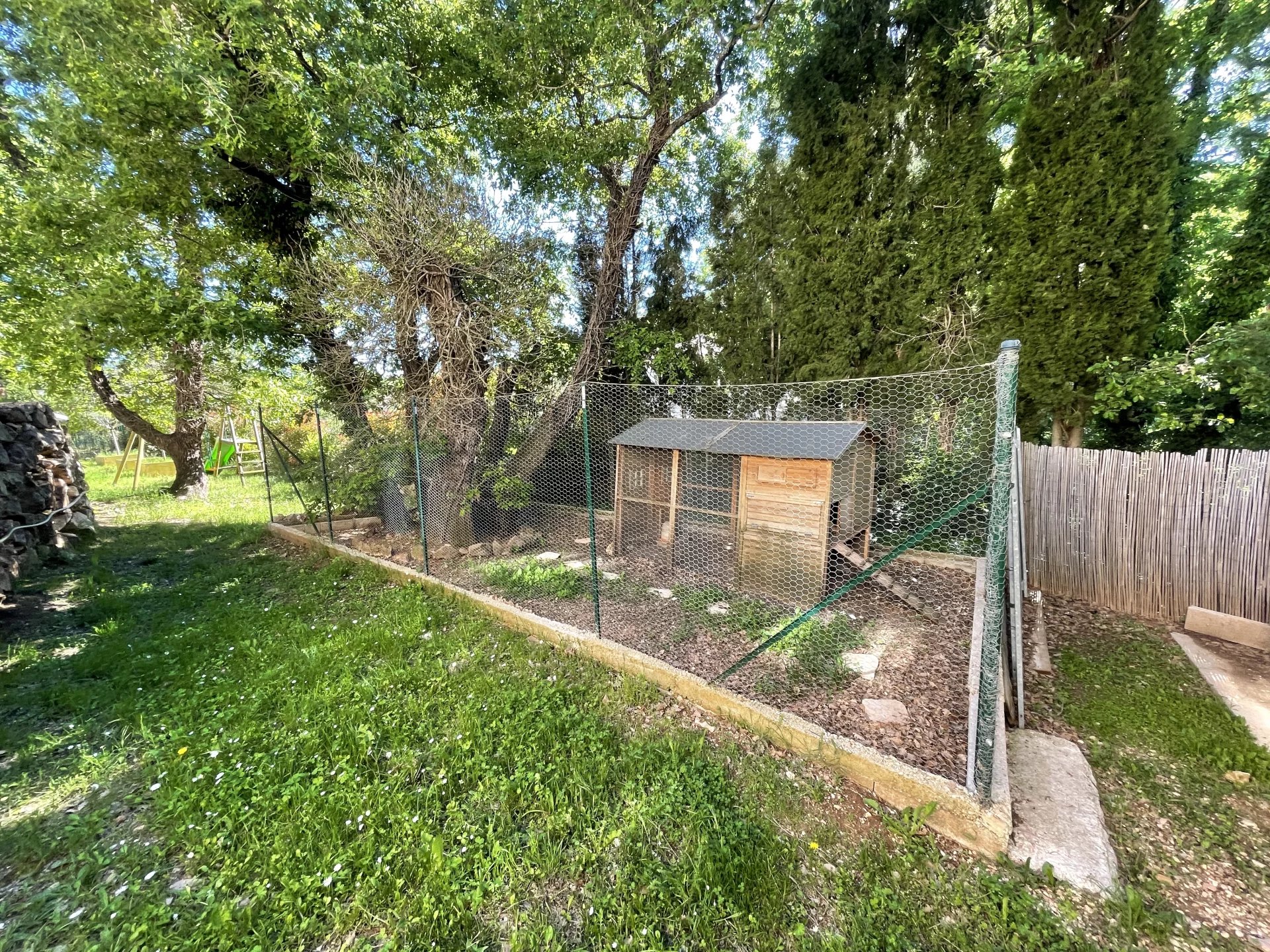 A l'extérieur, plusieurs jardins en restanques à larges parcelles pour un total de 2100M2 de terrain, offrant une belle exposition Sud-Ouest avec vue dégagée verdure et collines. Une piscine de 10m x 4m avec couverture automatique ainsi que 3 terrasses dont une en patio de 30m², un terrain de jeu, un poulailler, une grange complètent le bien.
