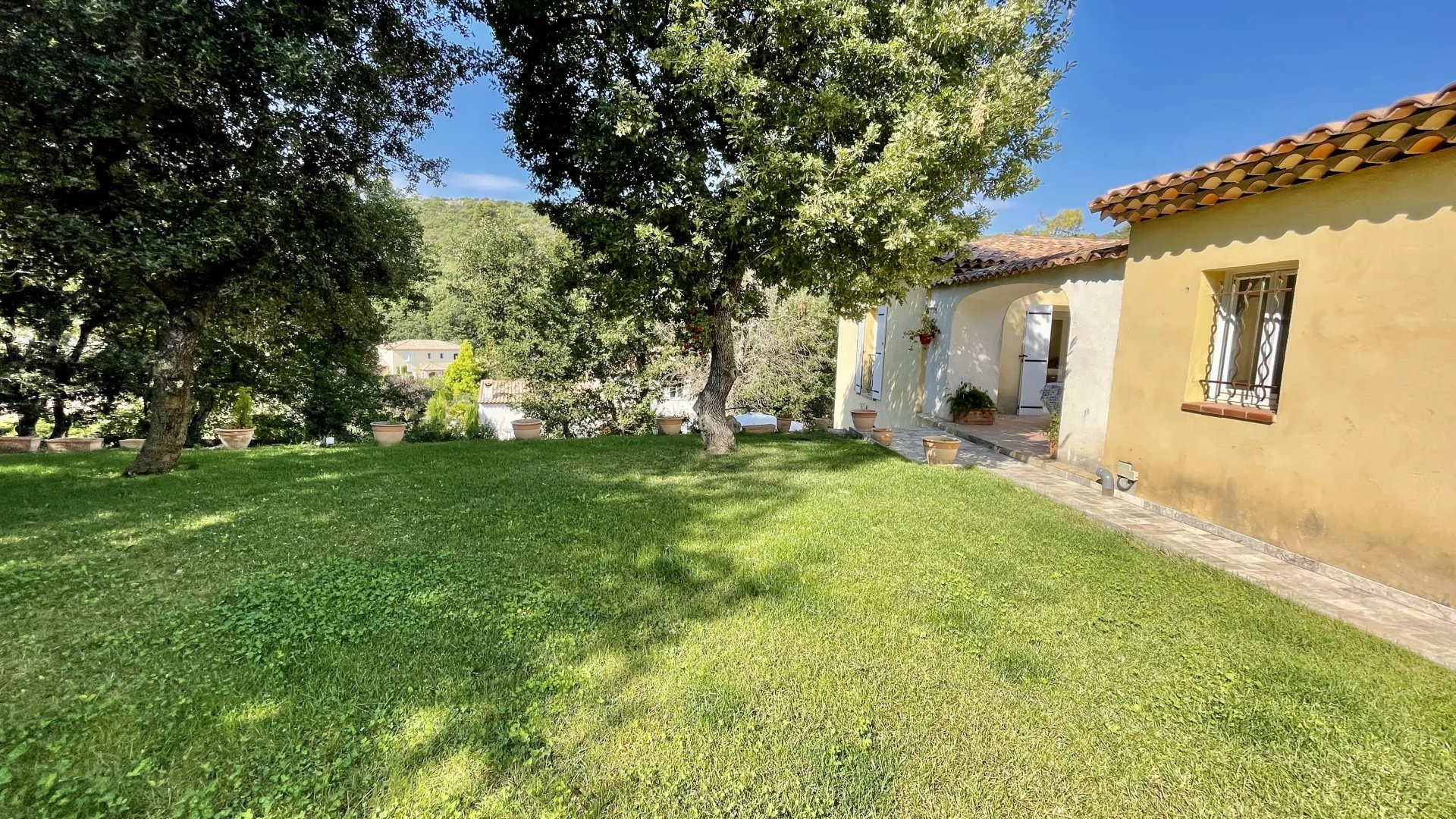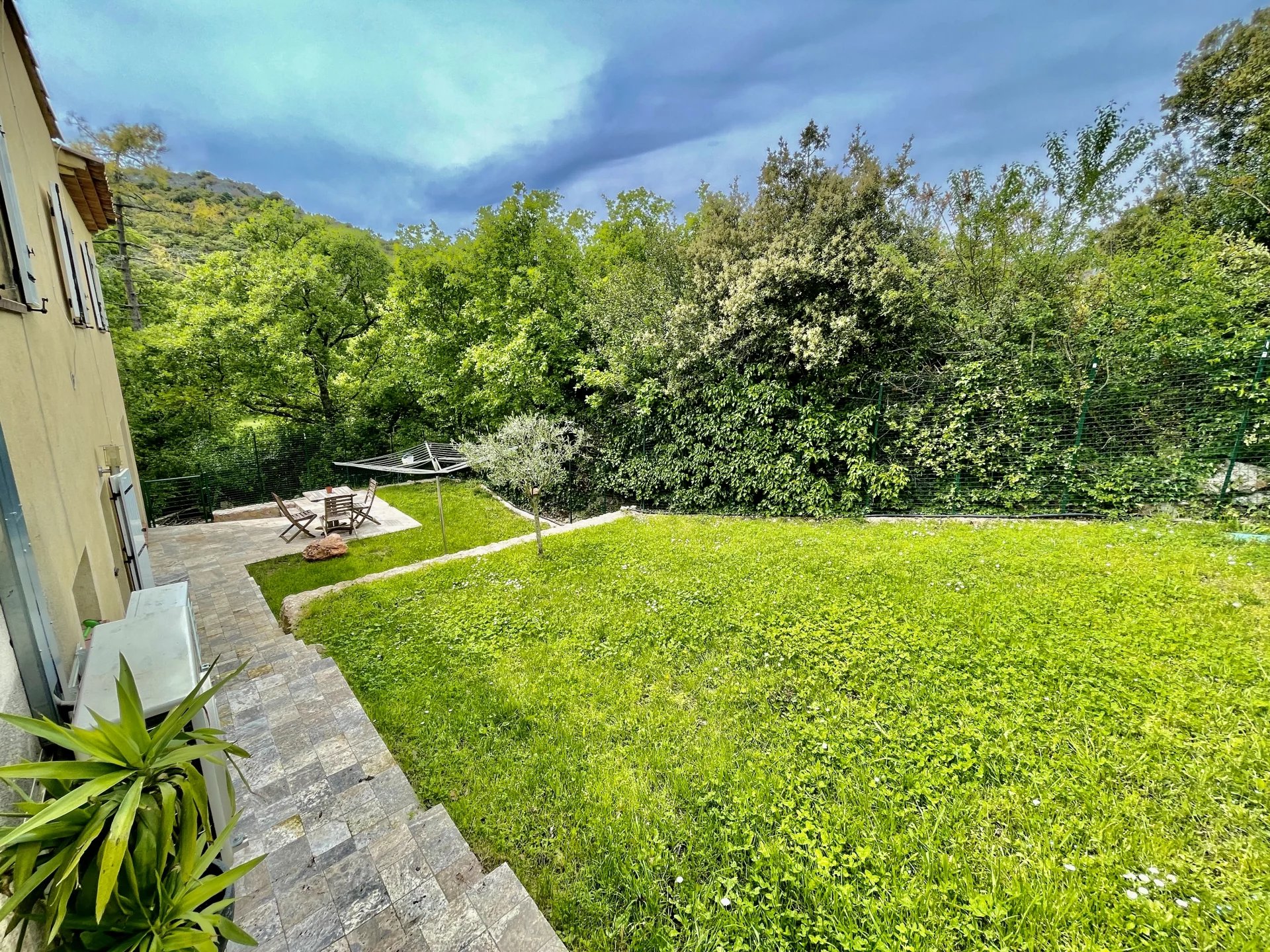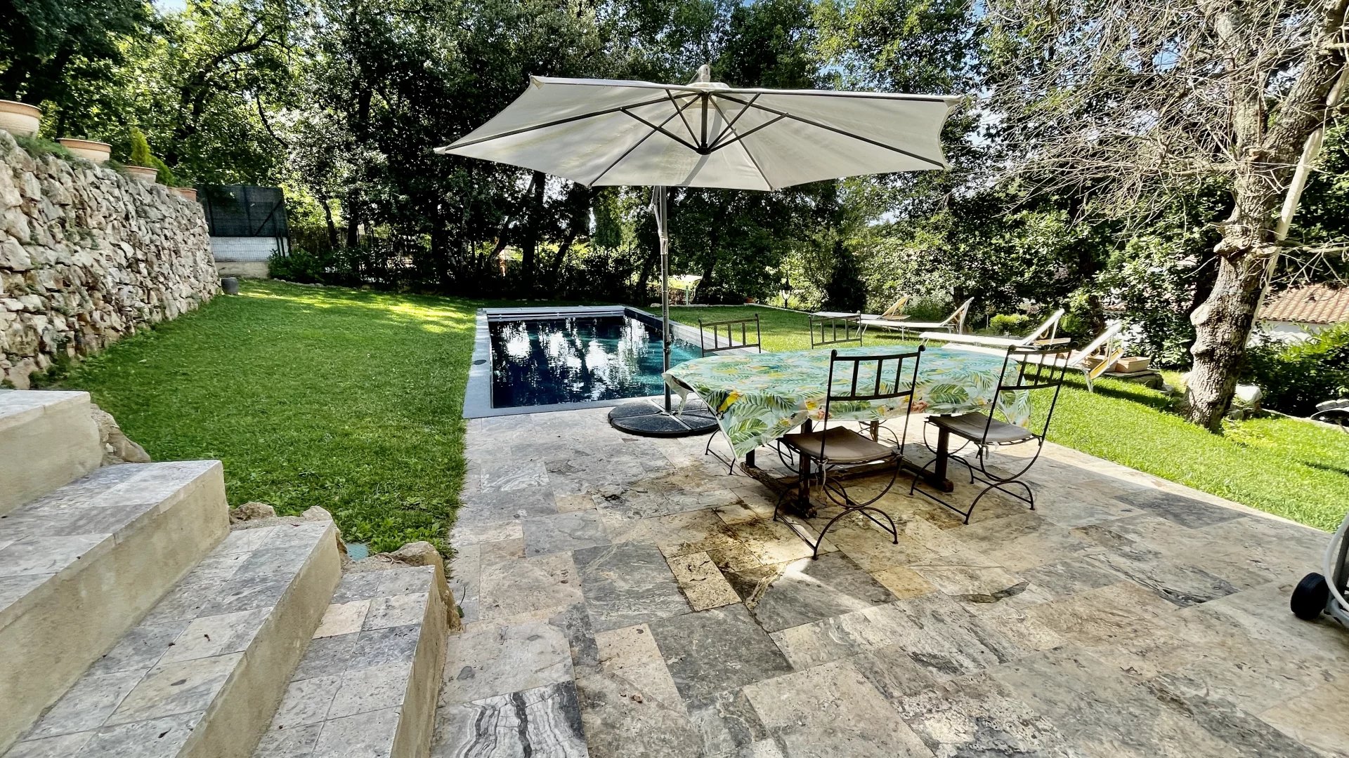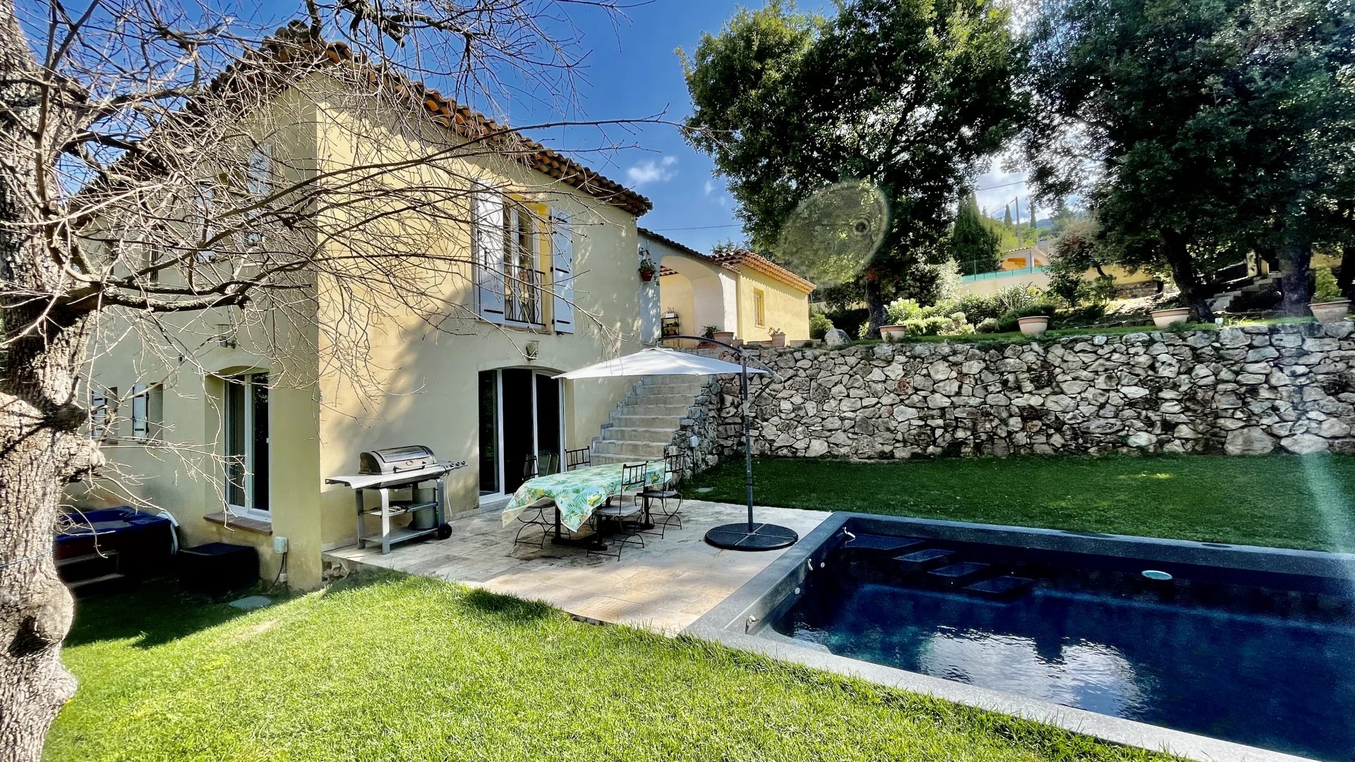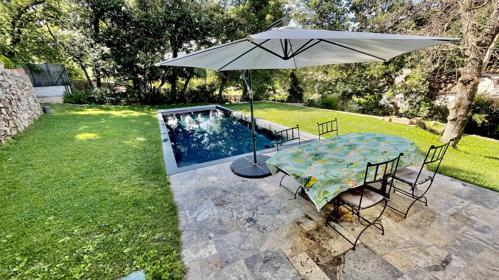 A l'extérieur, plusieurs jardins en restanques à larges parcelles pour un total de 2100M2 de terrain, offrant une belle exposition Sud-Ouest avec vue dégagée verdure et collines. Une piscine de 10m x 4m avec couverture automatique ainsi que 3 terrasses dont une en patio de 30m², un terrain de jeu, un poulailler, une grange complètent le bien.