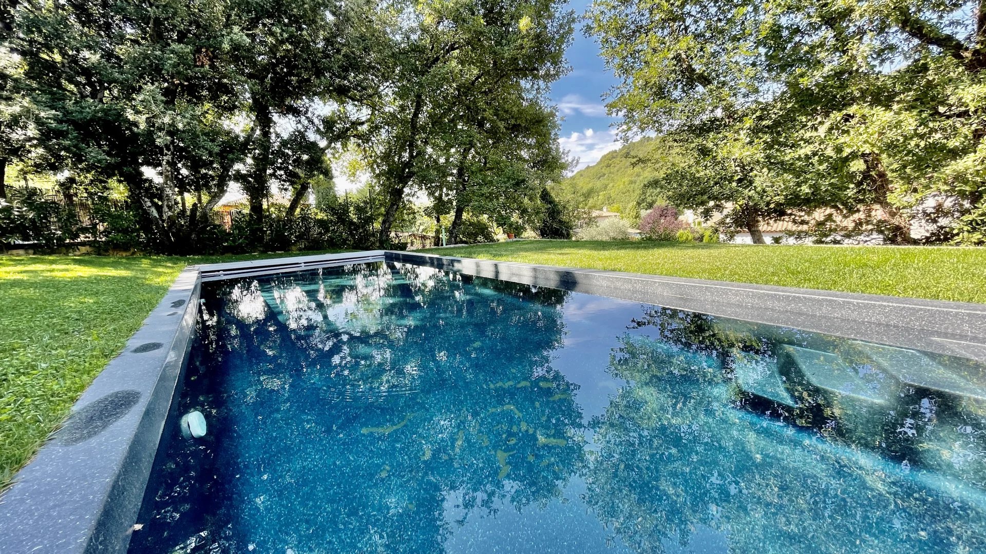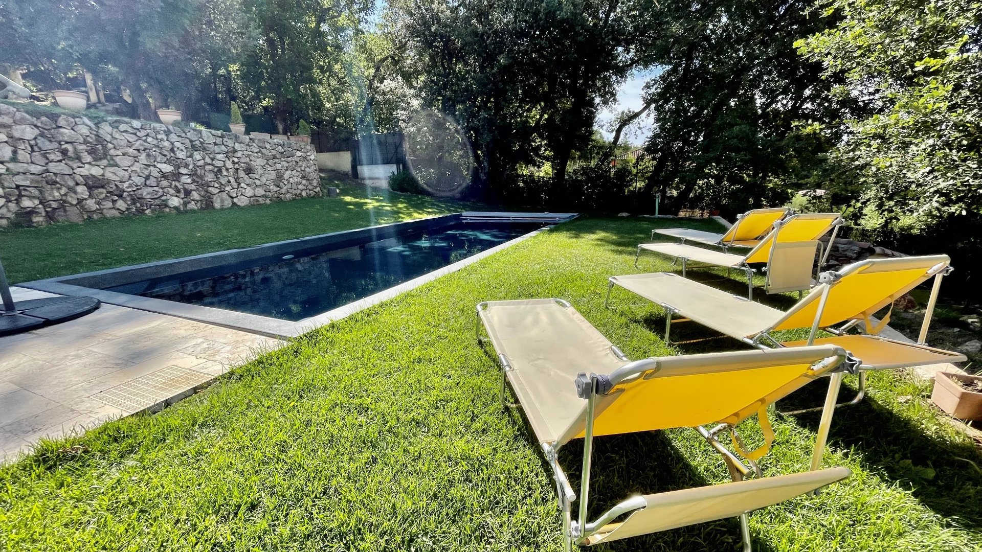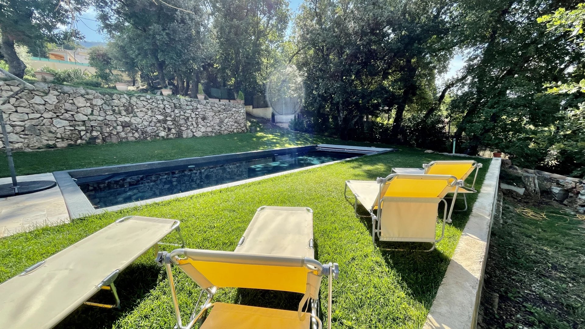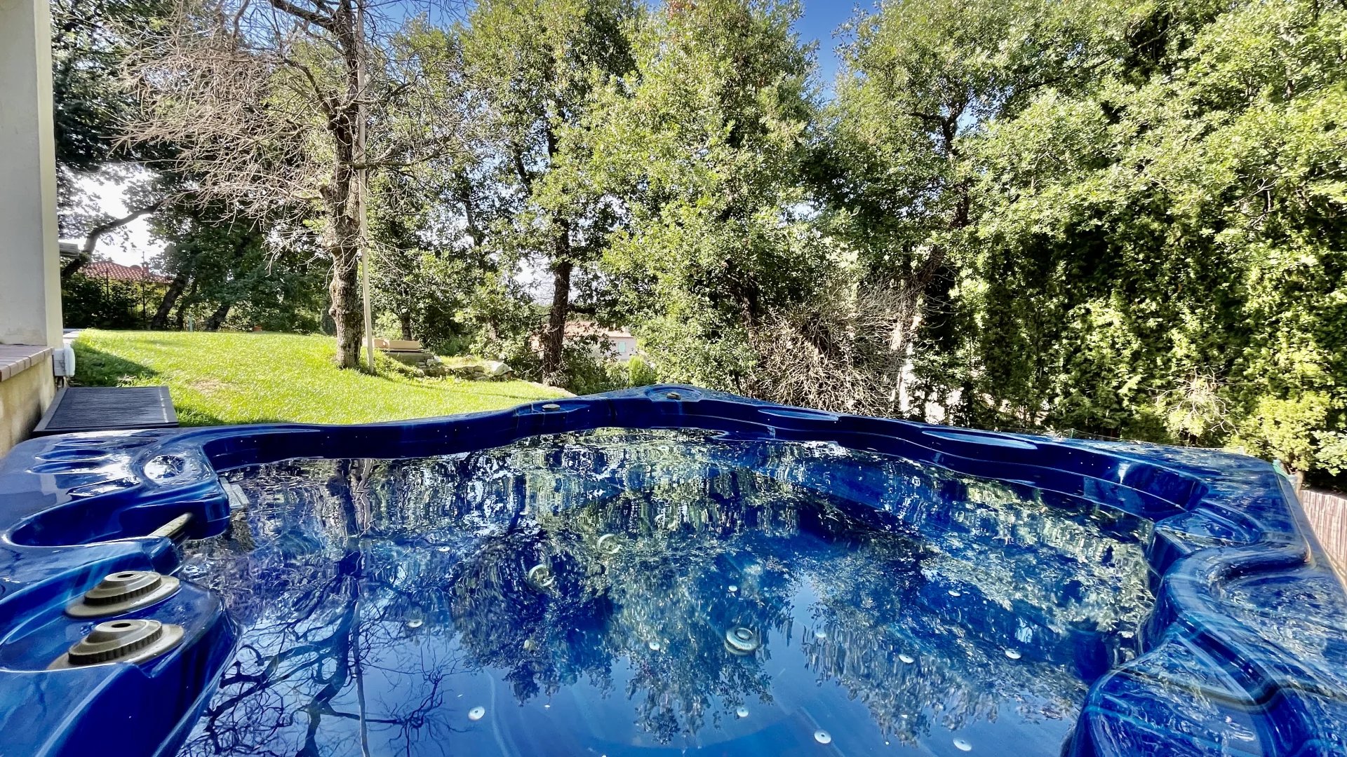 A l'extérieur, plusieurs jardins en restanques à larges parcelles pour un total de 2100M2 de terrain, offrant une belle exposition Sud-Ouest avec vue dégagée verdure et collines. Une piscine de 10m x 4m avec couverture automatique ainsi que 3 terrasses dont une en patio de 30m², un terrain de jeu, un poulailler, une grange complètent le bien.