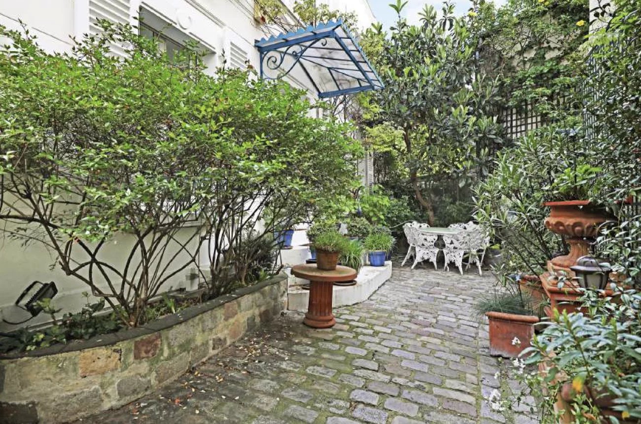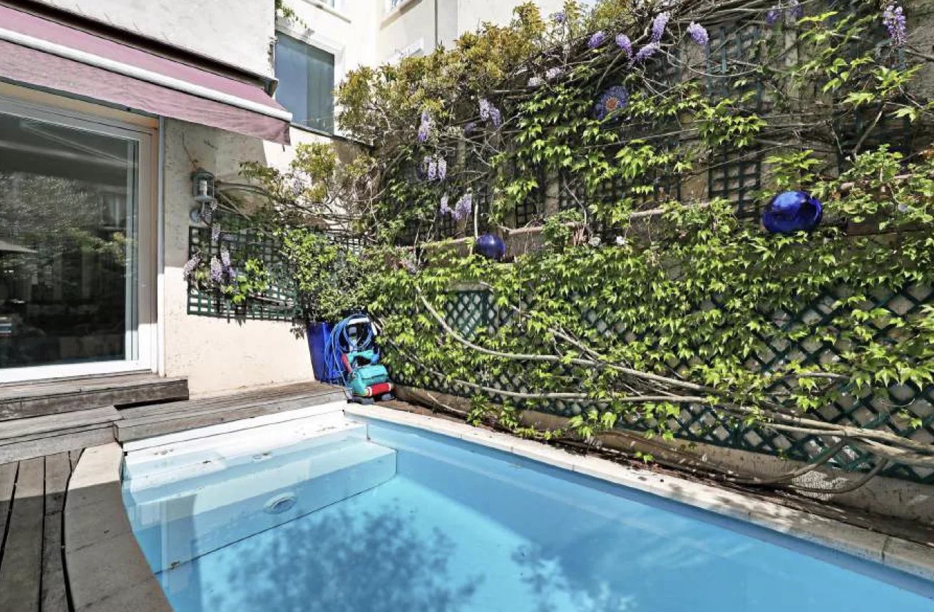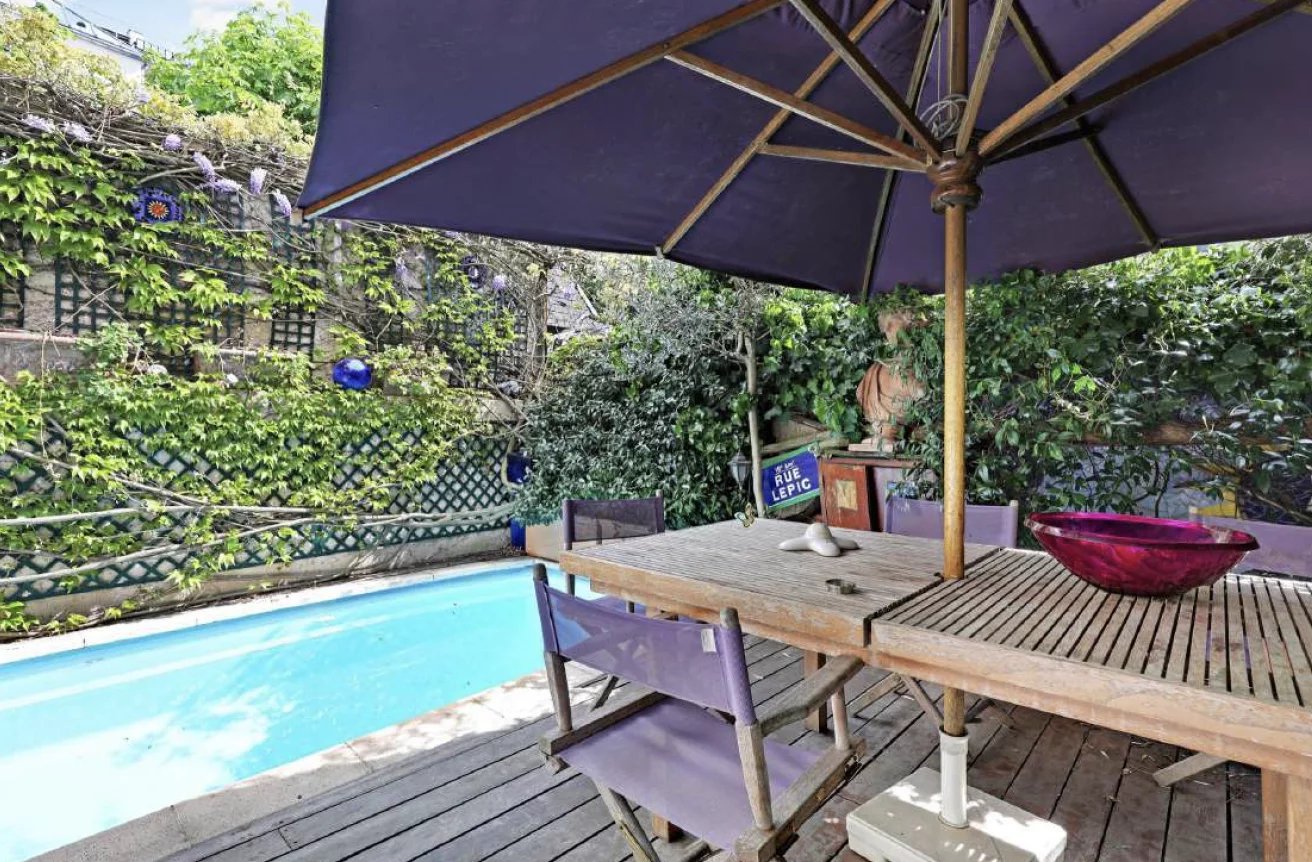 Cet hôtel particulier est niché dans le village Montmartre, au fond d’une petite ruelle. Il bénéficie de 2 agréables espaces extérieurs, un de chaque côté. Le jardin de derrière est exposé plein sud. Il est aménagé comme une terrasse arborée, avec une piscine de 3x5m.