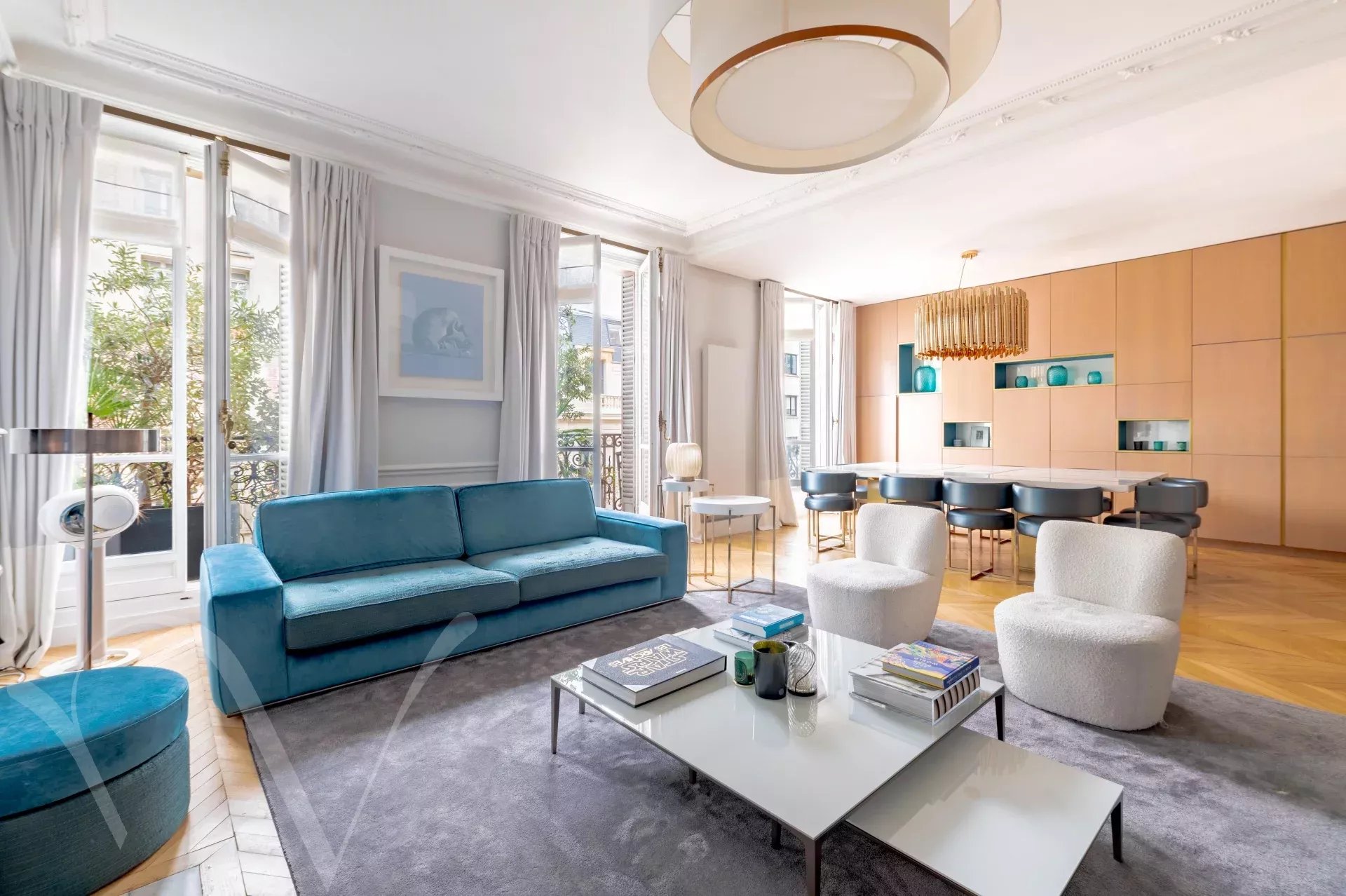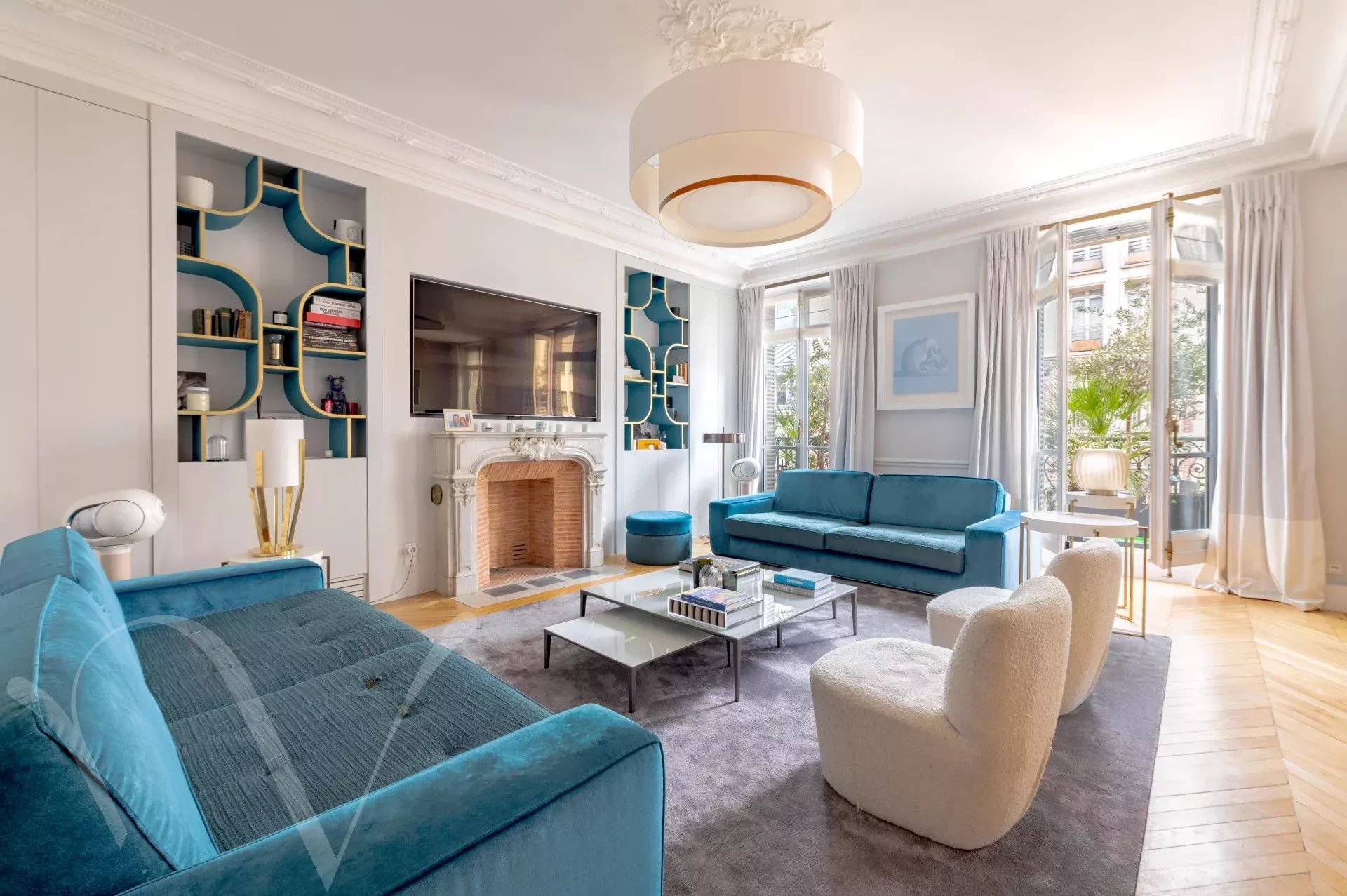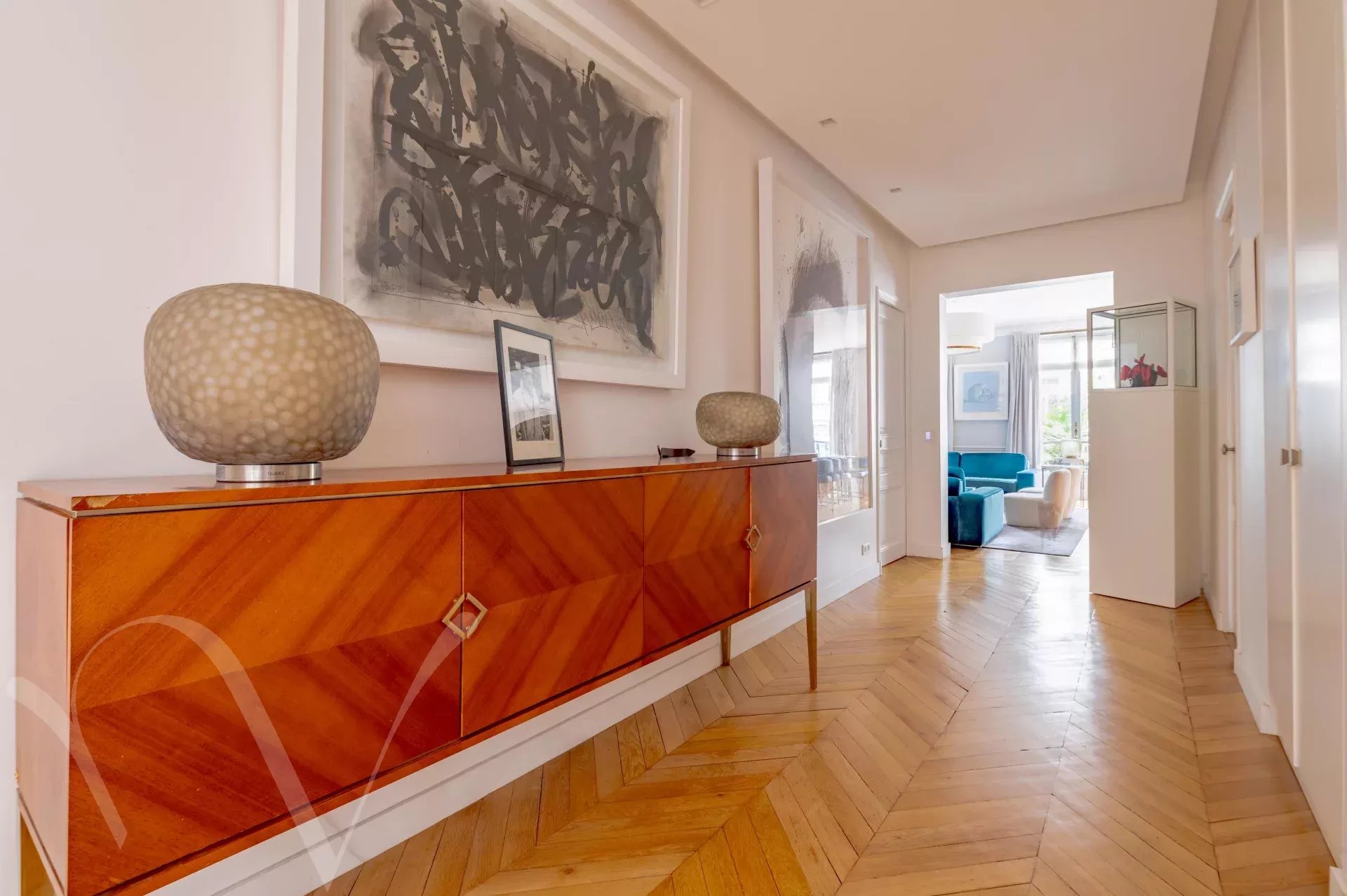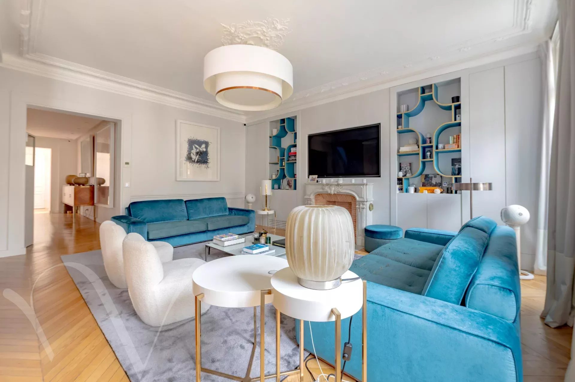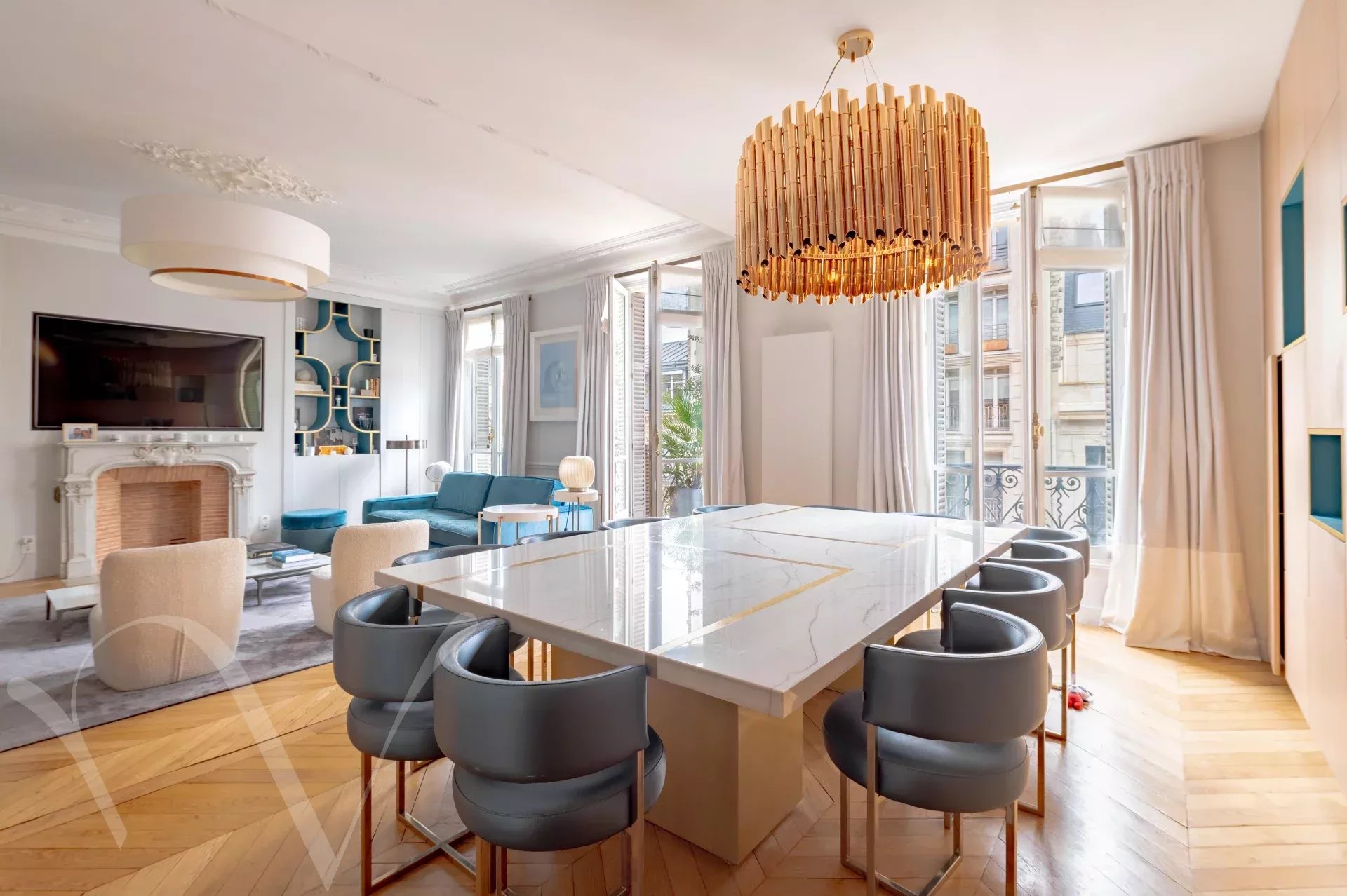 A deux pas du Parc Monceau, rue de Courcelles au 3e étage avec ascenseur d'un immeuble des années 1890, cet appartement de 196,14 m2 bénéficie d'une très belle rénovation. La domotique derniière génération gère ce lieu très agréable à vivre. Il comprend : Belle entrée avec dressing et WC invité, Une vaste pièce à vivre de 48,6m² avec balcon Cuisine entièrement équipée, Une master suite avec sa salle de bains, dressings Madame et Monsieur Une junior suite avec salle de bains et dressing Deux autres junior suites avec salle de douches et dressings attenants Une buanderie Parquet, cheminée et moulures - Porte blindée et sécurité (sous vidéo) Possibilité d'acquérir un emplacement de parking sous l'immeuble en sus du prix de l'appartement.