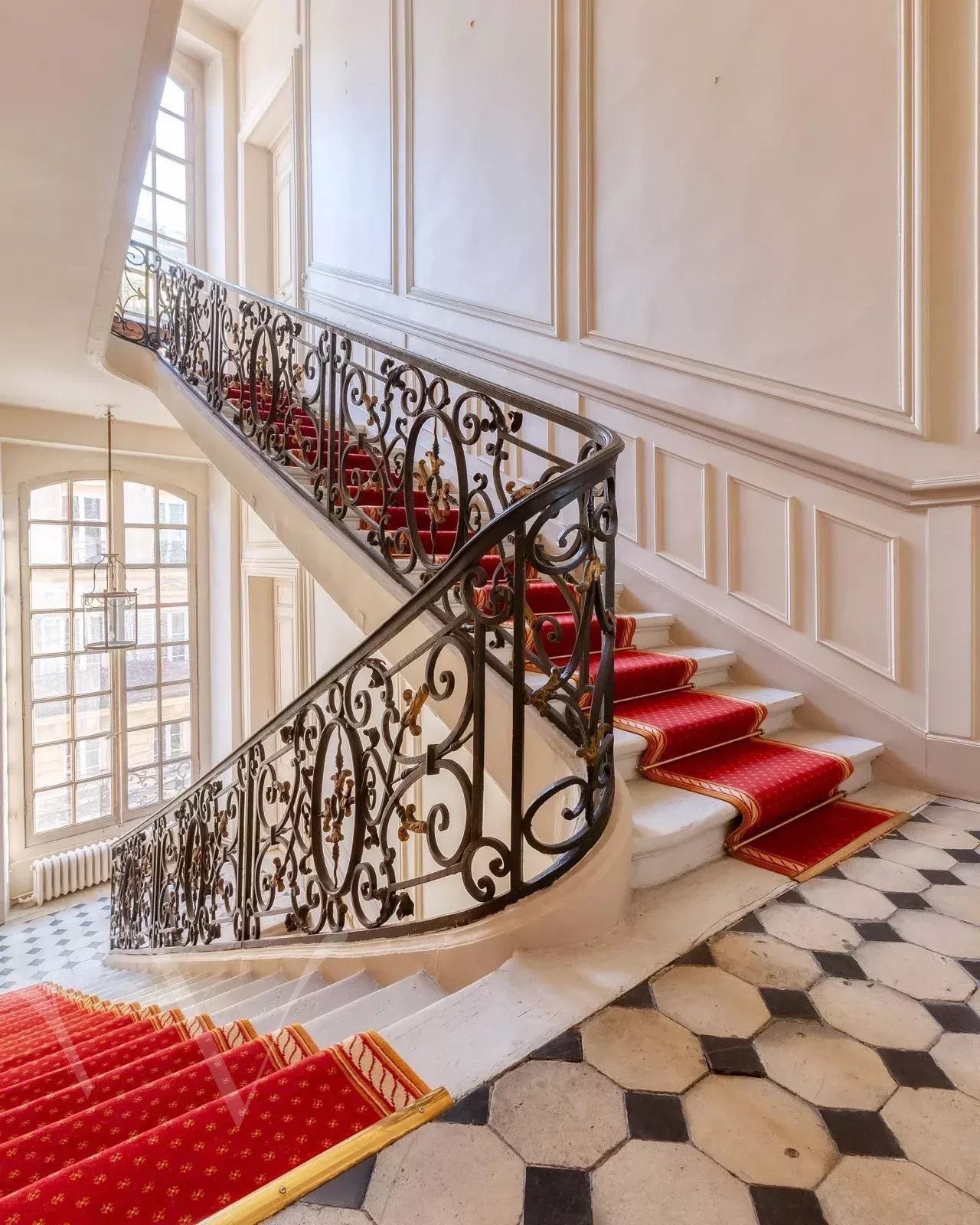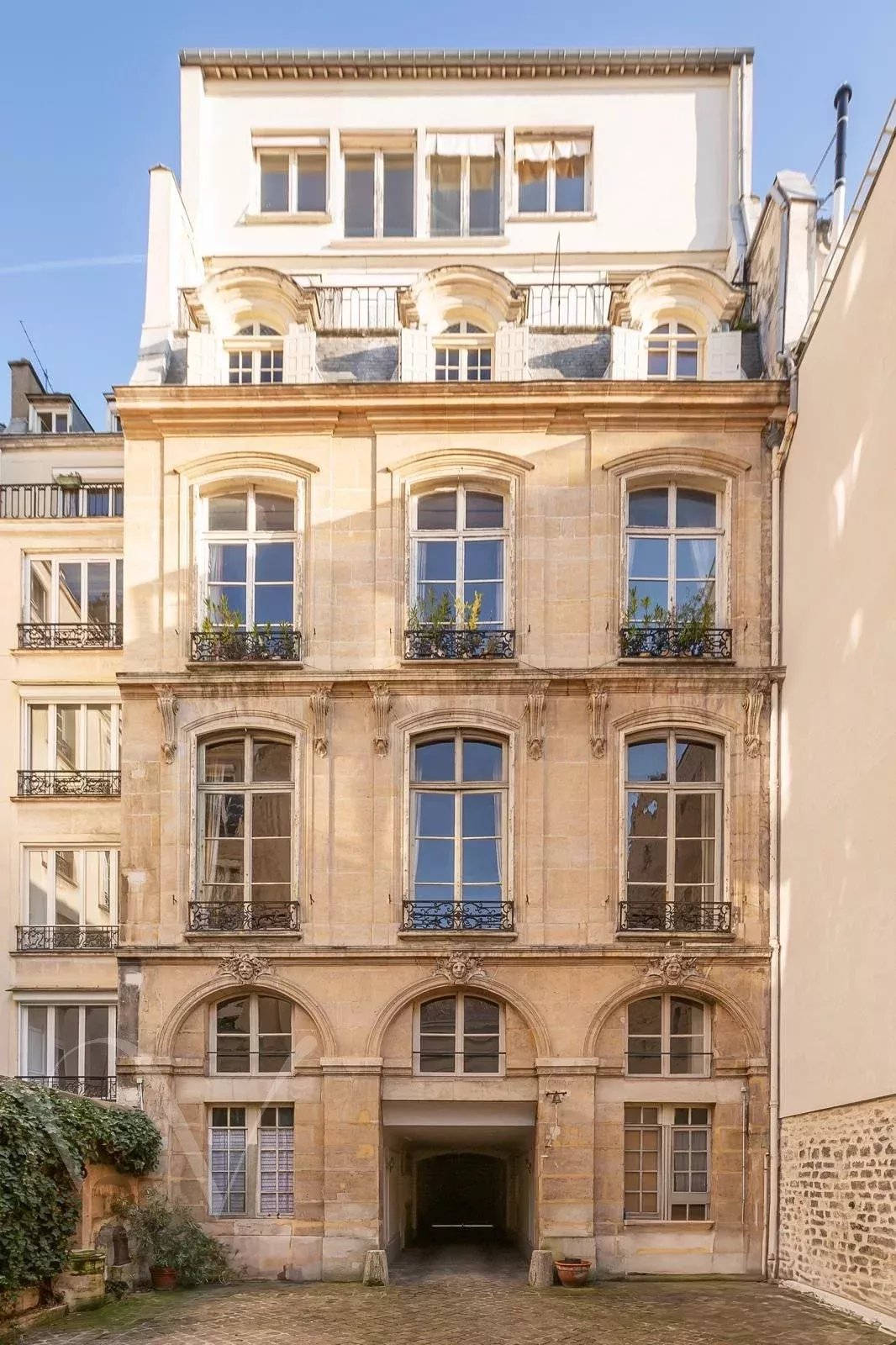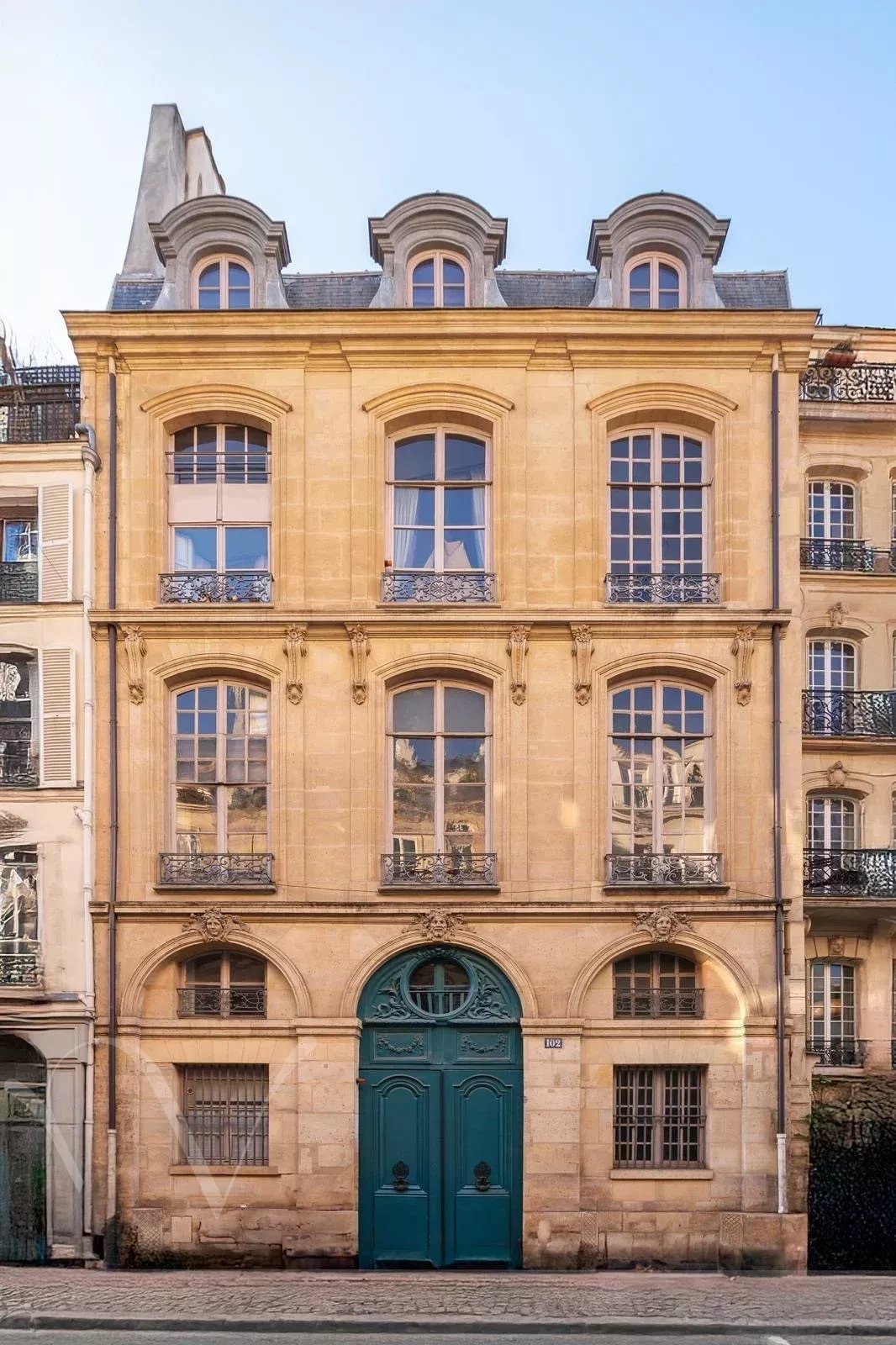 Hôtel Particulier édifié début du XVIIIe siècle, entre rue et cour. Il se distingue par son élégante façade sur rue. Il se compose d'un entresol et de 4 niveaux. Au dernier étage un atelier avec une vue superbe. Le rez-de-chaussée et l’entresol sont rythmés par trois arcades en plein cintre ornées de mascarons sculptés. Au premier étage, le grand salon conserve d’élégantes boiseries Louis XV, enrichies de peintures florales au-dessus des portes, de glaces encadrées de médaillons et de petits bustes féminins aux angles. Un boudoir aux boiseries Louis XVI complète cet étage, dont la disposition se retrouve à l’identique au niveau supérieur.