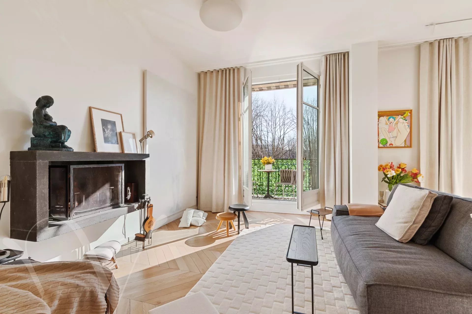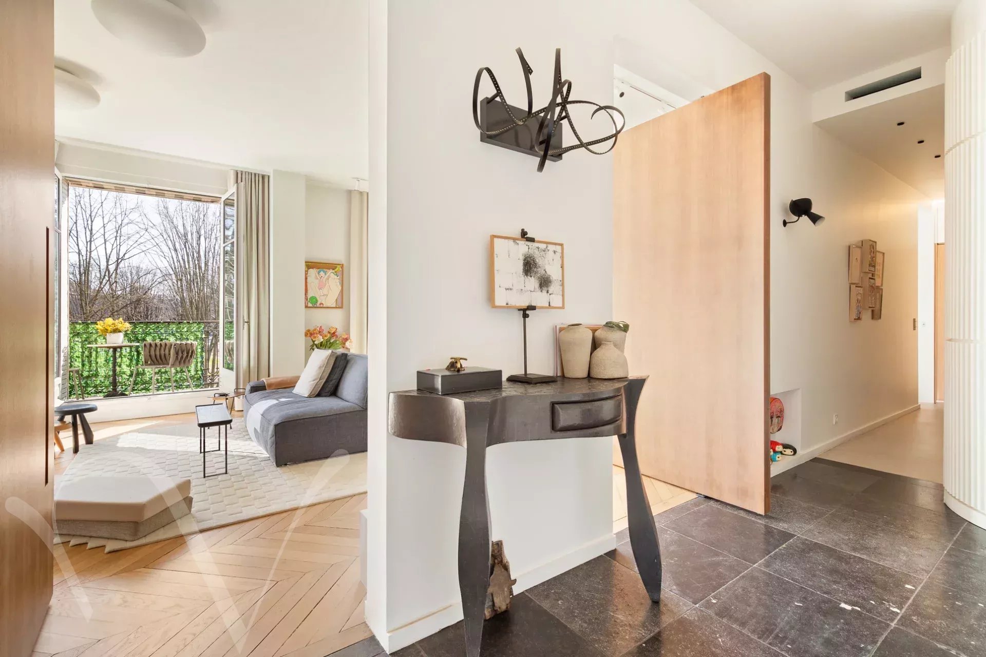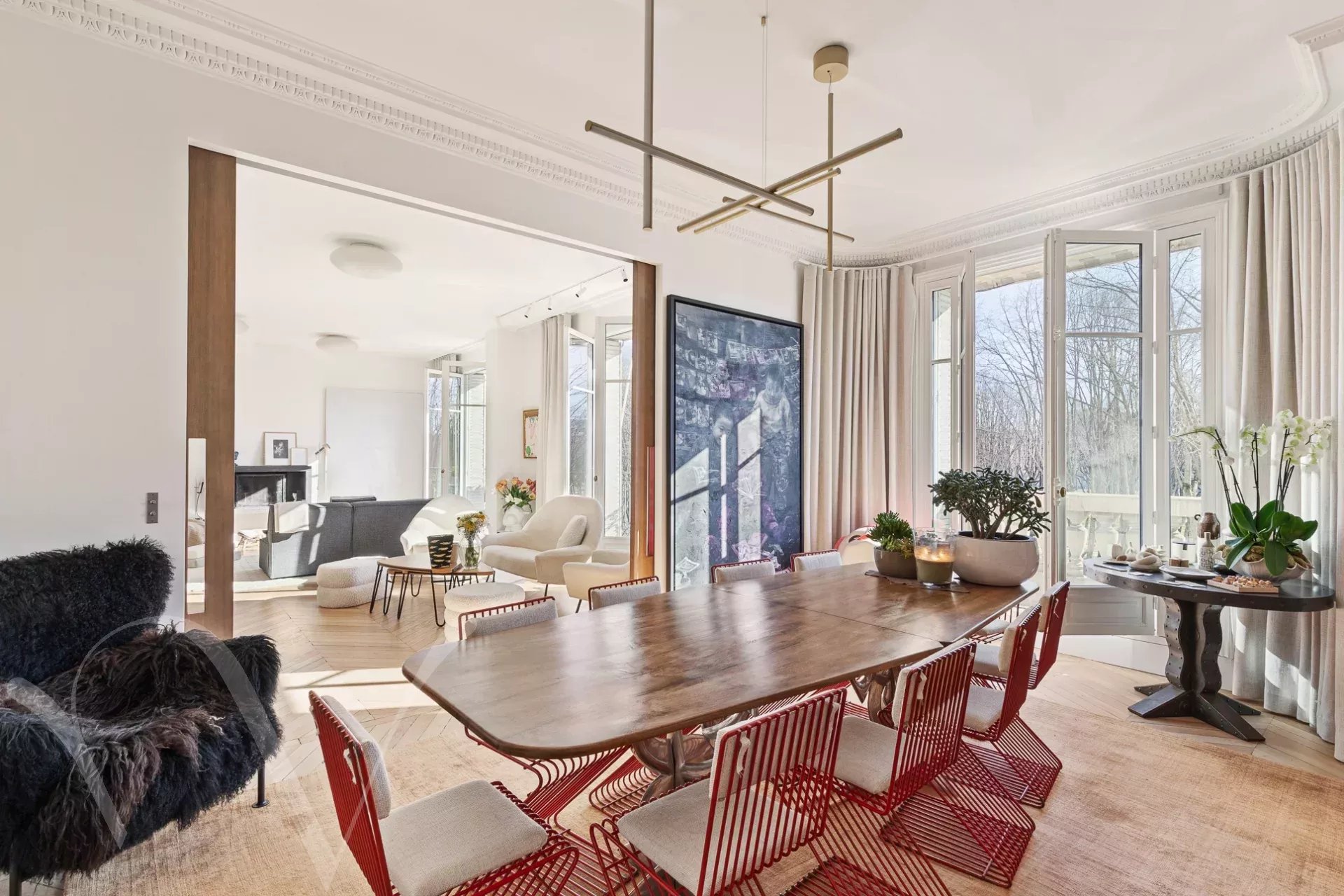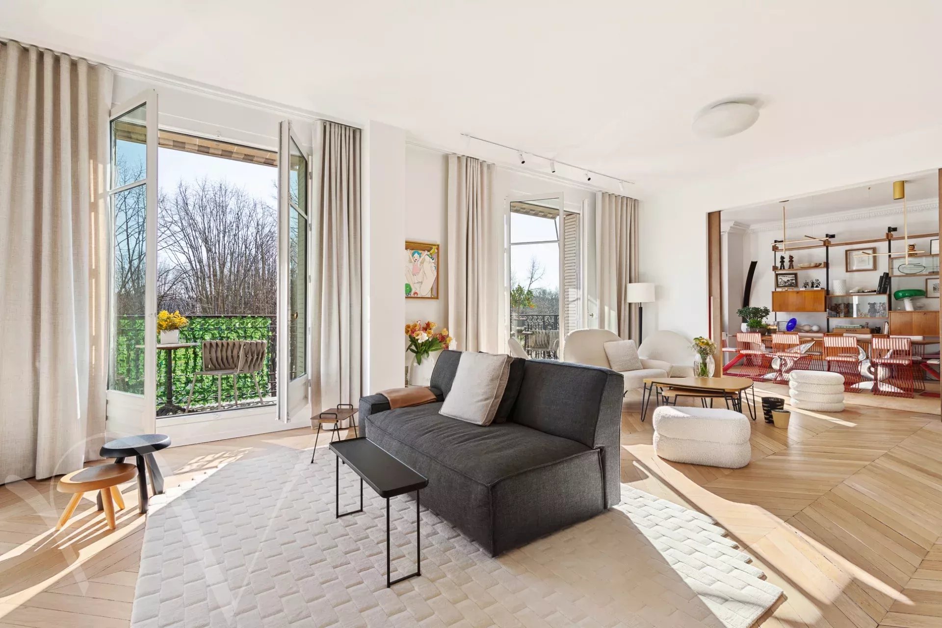 Ensoleillé et offrant de beaux volumes et une hauteur sous plafond de 3m10, l'appartement comprend une galerie d'entrée, et avec des vues ravissantes sur les arbres et l'Esplanade des Invalides : un grand salon avec balcon, une salle à manger, une chambre avec balcon, grand dressing et salle de bain, une chambre avec salle d'eau ; enfin sur cour : une grande troisième chambre avec salle d'eau, une cuisine aménagée proche de la salle à manger, et une buanderie.