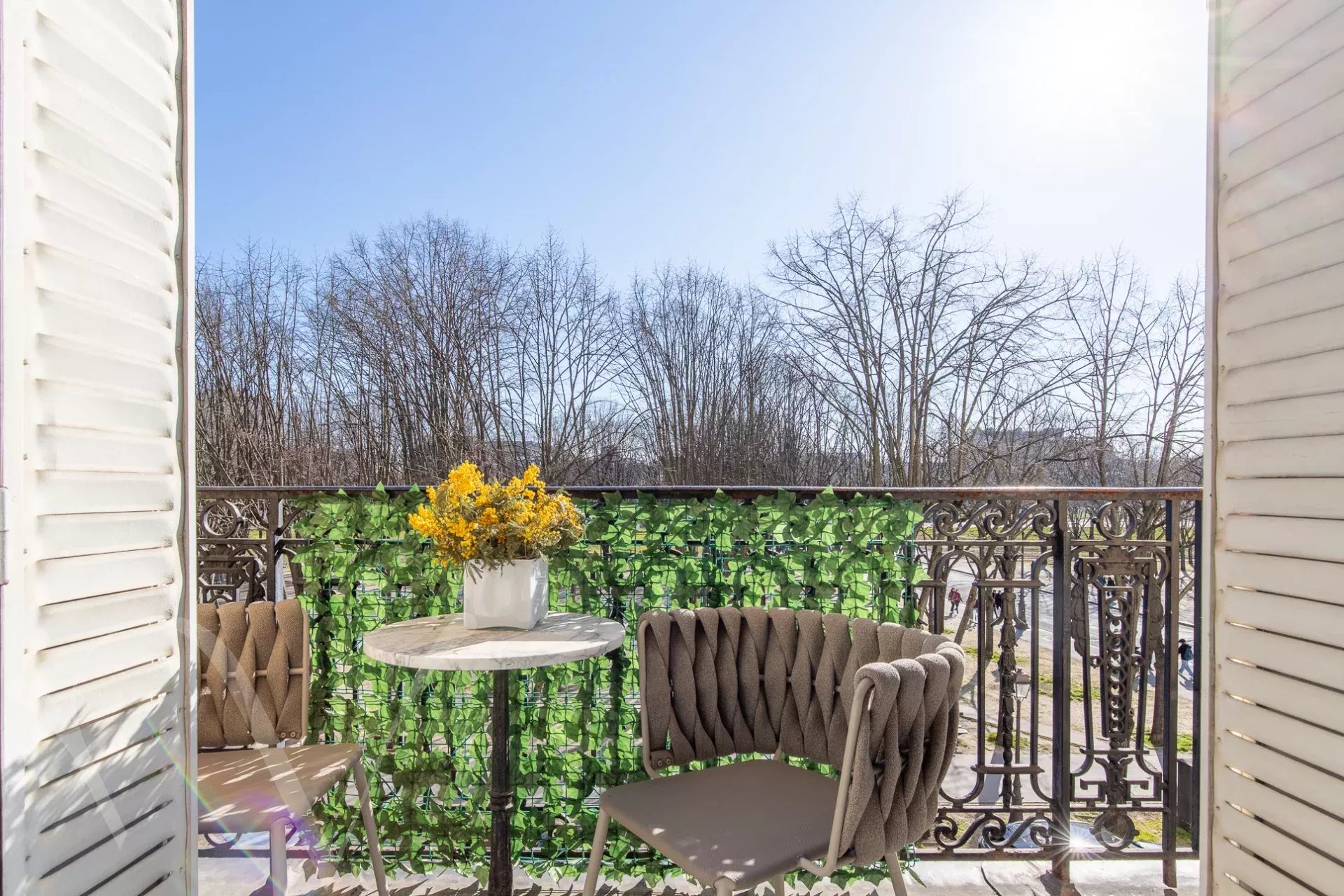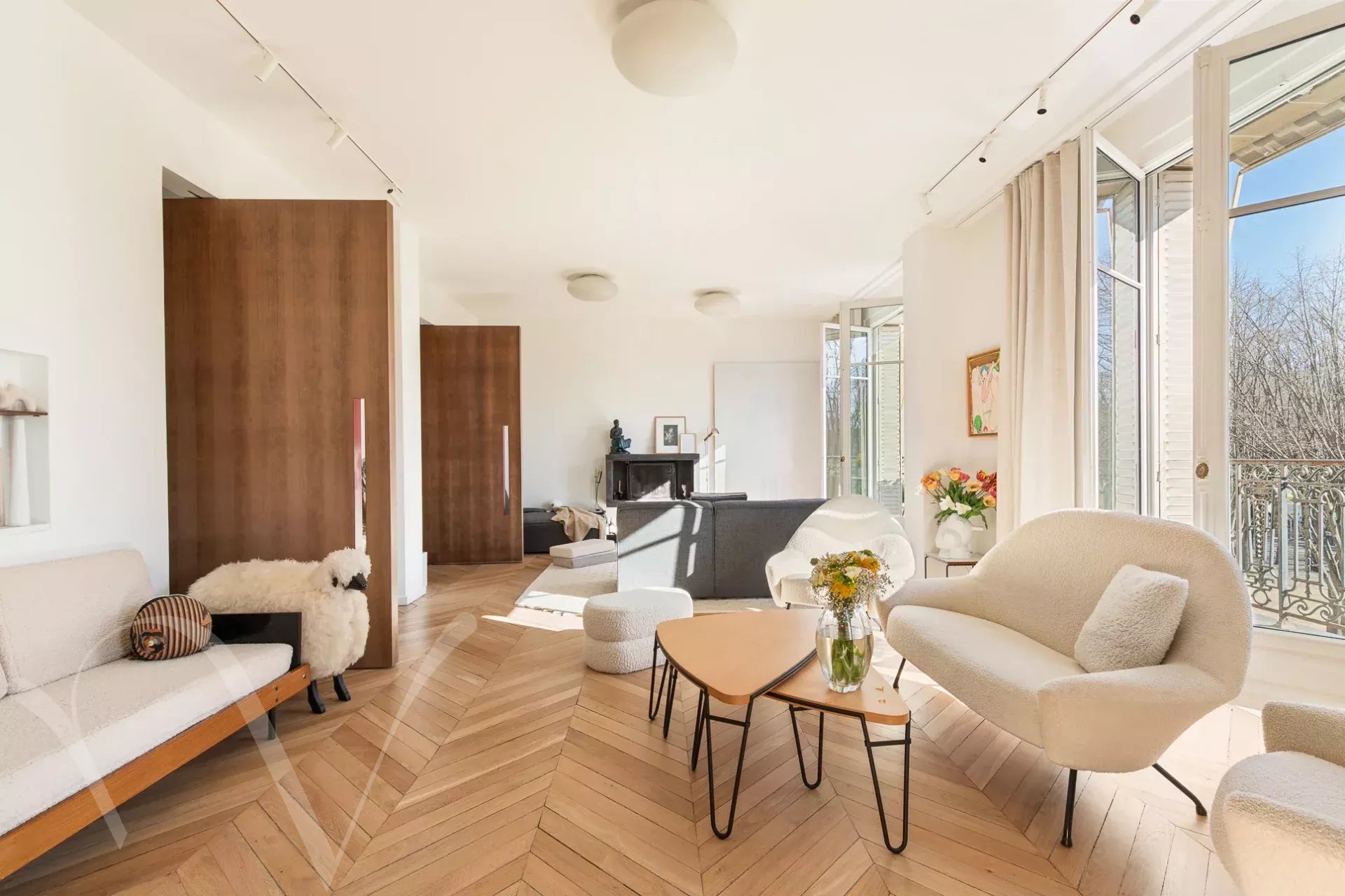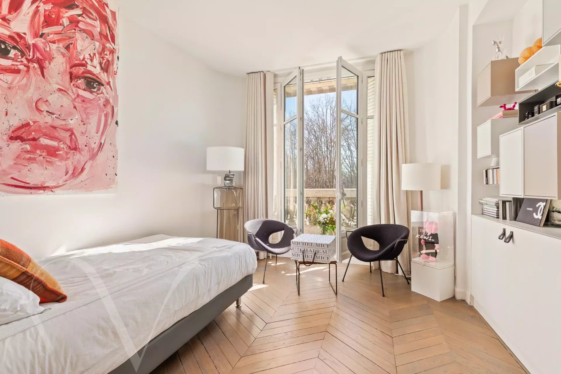 Ensoleillé et offrant de beaux volumes et une hauteur sous plafond de 3m10, l'appartement comprend une galerie d'entrée, et avec des vues ravissantes sur les arbres et l'Esplanade des Invalides : un grand salon avec balcon, une salle à manger, une chambre avec balcon, grand dressing et salle de bain, une chambre avec salle d'eau ; enfin sur cour : une grande troisième chambre avec salle d'eau, une cuisine aménagée proche de la salle à manger, et une buanderie.