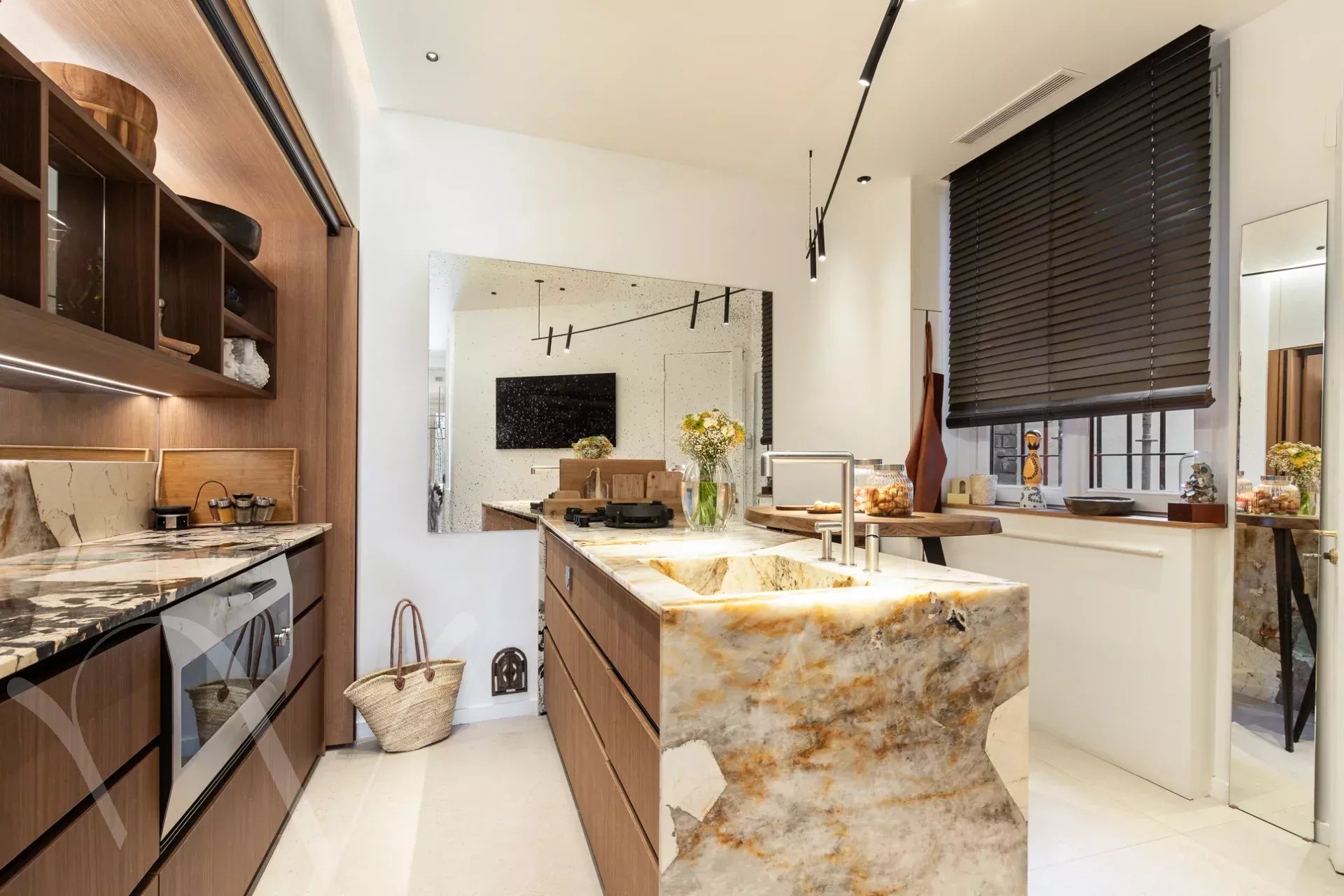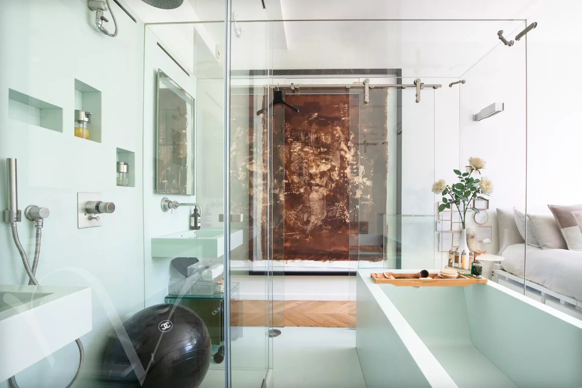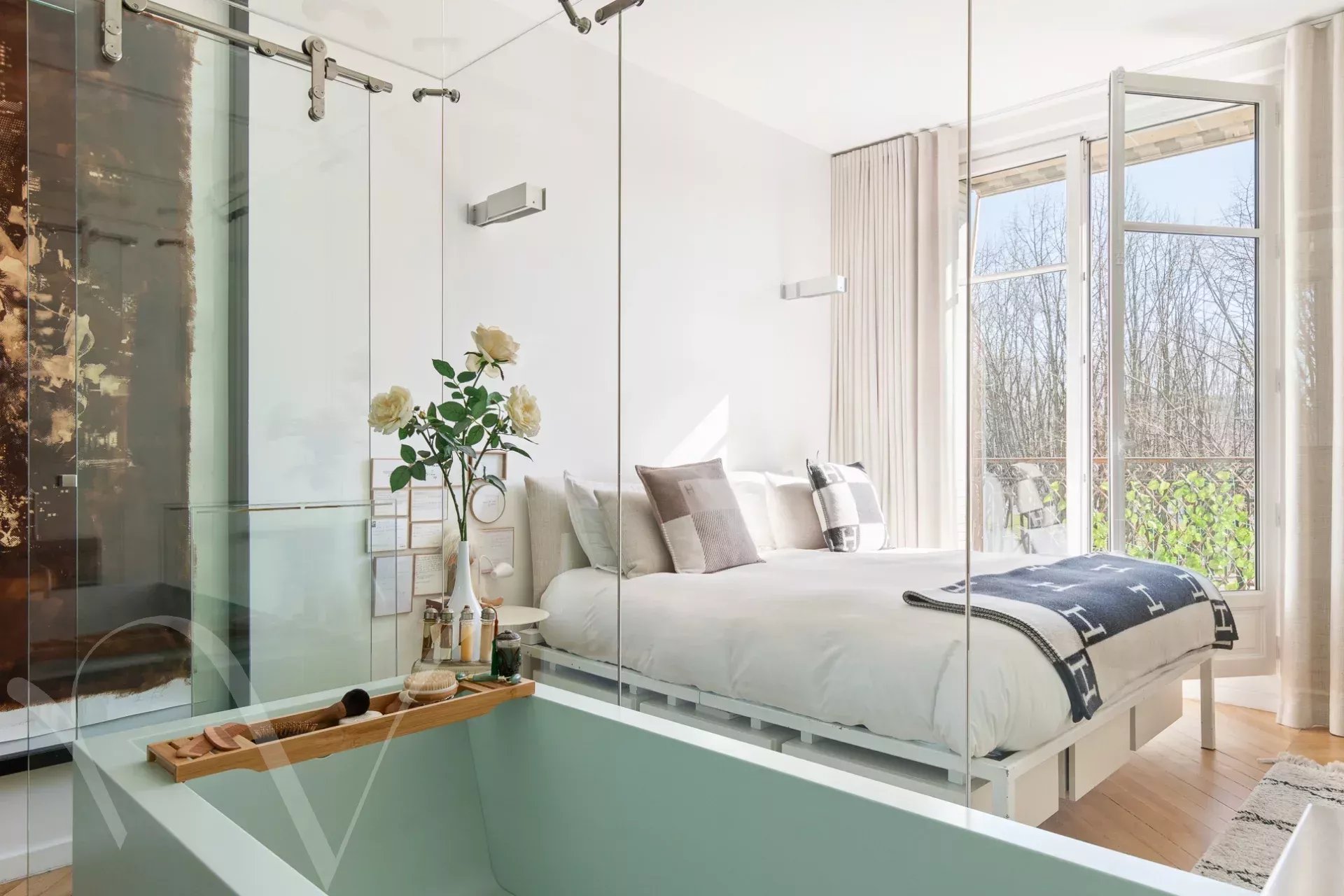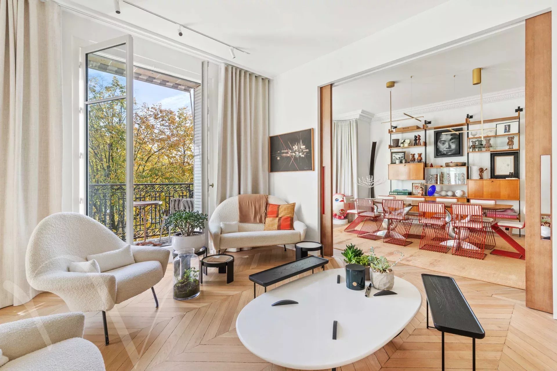 Ensoleillé et offrant de beaux volumes et une hauteur sous plafond de 3m10, l'appartement comprend une galerie d'entrée, et avec des vues ravissantes sur les arbres et l'Esplanade des Invalides : un grand salon avec balcon, une salle à manger, une chambre avec balcon, grand dressing et salle de bain, une chambre avec salle d'eau ; enfin sur cour : une grande troisième chambre avec salle d'eau, une cuisine aménagée proche de la salle à manger, et une buanderie.