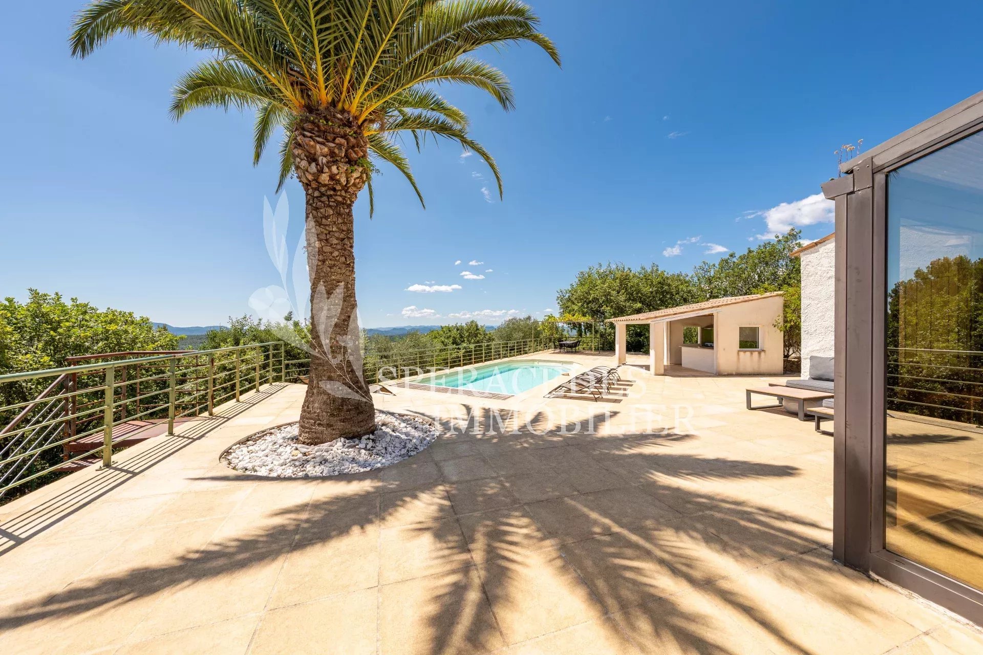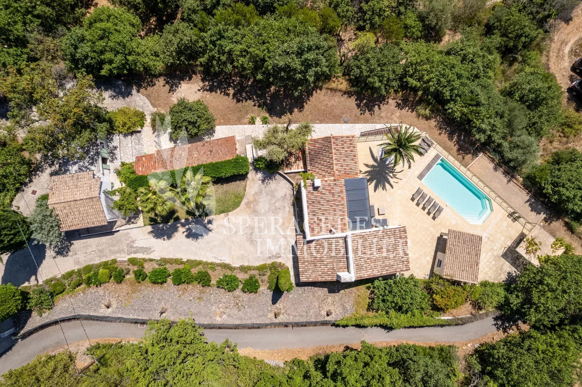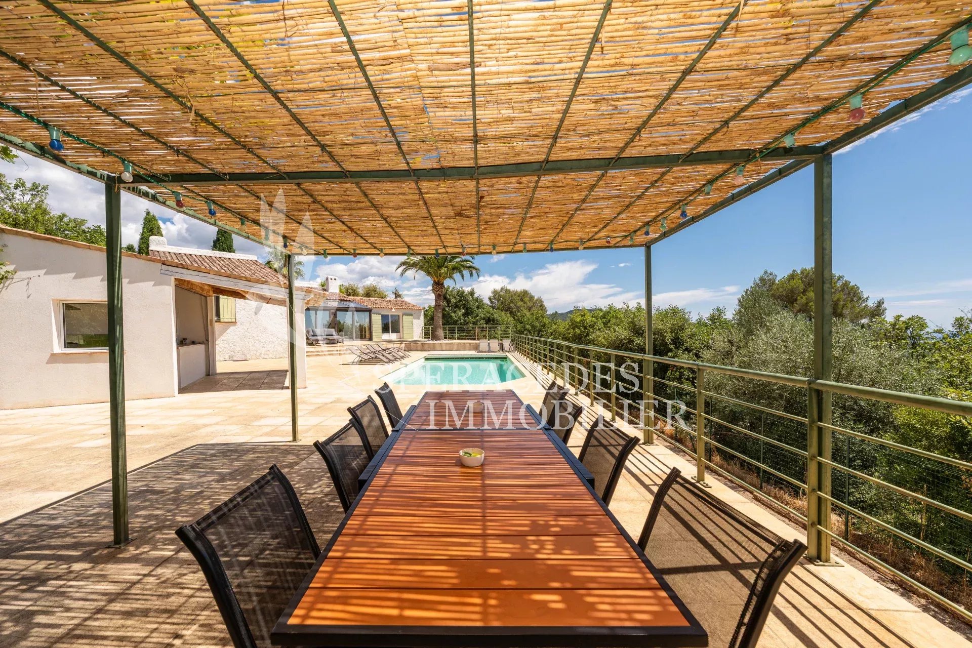 Saint-Cézaire-sur Siagne, en Exclusivité magnifique maison, édifiée sur un terrain plat d'environ 3 000m². Elle se situe dans un quartier calme et prisé à seulement quelques minutes du village. Une villa principale de plain-pied composée d’une entrée, un grand salon, salle à manger, une cuisine et deux chambres avec leur salle de bains respective. L’ensemble des pièces donne sur une magnifique terrasse exposée sud. En contrebas, une chambre indépendante, avec une grande salle de bains. Une dépendance proposant deux suites individuelles. (Idéal pour une chambre d’hôte ou du Airbnb). À l’extérieur, un espace piscine avec une vaste terrasse comprenant un pool house et une pergola, le tout offrant une superbe vue panoramique à 180° sur les collines ainsi qu’un bel aperçu mer. Pour compléter ce bien, une vaste allée arborée, plusieurs places de stationnement, un double garage, un atelier, une laverie et un terrain de pétanque Coup de cœur assuré pour cette propriété au calme absolu.