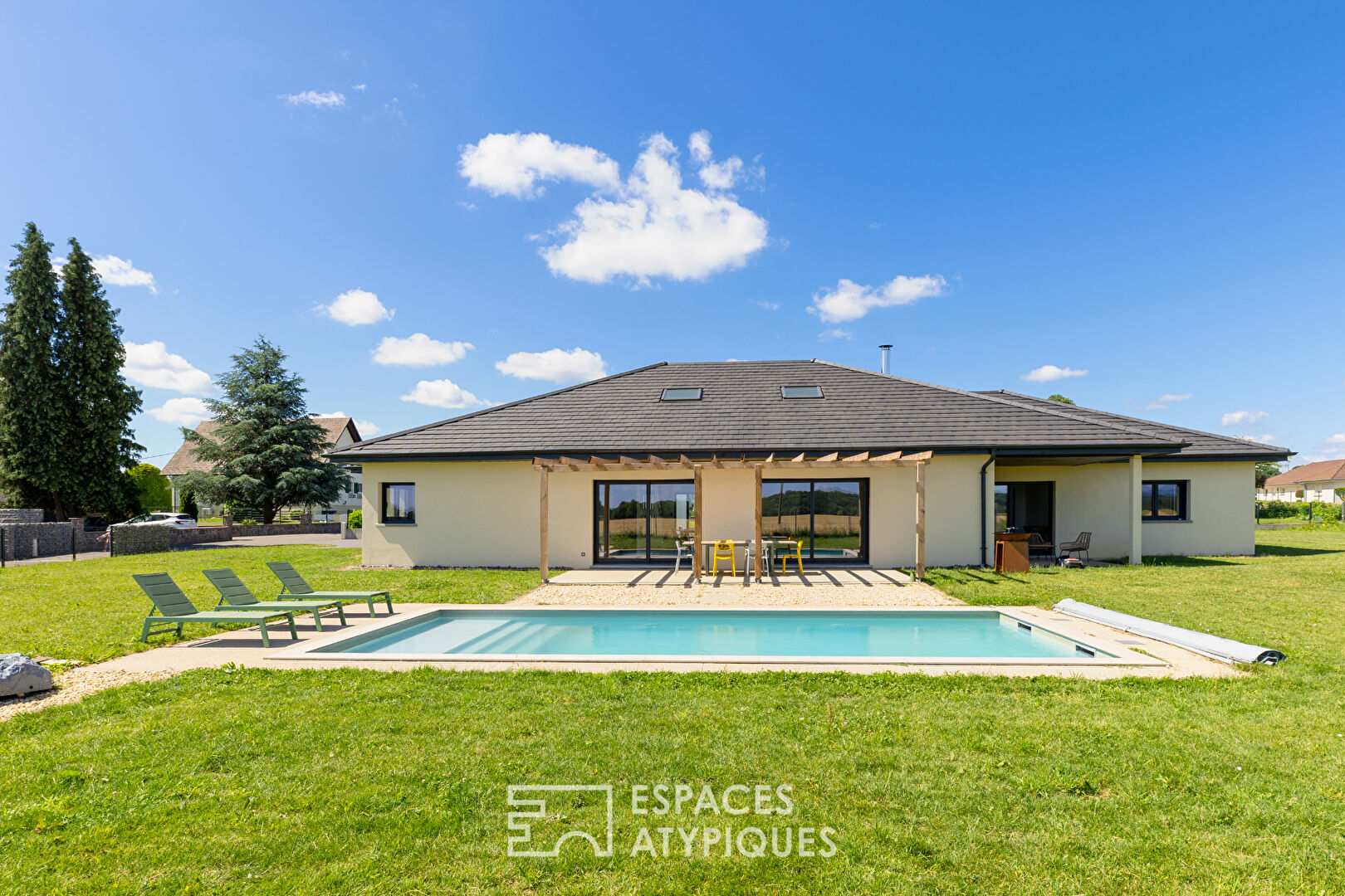 Située à la lisière d'une zone champêtre avec vue sur les Vosges, cette maison contemporaine de 296 m² séduit par ses volumes généreux et son environnement privilégié. Son agencement permet une véritable vie de plain-pied, avec l'ensemble des pièces principales réunies au rez-de-chaussée. Récente et soigneusement conçue, elle associe lignes épurées, volumes ouverts et lumière naturelle. Le sol en béton ciré ainsi que la très belle cheminée suspendue soulignent son caractère résolument moderne, tandis que la grande pièce à vivre, ouverte sur l'extérieur par de larges baies vitrées, s'harmonise parfaitement avec la piscine et le jardin avec vue dégagée. L'entrée mène à un double séjour baigné de lumière, prolongé par une cuisine ouverte pensée pour les moments de partage. L'espace nuit comprend quatre chambres, dont une suite parentale avec double dressing et salle de bain privative. Une seconde salle de bain, ainsi qu'un dressing desservant deux chambres, apportent confort et praticité au quotidien. A l'étage, une vaste pièce ouverte offre un espace modulable, idéal pour un bureau, une salle de jeux ou un espace détente. Côté fonctionnalité, un double garage avec accès direct à la buanderie, deux terrasses et une cour prolongent le confort de vie au quotidien. Son emplacement offre un parfait équilibre entre cadre paisible et proximité des services, pour une vie confortable au quotidien. CLASSE ENERGIE : A / CLASSE CLIMAT : A Montant moyen estimé des dépenses annuelles d'énergie pour un usage standard, établi à partir des prix moyens des énergies indexés sur les années 2021, 2022, 2023 (abonnements compris) : entre 1 170 et 1 650 euros Contact : Morgane 06.08.52.12.02 Morgane SCHLATTER (EI) Agent Commercial - Numéro RSAC : 930539382 - MULHOUSE.