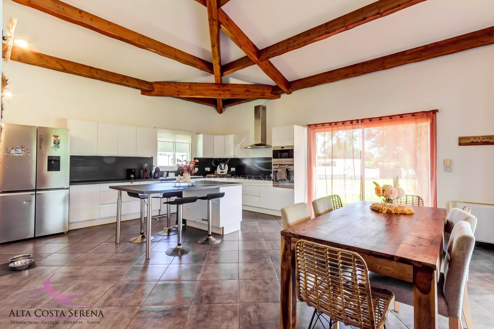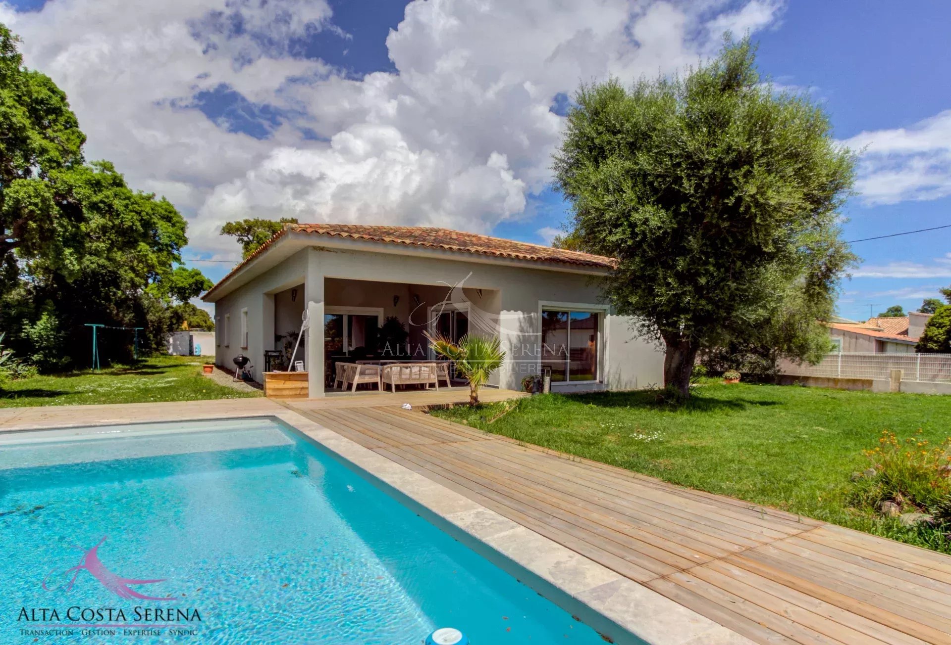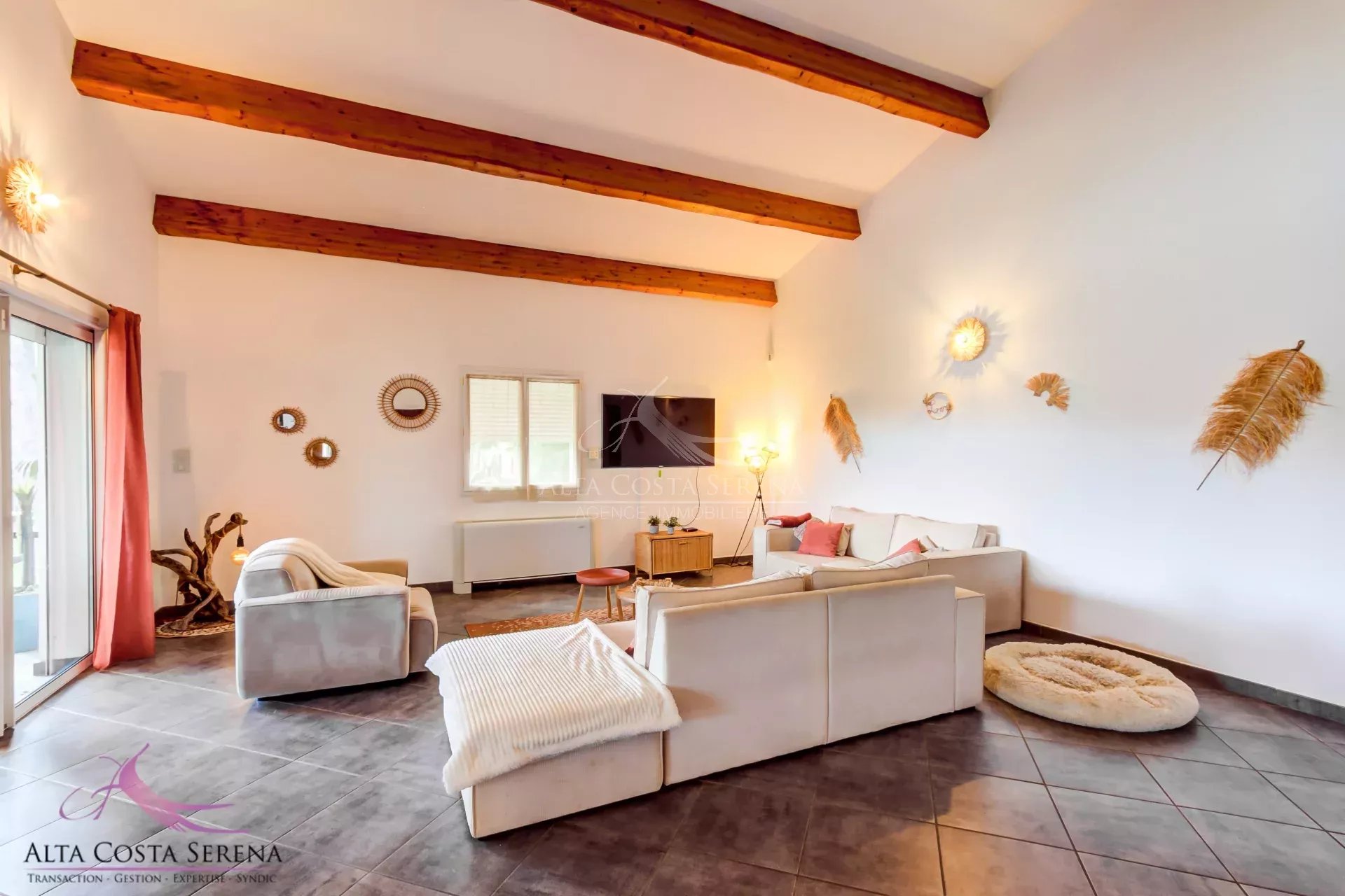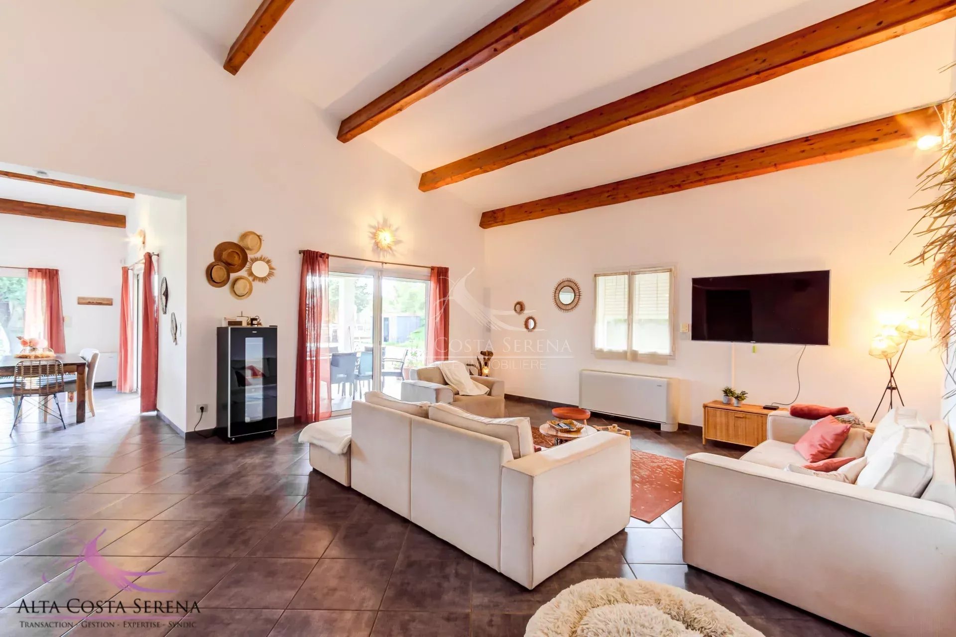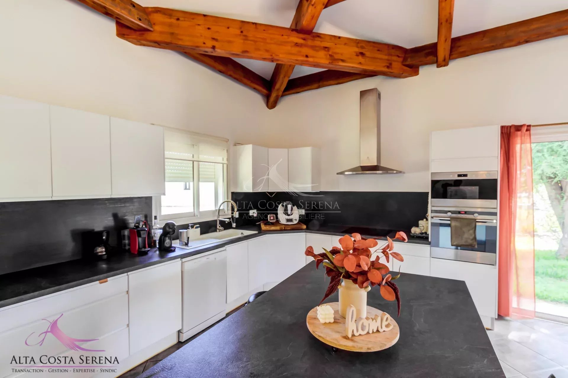 Très belle maison contemporaine de 169 m² habitables environ, de plain pied, située dans un quartier calme et agréable. Cette villa totalement rénovée en 2012 dévoile de beaux volumes et une grande hauteur sous plafond (plafond cathédrale). Un très grand espace cuisine salle à manger et un beau salon vous offrent un espace de vie très lumineux. La partie nuit est composée de 4 chambres dont trois sont équipées de salle d'eau et/ou de bains avec WC. Très fonctionnelle, elle est équipée d'une pompe à chaleur de 2021, d'un portail électrique dont le moteur a été changé en 2022, de très belles ouvertures à galandage et d'un terrain plat de 1696 m² clôturé et constructible pour une annexe ou un garage. Une piscine au sel chauffée vous permettra de profiter de beaux moments en plein air. A proximité de toutes les commodités (commerces, écoles, services de santé), la mer est a 3 minutes en voiture.